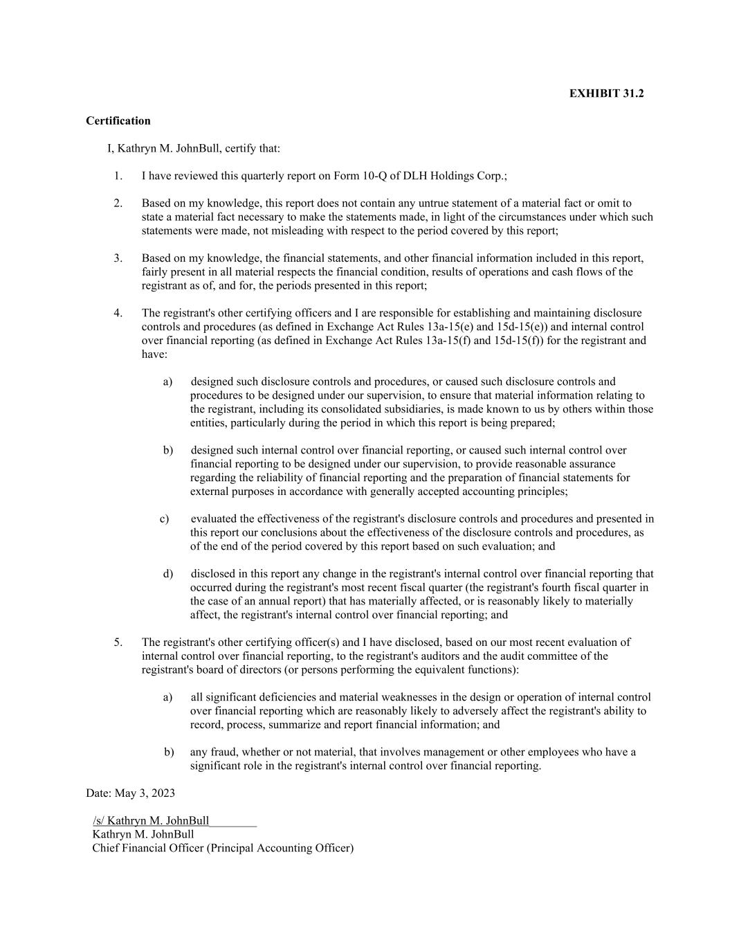 EXHIBIT 31.2 Certification I, Kathryn M. JohnBull, certify that: 1. I have reviewed this quarterly report on Form 10-Q of DLH Holdings Corp.; 2. Based on my knowledge, this report does not contain any untrue statement of a material fact or omit to state a material fact necessary to make the statements made, in light of the circumstances under which such statements were made, not misleading with respect to the period covered by this report; 3. Based on my knowledge, the financial statements, and other financial information included in this report, fairly present in all material respects the financial condition, results of operations and cash flows of the registrant as of, and for, the periods presented in this report; 4. The registrant's other certifying officers and I are responsible for establishing and maintaining disclosure controls and procedures (as defined in Exchange Act Rules 13a-15(e) and 15d-15(e)) and internal control over financial reporting (as defined in Exchange Act Rules 13a-15(f) and 15d-15(f)) for the registrant and have: a) designed such disclosure controls and procedures, or caused such disclosure controls and procedures to be designed under our supervision, to ensure that material information relating to the registrant, including its consolidated subsidiaries, is made known to us by others within those entities, particularly during the period in which this report is being prepared; b) designed such internal control over financial reporting, or caused such internal control over financial reporting to be designed under our supervision, to provide reasonable assurance regarding the reliability of financial reporting and the preparation of financial statements for external purposes in accordance with generally accepted accounting principles; c) evaluated the effectiveness of the registrant's disclosure controls and procedures and presented in this report our conclusions about the effectiveness of the disclosure controls and procedures, as of the end of the period covered by this report based on such evaluation; and d) disclosed in this report any change in the registrant's internal control over financial reporting that occurred during the registrant's most recent fiscal quarter (the registrant's fourth fiscal quarter in the case of an annual report) that has materially affected, or is reasonably likely to materially affect, the registrant's internal control over financial reporting; and 5. The registrant's other certifying officer(s) and I have disclosed, based on our most recent evaluation of internal control over financial reporting, to the registrant's auditors and the audit committee of the registrant's board of directors (or persons performing the equivalent functions): a) all significant deficiencies and material weaknesses in the design or operation of internal control over financial reporting which are reasonably likely to adversely affect the registrant's ability to record, process, summarize and report financial information; and b) any fraud, whether or not material, that involves management or other employees who have a significant role in the registrant's internal control over financial reporting. Date: May 3, 2023 /s/ Kathryn M. JohnBull________ Kathryn M. JohnBull Chief Financial Officer (Principal Accounting Officer)
