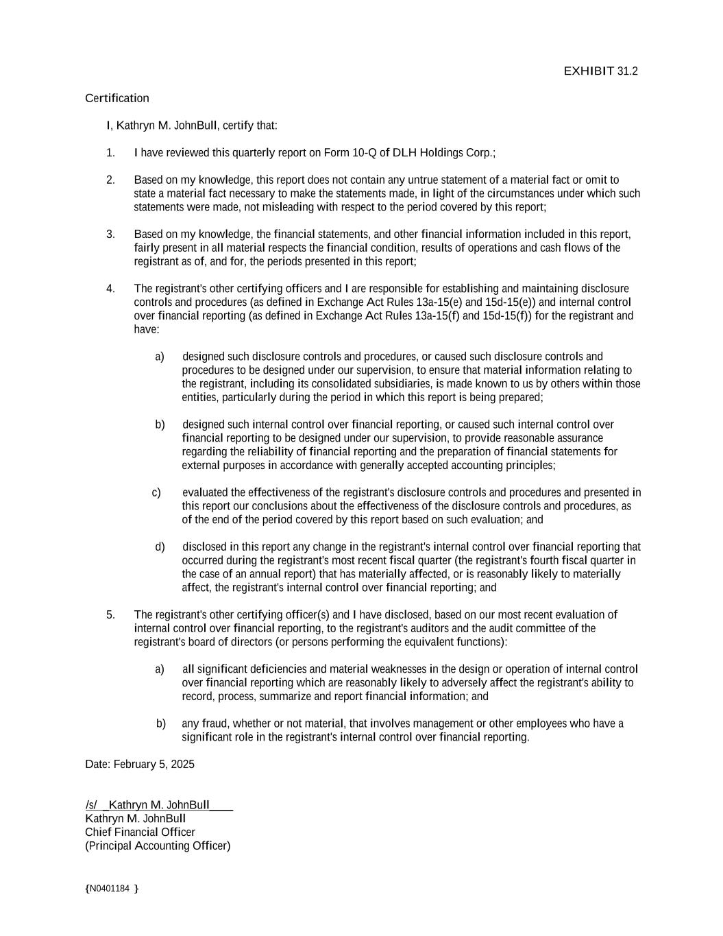 {N0401184 } EXHIBIT 31.2 Certification I, Kathryn M. JohnBull, certify that: 1. I have reviewed this quarterly report on Form 10-Q of DLH Holdings Corp.; 2. Based on my knowledge, this report does not contain any untrue statement of a material fact or omit to state a material fact necessary to make the statements made, in light of the circumstances under which such statements were made, not misleading with respect to the period covered by this report; 3. Based on my knowledge, the financial statements, and other financial information included in this report, fairly present in all material respects the financial condition, results of operations and cash flows of the registrant as of, and for, the periods presented in this report; 4. The registrant's other certifying officers and I are responsible for establishing and maintaining disclosure controls and procedures (as defined in Exchange Act Rules 13a-15(e) and 15d-15(e)) and internal control over financial reporting (as defined in Exchange Act Rules 13a-15(f) and 15d-15(f)) for the registrant and have: a) designed such disclosure controls and procedures, or caused such disclosure controls and procedures to be designed under our supervision, to ensure that material information relating to the registrant, including its consolidated subsidiaries, is made known to us by others within those entities, particularly during the period in which this report is being prepared; b) designed such internal control over financial reporting, or caused such internal control over financial reporting to be designed under our supervision, to provide reasonable assurance regarding the reliability of financial reporting and the preparation of financial statements for external purposes in accordance with generally accepted accounting principles; c) evaluated the effectiveness of the registrant's disclosure controls and procedures and presented in this report our conclusions about the effectiveness of the disclosure controls and procedures, as of the end of the period covered by this report based on such evaluation; and d) disclosed in this report any change in the registrant's internal control over financial reporting that occurred during the registrant's most recent fiscal quarter (the registrant's fourth fiscal quarter in the case of an annual report) that has materially affected, or is reasonably likely to materially affect, the registrant's internal control over financial reporting; and 5. The registrant's other certifying officer(s) and I have disclosed, based on our most recent evaluation of internal control over financial reporting, to the registrant's auditors and the audit committee of the registrant's board of directors (or persons performing the equivalent functions): a) all significant deficiencies and material weaknesses in the design or operation of internal control over financial reporting which are reasonably likely to adversely affect the registrant's ability to record, process, summarize and report financial information; and b) any fraud, whether or not material, that involves management or other employees who have a significant role in the registrant's internal control over financial reporting. Date: February 5, 2025 /s/ _Kathryn M. JohnBull____ Kathryn M. JohnBull Chief Financial Officer (Principal Accounting Officer)