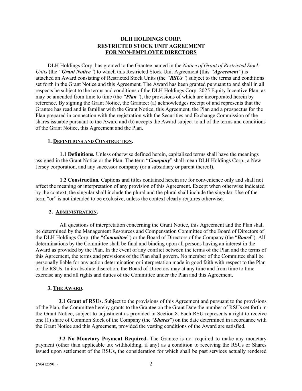 {N0412590 } 2 DLH HOLDINGS CORP. RESTRICTED STOCK UNIT AGREEMENT FOR NON-EMPLOYEE DIRECTORS DLH Holdings Corp. has granted to the Grantee named in the Notice of Grant of Restricted Stock Units (the “Grant Notice”) to which this Restricted Stock Unit Agreement (this “Agreement”) is attached an Award consisting of Restricted Stock Units (the “RSUs”) subject to the terms and conditions set forth in the Grant Notice and this Agreement. The Award has been granted pursuant to and shall in all respects be subject to the terms and conditions of the DLH Holdings Corp. 2025 Equity Incentive Plan, as may be amended from time to time (the “Plan”), the provisions of which are incorporated herein by reference. By signing the Grant Notice, the Grantee: (a) acknowledges receipt of and represents that the Grantee has read and is familiar with the Grant Notice, this Agreement, the Plan and a prospectus for the Plan prepared in connection with the registration with the Securities and Exchange Commission of the shares issuable pursuant to the Award and (b) accepts the Award subject to all of the terms and conditions of the Grant Notice, this Agreement and the Plan. 1. DEFINITIONS AND CONSTRUCTION. 1.1 Definitions. Unless otherwise defined herein, capitalized terms shall have the meanings assigned in the Grant Notice or the Plan. The term “Company” shall mean DLH Holdings Corp., a New Jersey corporation, and any successor company (or a subsidiary or parent thereof). 1.2 Construction. Captions and titles contained herein are for convenience only and shall not affect the meaning or interpretation of any provision of this Agreement. Except when otherwise indicated by the context, the singular shall include the plural and the plural shall include the singular. Use of the term “or” is not intended to be exclusive, unless the context clearly requires otherwise. 2. ADMINISTRATION. All questions of interpretation concerning the Grant Notice, this Agreement and the Plan shall be determined by the Management Resources and Compensation Committee of the Board of Directors of the DLH Holdings Corp. (the “Committee”) or the Board of Directors of the Company (the “Board”). All determinations by the Committee shall be final and binding upon all persons having an interest in the Award as provided by the Plan. In the event of any conflict between the terms of the Plan and the terms of this Agreement, the terms and provisions of the Plan shall govern. No member of the Committee shall be personally liable for any action determination or interpretation made in good faith with respect to the Plan or the RSUs. In its absolute discretion, the Board of Directors may at any time and from time to time exercise any and all rights and duties of the Committee under the Plan and this Agreement. 3. THE AWARD. 3.1 Grant of RSUs. Subject to the provisions of this Agreement and pursuant to the provisions of the Plan, the Committee hereby grants to the Grantee on the Grant Date the number of RSUs set forth in the Grant Notice, subject to adjustment as provided in Section 8. Each RSU represents a right to receive one (1) share of Common Stock of the Company (the “Shares”) on the date determined in accordance with the Grant Notice and this Agreement, provided the vesting conditions of the Award are satisfied. 3.2 No Monetary Payment Required. The Grantee is not required to make any monetary payment (other than applicable tax withholding, if any) as a condition to receiving the RSUs or Shares issued upon settlement of the RSUs, the consideration for which shall be past services actually rendered
