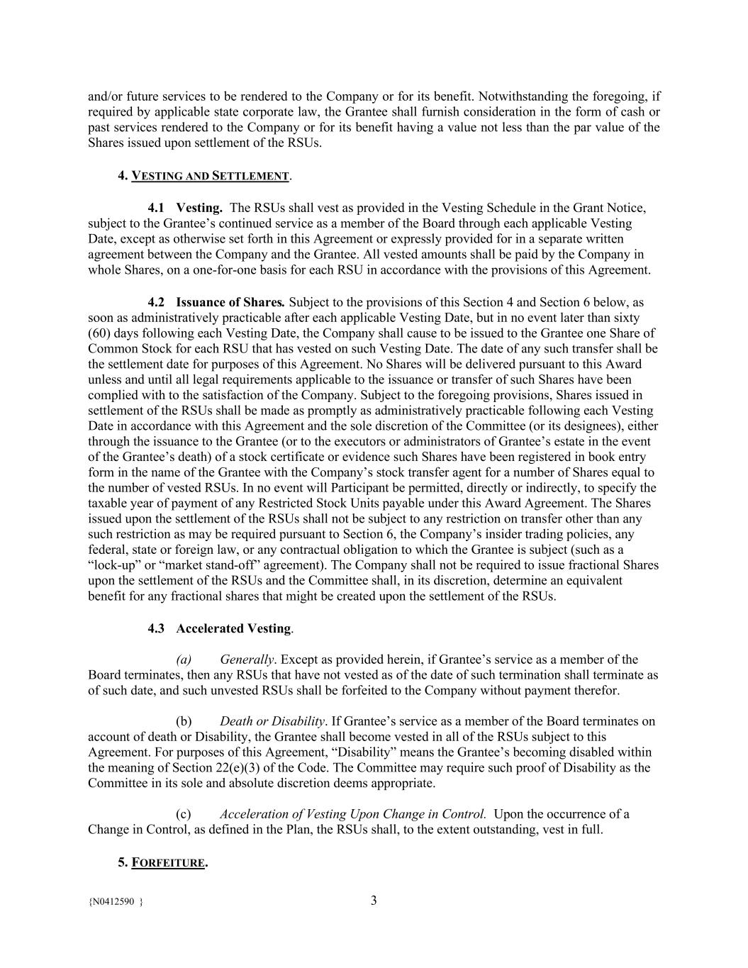 {N0412590 } 3 and/or future services to be rendered to the Company or for its benefit. Notwithstanding the foregoing, if required by applicable state corporate law, the Grantee shall furnish consideration in the form of cash or past services rendered to the Company or for its benefit having a value not less than the par value of the Shares issued upon settlement of the RSUs. 4. VESTING AND SETTLEMENT. 4.1 Vesting. The RSUs shall vest as provided in the Vesting Schedule in the Grant Notice, subject to the Grantee’s continued service as a member of the Board through each applicable Vesting Date, except as otherwise set forth in this Agreement or expressly provided for in a separate written agreement between the Company and the Grantee. All vested amounts shall be paid by the Company in whole Shares, on a one-for-one basis for each RSU in accordance with the provisions of this Agreement. 4.2 Issuance of Shares. Subject to the provisions of this Section 4 and Section 6 below, as soon as administratively practicable after each applicable Vesting Date, but in no event later than sixty (60) days following each Vesting Date, the Company shall cause to be issued to the Grantee one Share of Common Stock for each RSU that has vested on such Vesting Date. The date of any such transfer shall be the settlement date for purposes of this Agreement. No Shares will be delivered pursuant to this Award unless and until all legal requirements applicable to the issuance or transfer of such Shares have been complied with to the satisfaction of the Company. Subject to the foregoing provisions, Shares issued in settlement of the RSUs shall be made as promptly as administratively practicable following each Vesting Date in accordance with this Agreement and the sole discretion of the Committee (or its designees), either through the issuance to the Grantee (or to the executors or administrators of Grantee’s estate in the event of the Grantee’s death) of a stock certificate or evidence such Shares have been registered in book entry form in the name of the Grantee with the Company’s stock transfer agent for a number of Shares equal to the number of vested RSUs. In no event will Participant be permitted, directly or indirectly, to specify the taxable year of payment of any Restricted Stock Units payable under this Award Agreement. The Shares issued upon the settlement of the RSUs shall not be subject to any restriction on transfer other than any such restriction as may be required pursuant to Section 6, the Company’s insider trading policies, any federal, state or foreign law, or any contractual obligation to which the Grantee is subject (such as a “lock-up” or “market stand-off” agreement). The Company shall not be required to issue fractional Shares upon the settlement of the RSUs and the Committee shall, in its discretion, determine an equivalent benefit for any fractional shares that might be created upon the settlement of the RSUs. 4.3 Accelerated Vesting. (a) Generally. Except as provided herein, if Grantee’s service as a member of the Board terminates, then any RSUs that have not vested as of the date of such termination shall terminate as of such date, and such unvested RSUs shall be forfeited to the Company without payment therefor. (b) Death or Disability. If Grantee’s service as a member of the Board terminates on account of death or Disability, the Grantee shall become vested in all of the RSUs subject to this Agreement. For purposes of this Agreement, “Disability” means the Grantee’s becoming disabled within the meaning of Section 22(e)(3) of the Code. The Committee may require such proof of Disability as the Committee in its sole and absolute discretion deems appropriate. (c) Acceleration of Vesting Upon Change in Control. Upon the occurrence of a Change in Control, as defined in the Plan, the RSUs shall, to the extent outstanding, vest in full. 5. FORFEITURE.