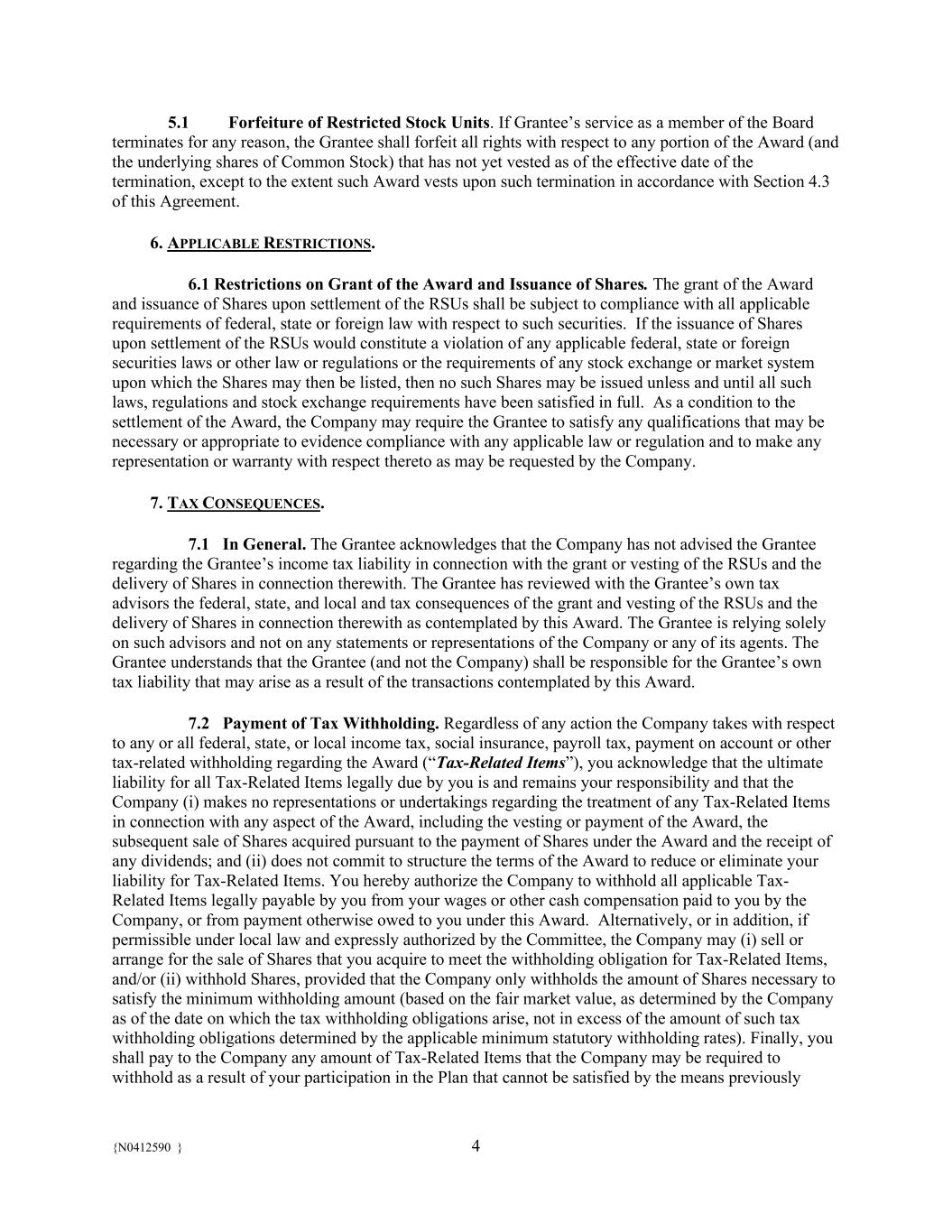 {N0412590 } 4 5.1 Forfeiture of Restricted Stock Units. If Grantee’s service as a member of the Board terminates for any reason, the Grantee shall forfeit all rights with respect to any portion of the Award (and the underlying shares of Common Stock) that has not yet vested as of the effective date of the termination, except to the extent such Award vests upon such termination in accordance with Section 4.3 of this Agreement. 6. APPLICABLE RESTRICTIONS. 6.1 Restrictions on Grant of the Award and Issuance of Shares. The grant of the Award and issuance of Shares upon settlement of the RSUs shall be subject to compliance with all applicable requirements of federal, state or foreign law with respect to such securities. If the issuance of Shares upon settlement of the RSUs would constitute a violation of any applicable federal, state or foreign securities laws or other law or regulations or the requirements of any stock exchange or market system upon which the Shares may then be listed, then no such Shares may be issued unless and until all such laws, regulations and stock exchange requirements have been satisfied in full. As a condition to the settlement of the Award, the Company may require the Grantee to satisfy any qualifications that may be necessary or appropriate to evidence compliance with any applicable law or regulation and to make any representation or warranty with respect thereto as may be requested by the Company. 7. TAX CONSEQUENCES. 7.1 In General. The Grantee acknowledges that the Company has not advised the Grantee regarding the Grantee’s income tax liability in connection with the grant or vesting of the RSUs and the delivery of Shares in connection therewith. The Grantee has reviewed with the Grantee’s own tax advisors the federal, state, and local and tax consequences of the grant and vesting of the RSUs and the delivery of Shares in connection therewith as contemplated by this Award. The Grantee is relying solely on such advisors and not on any statements or representations of the Company or any of its agents. The Grantee understands that the Grantee (and not the Company) shall be responsible for the Grantee’s own tax liability that may arise as a result of the transactions contemplated by this Award. 7.2 Payment of Tax Withholding. Regardless of any action the Company takes with respect to any or all federal, state, or local income tax, social insurance, payroll tax, payment on account or other tax-related withholding regarding the Award (“Tax-Related Items”), you acknowledge that the ultimate liability for all Tax-Related Items legally due by you is and remains your responsibility and that the Company (i) makes no representations or undertakings regarding the treatment of any Tax-Related Items in connection with any aspect of the Award, including the vesting or payment of the Award, the subsequent sale of Shares acquired pursuant to the payment of Shares under the Award and the receipt of any dividends; and (ii) does not commit to structure the terms of the Award to reduce or eliminate your liability for Tax-Related Items. You hereby authorize the Company to withhold all applicable Tax- Related Items legally payable by you from your wages or other cash compensation paid to you by the Company, or from payment otherwise owed to you under this Award. Alternatively, or in addition, if permissible under local law and expressly authorized by the Committee, the Company may (i) sell or arrange for the sale of Shares that you acquire to meet the withholding obligation for Tax-Related Items, and/or (ii) withhold Shares, provided that the Company only withholds the amount of Shares necessary to satisfy the minimum withholding amount (based on the fair market value, as determined by the Company as of the date on which the tax withholding obligations arise, not in excess of the amount of such tax withholding obligations determined by the applicable minimum statutory withholding rates). Finally, you shall pay to the Company any amount of Tax-Related Items that the Company may be required to withhold as a result of your participation in the Plan that cannot be satisfied by the means previously