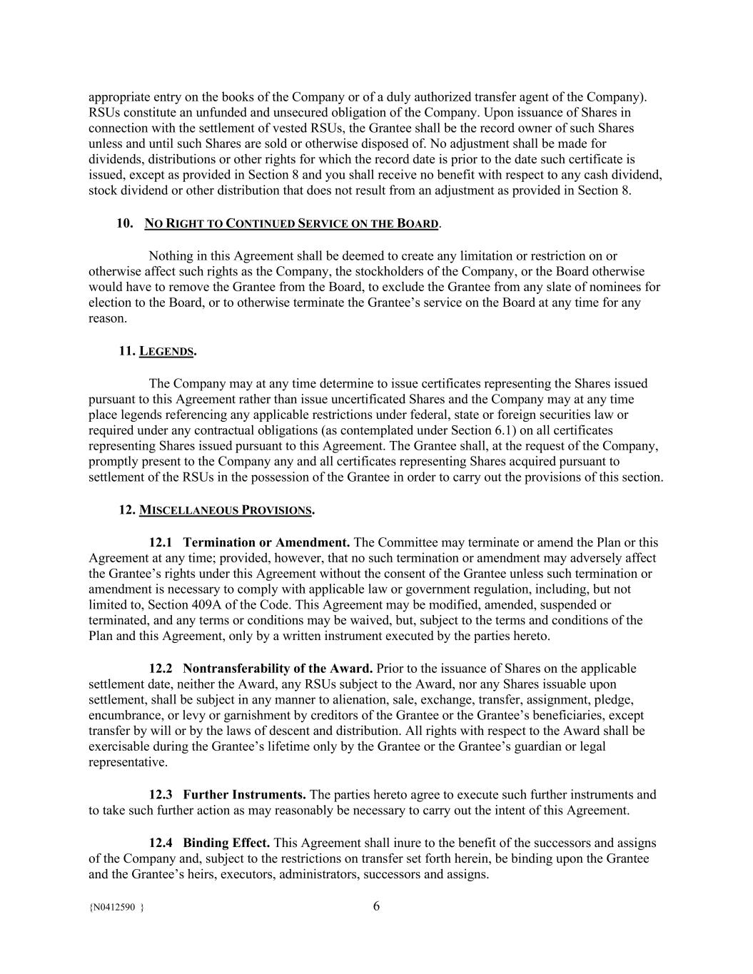 {N0412590 } 6 appropriate entry on the books of the Company or of a duly authorized transfer agent of the Company). RSUs constitute an unfunded and unsecured obligation of the Company. Upon issuance of Shares in connection with the settlement of vested RSUs, the Grantee shall be the record owner of such Shares unless and until such Shares are sold or otherwise disposed of. No adjustment shall be made for dividends, distributions or other rights for which the record date is prior to the date such certificate is issued, except as provided in Section 8 and you shall receive no benefit with respect to any cash dividend, stock dividend or other distribution that does not result from an adjustment as provided in Section 8. 10. NO RIGHT TO CONTINUED SERVICE ON THE BOARD. Nothing in this Agreement shall be deemed to create any limitation or restriction on or otherwise affect such rights as the Company, the stockholders of the Company, or the Board otherwise would have to remove the Grantee from the Board, to exclude the Grantee from any slate of nominees for election to the Board, or to otherwise terminate the Grantee’s service on the Board at any time for any reason. 11. LEGENDS. The Company may at any time determine to issue certificates representing the Shares issued pursuant to this Agreement rather than issue uncertificated Shares and the Company may at any time place legends referencing any applicable restrictions under federal, state or foreign securities law or required under any contractual obligations (as contemplated under Section 6.1) on all certificates representing Shares issued pursuant to this Agreement. The Grantee shall, at the request of the Company, promptly present to the Company any and all certificates representing Shares acquired pursuant to settlement of the RSUs in the possession of the Grantee in order to carry out the provisions of this section. 12. MISCELLANEOUS PROVISIONS. 12.1 Termination or Amendment. The Committee may terminate or amend the Plan or this Agreement at any time; provided, however, that no such termination or amendment may adversely affect the Grantee’s rights under this Agreement without the consent of the Grantee unless such termination or amendment is necessary to comply with applicable law or government regulation, including, but not limited to, Section 409A of the Code. This Agreement may be modified, amended, suspended or terminated, and any terms or conditions may be waived, but, subject to the terms and conditions of the Plan and this Agreement, only by a written instrument executed by the parties hereto. 12.2 Nontransferability of the Award. Prior to the issuance of Shares on the applicable settlement date, neither the Award, any RSUs subject to the Award, nor any Shares issuable upon settlement, shall be subject in any manner to alienation, sale, exchange, transfer, assignment, pledge, encumbrance, or levy or garnishment by creditors of the Grantee or the Grantee’s beneficiaries, except transfer by will or by the laws of descent and distribution. All rights with respect to the Award shall be exercisable during the Grantee’s lifetime only by the Grantee or the Grantee’s guardian or legal representative. 12.3 Further Instruments. The parties hereto agree to execute such further instruments and to take such further action as may reasonably be necessary to carry out the intent of this Agreement. 12.4 Binding Effect. This Agreement shall inure to the benefit of the successors and assigns of the Company and, subject to the restrictions on transfer set forth herein, be binding upon the Grantee and the Grantee’s heirs, executors, administrators, successors and assigns.