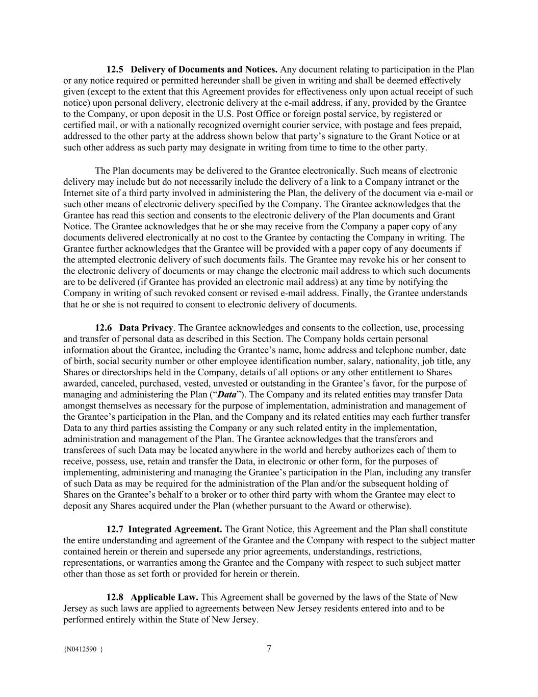 {N0412590 } 7 12.5 Delivery of Documents and Notices. Any document relating to participation in the Plan or any notice required or permitted hereunder shall be given in writing and shall be deemed effectively given (except to the extent that this Agreement provides for effectiveness only upon actual receipt of such notice) upon personal delivery, electronic delivery at the e-mail address, if any, provided by the Grantee to the Company, or upon deposit in the U.S. Post Office or foreign postal service, by registered or certified mail, or with a nationally recognized overnight courier service, with postage and fees prepaid, addressed to the other party at the address shown below that party’s signature to the Grant Notice or at such other address as such party may designate in writing from time to time to the other party. The Plan documents may be delivered to the Grantee electronically. Such means of electronic delivery may include but do not necessarily include the delivery of a link to a Company intranet or the Internet site of a third party involved in administering the Plan, the delivery of the document via e-mail or such other means of electronic delivery specified by the Company. The Grantee acknowledges that the Grantee has read this section and consents to the electronic delivery of the Plan documents and Grant Notice. The Grantee acknowledges that he or she may receive from the Company a paper copy of any documents delivered electronically at no cost to the Grantee by contacting the Company in writing. The Grantee further acknowledges that the Grantee will be provided with a paper copy of any documents if the attempted electronic delivery of such documents fails. The Grantee may revoke his or her consent to the electronic delivery of documents or may change the electronic mail address to which such documents are to be delivered (if Grantee has provided an electronic mail address) at any time by notifying the Company in writing of such revoked consent or revised e-mail address. Finally, the Grantee understands that he or she is not required to consent to electronic delivery of documents. 12.6 Data Privacy. The Grantee acknowledges and consents to the collection, use, processing and transfer of personal data as described in this Section. The Company holds certain personal information about the Grantee, including the Grantee’s name, home address and telephone number, date of birth, social security number or other employee identification number, salary, nationality, job title, any Shares or directorships held in the Company, details of all options or any other entitlement to Shares awarded, canceled, purchased, vested, unvested or outstanding in the Grantee’s favor, for the purpose of managing and administering the Plan (“Data”). The Company and its related entities may transfer Data amongst themselves as necessary for the purpose of implementation, administration and management of the Grantee’s participation in the Plan, and the Company and its related entities may each further transfer Data to any third parties assisting the Company or any such related entity in the implementation, administration and management of the Plan. The Grantee acknowledges that the transferors and transferees of such Data may be located anywhere in the world and hereby authorizes each of them to receive, possess, use, retain and transfer the Data, in electronic or other form, for the purposes of implementing, administering and managing the Grantee’s participation in the Plan, including any transfer of such Data as may be required for the administration of the Plan and/or the subsequent holding of Shares on the Grantee’s behalf to a broker or to other third party with whom the Grantee may elect to deposit any Shares acquired under the Plan (whether pursuant to the Award or otherwise). 12.7 Integrated Agreement. The Grant Notice, this Agreement and the Plan shall constitute the entire understanding and agreement of the Grantee and the Company with respect to the subject matter contained herein or therein and supersede any prior agreements, understandings, restrictions, representations, or warranties among the Grantee and the Company with respect to such subject matter other than those as set forth or provided for herein or therein. 12.8 Applicable Law. This Agreement shall be governed by the laws of the State of New Jersey as such laws are applied to agreements between New Jersey residents entered into and to be performed entirely within the State of New Jersey.