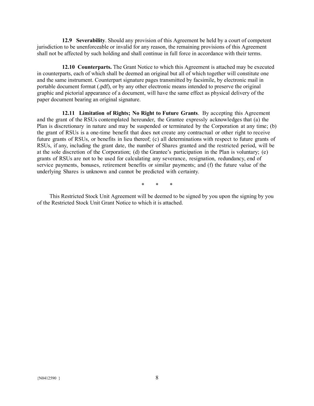{N0412590 } 8 12.9 Severability. Should any provision of this Agreement be held by a court of competent jurisdiction to be unenforceable or invalid for any reason, the remaining provisions of this Agreement shall not be affected by such holding and shall continue in full force in accordance with their terms. 12.10 Counterparts. The Grant Notice to which this Agreement is attached may be executed in counterparts, each of which shall be deemed an original but all of which together will constitute one and the same instrument. Counterpart signature pages transmitted by facsimile, by electronic mail in portable document format (.pdf), or by any other electronic means intended to preserve the original graphic and pictorial appearance of a document, will have the same effect as physical delivery of the paper document bearing an original signature. 12.11 Limitation of Rights; No Right to Future Grants. By accepting this Agreement and the grant of the RSUs contemplated hereunder, the Grantee expressly acknowledges that (a) the Plan is discretionary in nature and may be suspended or terminated by the Corporation at any time; (b) the grant of RSUs is a one-time benefit that does not create any contractual or other right to receive future grants of RSUs, or benefits in lieu thereof; (c) all determinations with respect to future grants of RSUs, if any, including the grant date, the number of Shares granted and the restricted period, will be at the sole discretion of the Corporation; (d) the Grantee’s participation in the Plan is voluntary; (e) grants of RSUs are not to be used for calculating any severance, resignation, redundancy, end of service payments, bonuses, retirement benefits or similar payments; and (f) the future value of the underlying Shares is unknown and cannot be predicted with certainty. * * * This Restricted Stock Unit Agreement will be deemed to be signed by you upon the signing by you of the Restricted Stock Unit Grant Notice to which it is attached.
