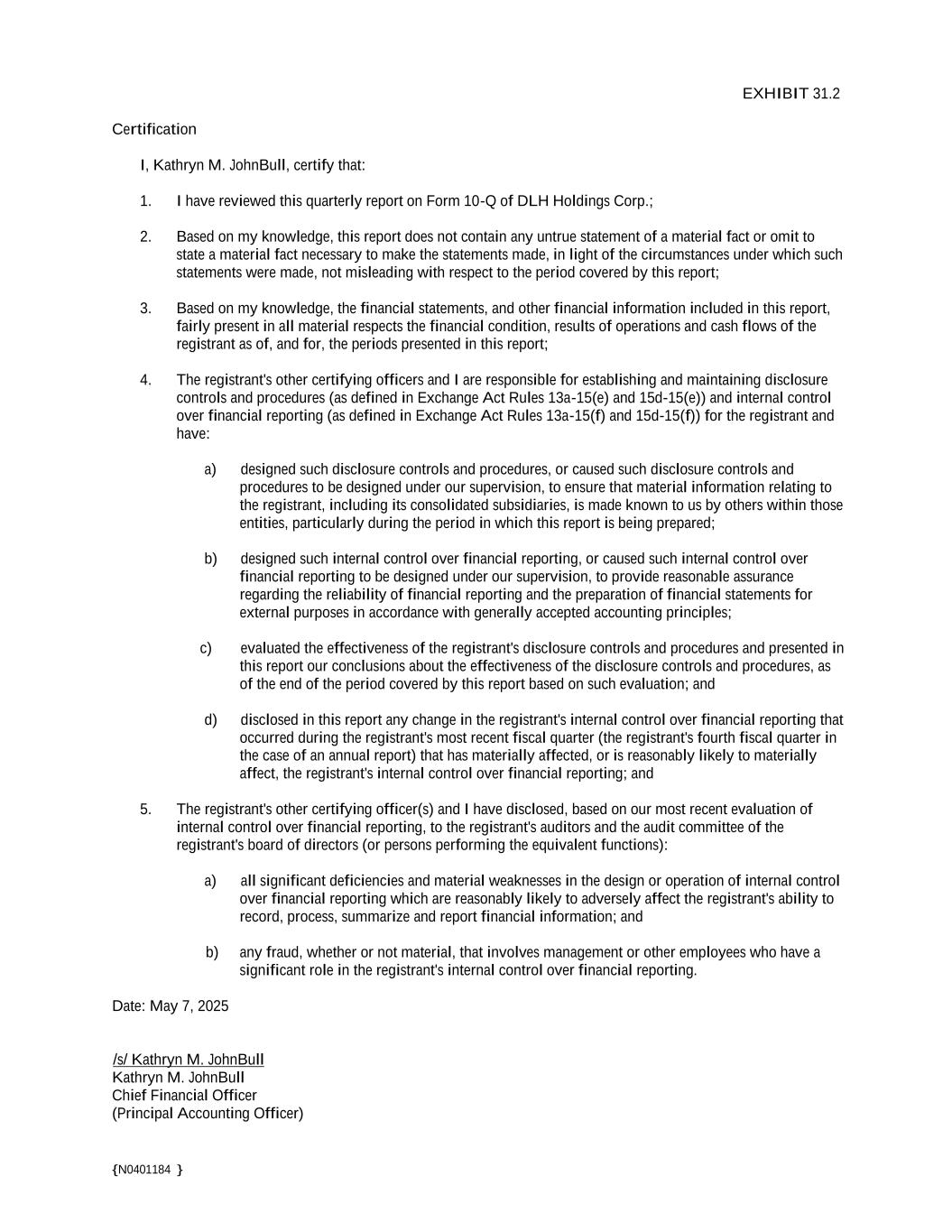 {N0401184 } EXHIBIT 31.2 Certification I, Kathryn M. JohnBull, certify that: 1. I have reviewed this quarterly report on Form 10-Q of DLH Holdings Corp.; 2. Based on my knowledge, this report does not contain any untrue statement of a material fact or omit to state a material fact necessary to make the statements made, in light of the circumstances under which such statements were made, not misleading with respect to the period covered by this report; 3. Based on my knowledge, the financial statements, and other financial information included in this report, fairly present in all material respects the financial condition, results of operations and cash flows of the registrant as of, and for, the periods presented in this report; 4. The registrant's other certifying officers and I are responsible for establishing and maintaining disclosure controls and procedures (as defined in Exchange Act Rules 13a-15(e) and 15d-15(e)) and internal control over financial reporting (as defined in Exchange Act Rules 13a-15(f) and 15d-15(f)) for the registrant and have: a) designed such disclosure controls and procedures, or caused such disclosure controls and procedures to be designed under our supervision, to ensure that material information relating to the registrant, including its consolidated subsidiaries, is made known to us by others within those entities, particularly during the period in which this report is being prepared; b) designed such internal control over financial reporting, or caused such internal control over financial reporting to be designed under our supervision, to provide reasonable assurance regarding the reliability of financial reporting and the preparation of financial statements for external purposes in accordance with generally accepted accounting principles; c) evaluated the effectiveness of the registrant's disclosure controls and procedures and presented in this report our conclusions about the effectiveness of the disclosure controls and procedures, as of the end of the period covered by this report based on such evaluation; and d) disclosed in this report any change in the registrant's internal control over financial reporting that occurred during the registrant's most recent fiscal quarter (the registrant's fourth fiscal quarter in the case of an annual report) that has materially affected, or is reasonably likely to materially affect, the registrant's internal control over financial reporting; and 5. The registrant's other certifying officer(s) and I have disclosed, based on our most recent evaluation of internal control over financial reporting, to the registrant's auditors and the audit committee of the registrant's board of directors (or persons performing the equivalent functions): a) all significant deficiencies and material weaknesses in the design or operation of internal control over financial reporting which are reasonably likely to adversely affect the registrant's ability to record, process, summarize and report financial information; and b) any fraud, whether or not material, that involves management or other employees who have a significant role in the registrant's internal control over financial reporting. Date: May 7, 2025 /s/ Kathryn M. JohnBull Kathryn M. JohnBull Chief Financial Officer (Principal Accounting Officer)