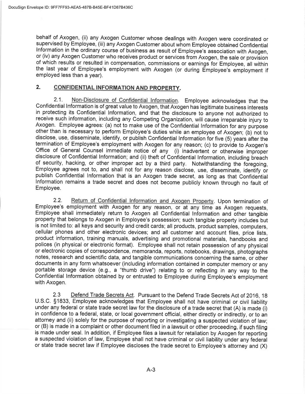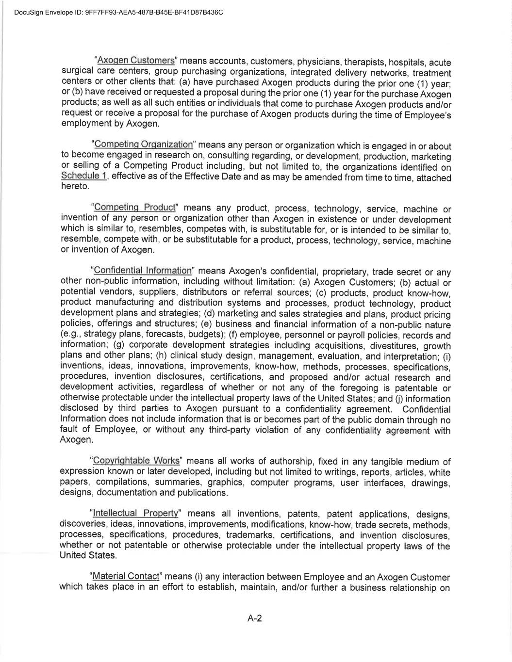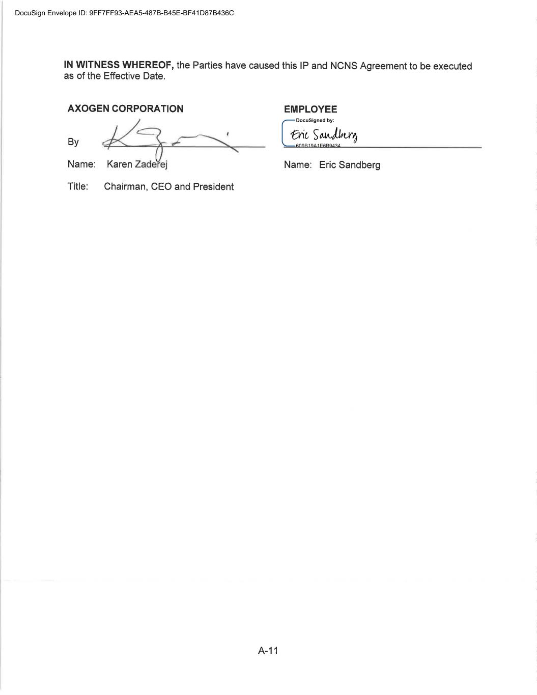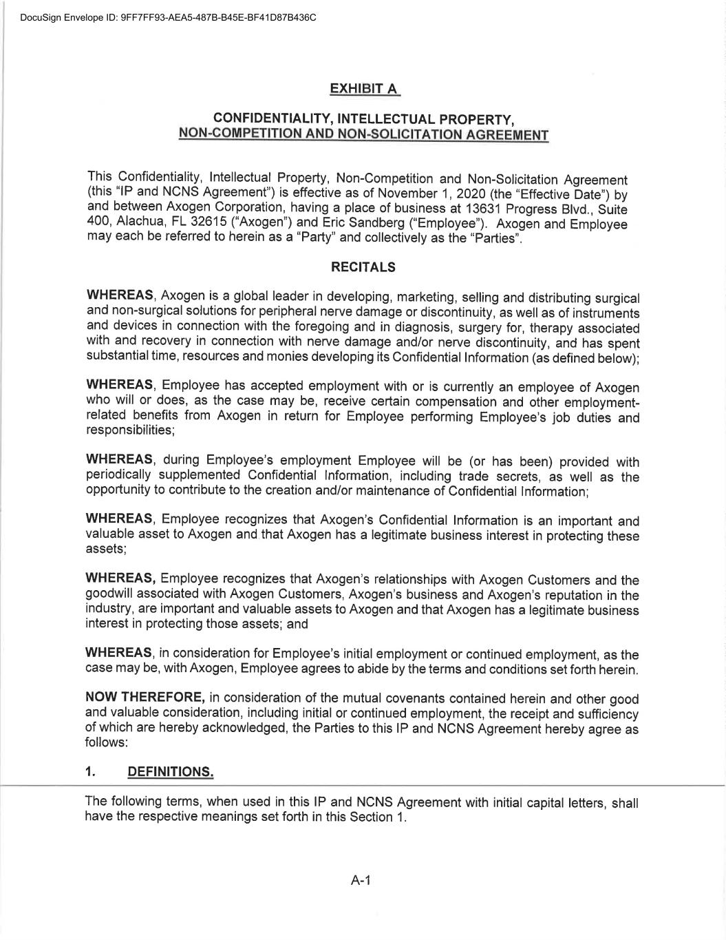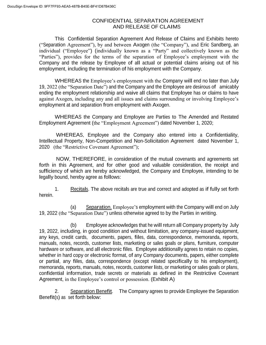 CONFIDENTIAL SEPARATION AGREEMENT AND RELEASE OF CLAIMS This Confidential Separation Agreement And Release of Claims and Exhibits hereto (“Separation Agreement”), by and between Axogen (the “Company”), and Eric Sandberg, an individual (“Employee”) (individually known as a “Party” and collectively known as the “Parties”), provides for the terms of the separation of Employee’s employment with the Company and the release by Employee of all actual or potential claims arising out of his employment, including the termination of his employment with the Company. WHEREAS the Employee’s employment with the Company will end no later than July 19, 2022 (the “Separation Date”) and the Company and the Employee are desirous of amicably ending the employment relationship and waive all claims that Employee has or claims to have against Axogen, including any and all issues and claims surrounding or involving Employee’s employment at and separation from employment with Axogen. WHEREAS the Company and Employee are Parties to The Amended and Restated Employment Agreement (the “Employment Agreement”) dated November 1, 2020; WHEREAS, Employee and the Company also entered into a Confidentiality, Intellectual Property, Non-Competition and Non-Solicitation Agreement dated November 1, 2020 (the “Restrictive Covenant Agreement”); NOW, THEREFORE, in consideration of the mutual covenants and agreements set forth in this Agreement, and for other good and valuable consideration, the receipt and sufficiency of which are hereby acknowledged, the Company and Employee, intending to be legally bound, hereby agree as follows: 1. Recitals. The above recitals are true and correct and adopted as if fully set forth herein. (a) Separation. Employee’s employment with the Company will end on July 19, 2022 (the “Separation Date”) unless otherwise agreed to by the Parties in writing. (b) Employee acknowledges that he will return all Company property by July 19, 2022, including, in good condition and without limitation, any company-issued equipment, any keys, credit cards, documents, papers, files, data, correspondence, memoranda, reports, manuals, notes, records, customer lists, marketing or sales goals or plans, furniture, computer hardware or software, and all electronic files. Employee additionally agrees to retain no copies, whether in hard copy or electronic format, of any Company documents, papers, either complete or partial, any files, data, correspondence (except related specifically to his employment), memoranda, reports, manuals, notes, records, customer lists, or marketing or sales goals or plans, confidential information, trade secrets or materials as defined in the Restrictive Covenant Agreement, in the Employee’s control or possession. (Exhibit A) 2. Separation Benefit. The Company agrees to provide Employee the Separation Benefit(s) as set forth below: DocuSign Envelope ID: 9FF7FF93-AEA5-487B-B45E-BF41D87B436C