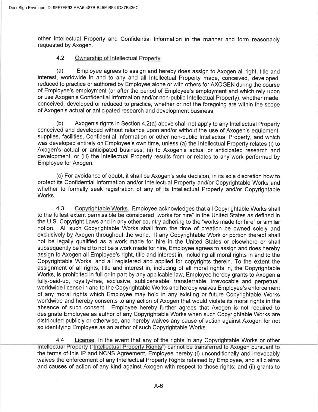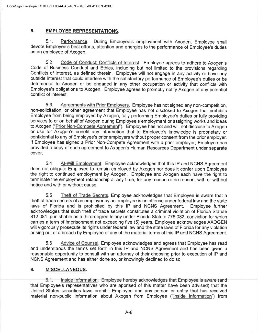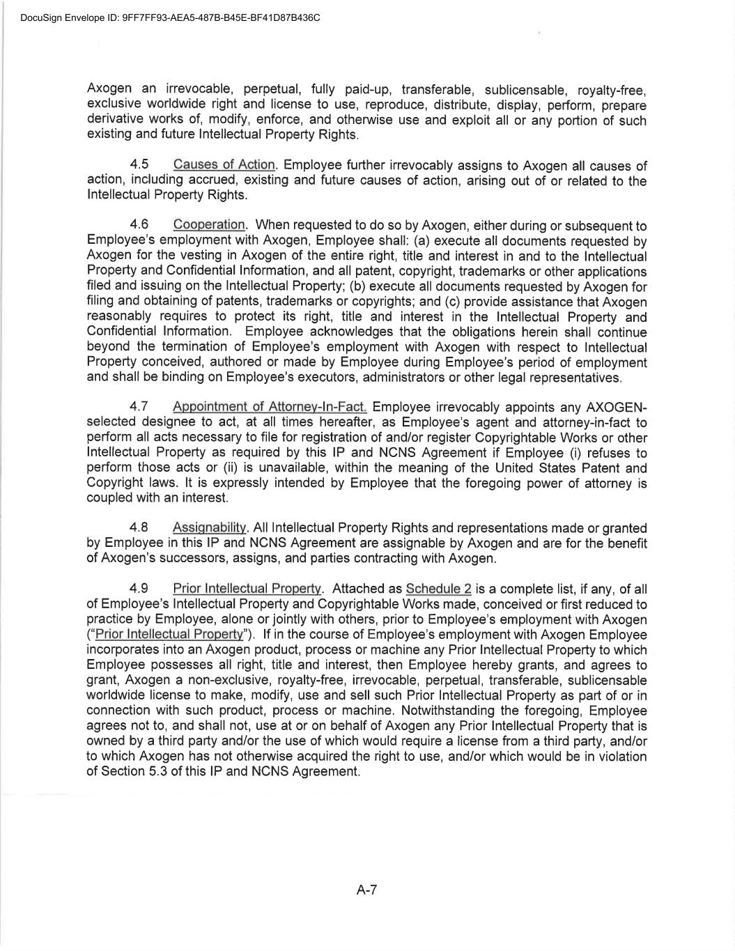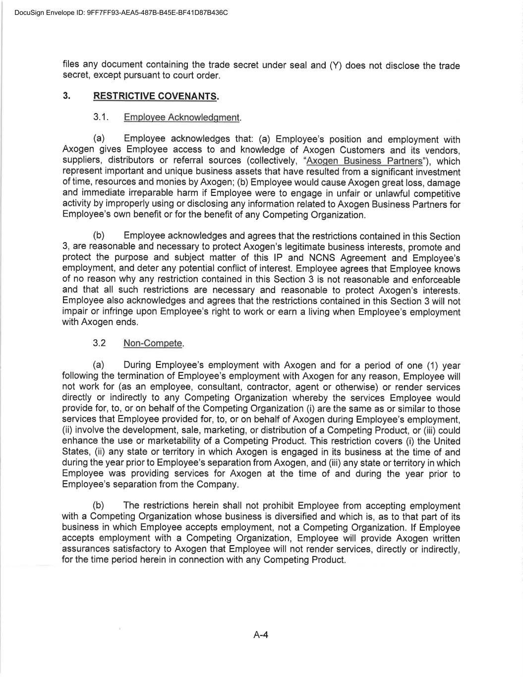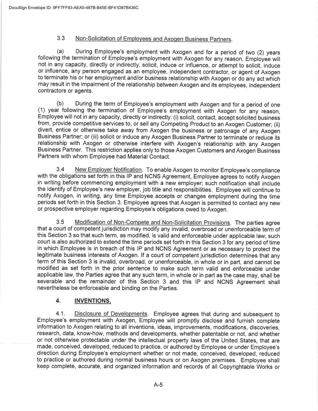 CONFIDENTIAL SEPARATION AGREEMENT AND RELEASE OF CLAIMS This Confidential Separation Agreement And Release of Claims and Exhibits hereto (“Separation Agreement”), by and between Axogen (the “Company”), and Eric Sandberg, an individual (“Employee”) (individually known as a “Party” and collectively known as the “Parties”), provides for the terms of the separation of Employee’s employment with the Company and the release by Employee of all actual or potential claims arising out of his employment, including the termination of his employment with the Company. WHEREAS the Employee’s employment with the Company will end no later than July 19, 2022 (the “Separation Date”) and the Company and the Employee are desirous of amicably ending the employment relationship and waive all claims that Employee has or claims to have against Axogen, including any and all issues and claims surrounding or involving Employee’s employment at and separation from employment with Axogen. WHEREAS the Company and Employee are Parties to The Amended and Restated Employment Agreement (the “Employment Agreement”) dated November 1, 2020; WHEREAS, Employee and the Company also entered into a Confidentiality, Intellectual Property, Non-Competition and Non-Solicitation Agreement dated November 1, 2020 (the “Restrictive Covenant Agreement”); NOW, THEREFORE, in consideration of the mutual covenants and agreements set forth in this Agreement, and for other good and valuable consideration, the receipt and sufficiency of which are hereby acknowledged, the Company and Employee, intending to be legally bound, hereby agree as follows: 1. Recitals. The above recitals are true and correct and adopted as if fully set forth herein. (a) Separation. Employee’s employment with the Company will end on July 19, 2022 (the “Separation Date”) unless otherwise agreed to by the Parties in writing. (b) Employee acknowledges that he will return all Company property by July 19, 2022, including, in good condition and without limitation, any company-issued equipment, any keys, credit cards, documents, papers, files, data, correspondence, memoranda, reports, manuals, notes, records, customer lists, marketing or sales goals or plans, furniture, computer hardware or software, and all electronic files. Employee additionally agrees to retain no copies, whether in hard copy or electronic format, of any Company documents, papers, either complete or partial, any files, data, correspondence (except related specifically to his employment), memoranda, reports, manuals, notes, records, customer lists, or marketing or sales goals or plans, confidential information, trade secrets or materials as defined in the Restrictive Covenant Agreement, in the Employee’s control or possession. (Exhibit A) 2. Separation Benefit. The Company agrees to provide Employee the Separation Benefit(s) as set forth below: DocuSign Envelope ID: 9FF7FF93-AEA5-487B-B45E-BF41D87B436C