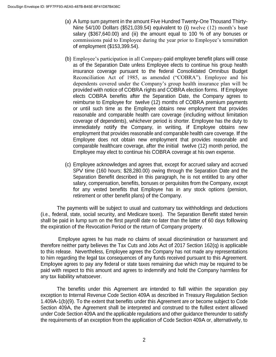 2 (a) A lump sum payment in the amount Five Hundred Twenty-One Thousand Thirty- Nine 54/100 Dollars ($521,039.54) equivalent to (i) twelve (12) month’s base salary ($367,640.00) and (ii) the amount equal to 100 % of any bonuses or commissions paid to Employee during the year prior to Employee’s termination of employment ($153,399.54). (b) Employee’s participation in all Company-paid employee benefit plans will cease as of the Separation Date unless Employee elects to continue his group health insurance coverage pursuant to the federal Consolidated Omnibus Budget Reconciliation Act of 1985, as amended (“COBRA”). Employee and his dependents covered under the Company’s group health insurance plan will be provided with notice of COBRA rights and COBRA election forms. If Employee elects COBRA benefits after the Separation Date, the Company agrees to reimburse to Employee for twelve (12) months of COBRA premium payments or until such time as the Employee obtains new employment that provides reasonable and comparable health care coverage (including without limitation coverage of dependents), whichever period is shorter. Employee has the duty to immediately notify the Company, in writing, if Employee obtains new employment that provides reasonable and comparable health care coverage. If the Employee does not obtain new employment that provides reasonable and comparable healthcare coverage, after the initial twelve (12) month period, the Employee may elect to continue his COBRA coverage at his own expense. (c) Employee acknowledges and agrees that, except for accrued salary and accrued SPV time (160 hours; $28,280.00) owing through the Separation Date and the Separation Benefit described in this paragraph, he is not entitled to any other salary, compensation, benefits, bonuses or perquisites from the Company, except for any vested benefits that Employee has in any stock options (pension, retirement or other benefit plans) of the Company. The payments will be subject to usual and customary tax withholdings and deductions (i.e., federal, state, social security, and Medicare taxes). The Separation Benefit stated herein shall be paid in lump sum on the first payroll date no later than the latter of 60 days following the expiration of the Revocation Period or the return of Company property. Employee agrees he has made no claims of sexual discrimination or harassment and therefore neither party believes the Tax Cuts and Jobs Act of 2017 Section 162(q) is applicable to this release. Nevertheless, Employee agrees the Company has not made any representations to him regarding the legal tax consequences of any funds received pursuant to this Agreement. Employee agrees to pay any federal or state taxes remaining due which may be required to be paid with respect to this amount and agrees to indemnify and hold the Company harmless for any tax liability whatsoever. The benefits under this Agreement are intended to fall within the separation pay exception to Internal Revenue Code Section 409A as described in Treasury Regulation Section 1.409A-1(b)(9). To the extent that benefits under this Agreement are or become subject to Code Section 409A, the Agreement shall be interpreted and construed to the fullest extent allowed under Code Section 409A and the applicable regulations and other guidance thereunder to satisfy the requirements of an exception from the application of Code Section 409A or, alternatively, to DocuSign Envelope ID: 9FF7FF93-AEA5-487B-B45E-BF41D87B436C