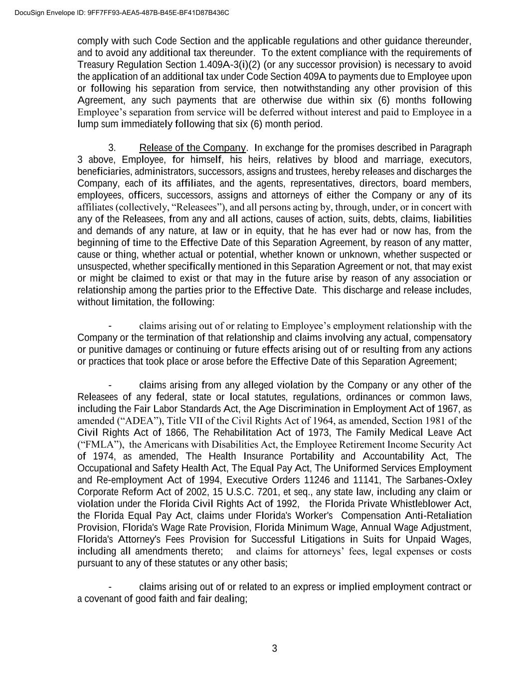 3 comply with such Code Section and the applicable regulations and other guidance thereunder, and to avoid any additional tax thereunder. To the extent compliance with the requirements of Treasury Regulation Section 1.409A-3(i)(2) (or any successor provision) is necessary to avoid the application of an additional tax under Code Section 409A to payments due to Employee upon or following his separation from service, then notwithstanding any other provision of this Agreement, any such payments that are otherwise due within six (6) months following Employee’s separation from service will be deferred without interest and paid to Employee in a lump sum immediately following that six (6) month period. 3. Release of the Company. In exchange for the promises described in Paragraph 3 above, Employee, for himself, his heirs, relatives by blood and marriage, executors, beneficiaries, administrators, successors, assigns and trustees, hereby releases and discharges the Company, each of its affiliates, and the agents, representatives, directors, board members, employees, officers, successors, assigns and attorneys of either the Company or any of its affiliates (collectively, “Releasees”), and all persons acting by, through, under, or in concert with any of the Releasees, from any and all actions, causes of action, suits, debts, claims, liabilities and demands of any nature, at law or in equity, that he has ever had or now has, from the beginning of time to the Effective Date of this Separation Agreement, by reason of any matter, cause or thing, whether actual or potential, whether known or unknown, whether suspected or unsuspected, whether specifically mentioned in this Separation Agreement or not, that may exist or might be claimed to exist or that may in the future arise by reason of any association or relationship among the parties prior to the Effective Date. This discharge and release includes, without limitation, the following: - claims arising out of or relating to Employee’s employment relationship with the Company or the termination of that relationship and claims involving any actual, compensatory or punitive damages or continuing or future effects arising out of or resulting from any actions or practices that took place or arose before the Effective Date of this Separation Agreement; - claims arising from any alleged violation by the Company or any other of the Releasees of any federal, state or local statutes, regulations, ordinances or common laws, including the Fair Labor Standards Act, the Age Discrimination in Employment Act of 1967, as amended (“ADEA”), Title VII of the Civil Rights Act of 1964, as amended, Section 1981 of the Civil Rights Act of 1866, The Rehabilitation Act of 1973, The Family Medical Leave Act (“FMLA”), the Americans with Disabilities Act, the Employee Retirement Income Security Act of 1974, as amended, The Health Insurance Portability and Accountability Act, The Occupational and Safety Health Act, The Equal Pay Act, The Uniformed Services Employment and Re-employment Act of 1994, Executive Orders 11246 and 11141, The Sarbanes-Oxley Corporate Reform Act of 2002, 15 U.S.C. 7201, et seq., any state law, including any claim or violation under the Florida Civil Rights Act of 1992, the Florida Private Whistleblower Act, the Florida Equal Pay Act, claims under Florida's Worker's Compensation Anti-Retaliation Provision, Florida's Wage Rate Provision, Florida Minimum Wage, Annual Wage Adjustment, Florida's Attorney's Fees Provision for Successful Litigations in Suits for Unpaid Wages, including all amendments thereto; and claims for attorneys’ fees, legal expenses or costs pursuant to any of these statutes or any other basis; - claims arising out of or related to an express or implied employment contract or a covenant of good faith and fair dealing; DocuSign Envelope ID: 9FF7FF93-AEA5-487B-B45E-BF41D87B436C