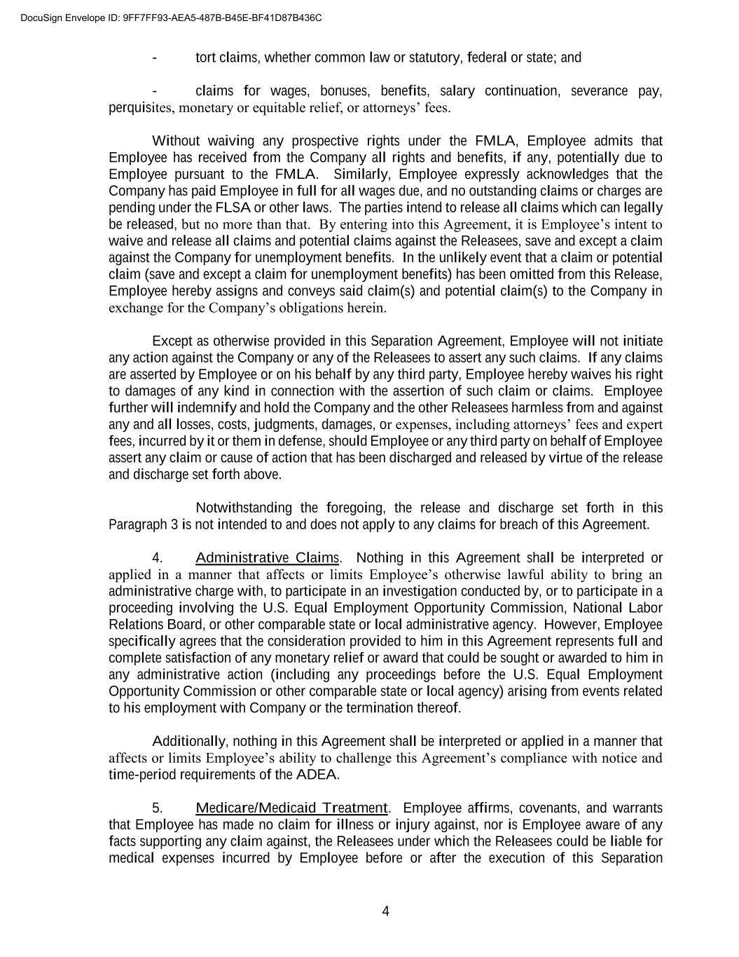 4 - tort claims, whether common law or statutory, federal or state; and - claims for wages, bonuses, benefits, salary continuation, severance pay, perquisites, monetary or equitable relief, or attorneys’ fees. Without waiving any prospective rights under the FMLA, Employee admits that Employee has received from the Company all rights and benefits, if any, potentially due to Employee pursuant to the FMLA. Similarly, Employee expressly acknowledges that the Company has paid Employee in full for all wages due, and no outstanding claims or charges are pending under the FLSA or other laws. The parties intend to release all claims which can legally be released, but no more than that. By entering into this Agreement, it is Employee’s intent to waive and release all claims and potential claims against the Releasees, save and except a claim against the Company for unemployment benefits. In the unlikely event that a claim or potential claim (save and except a claim for unemployment benefits) has been omitted from this Release, Employee hereby assigns and conveys said claim(s) and potential claim(s) to the Company in exchange for the Company’s obligations herein. Except as otherwise provided in this Separation Agreement, Employee will not initiate any action against the Company or any of the Releasees to assert any such claims. If any claims are asserted by Employee or on his behalf by any third party, Employee hereby waives his right to damages of any kind in connection with the assertion of such claim or claims. Employee further will indemnify and hold the Company and the other Releasees harmless from and against any and all losses, costs, judgments, damages, or expenses, including attorneys’ fees and expert fees, incurred by it or them in defense, should Employee or any third party on behalf of Employee assert any claim or cause of action that has been discharged and released by virtue of the release and discharge set forth above. Notwithstanding the foregoing, the release and discharge set forth in this Paragraph 3 is not intended to and does not apply to any claims for breach of this Agreement. 4. Administrative Claims. Nothing in this Agreement shall be interpreted or applied in a manner that affects or limits Employee’s otherwise lawful ability to bring an administrative charge with, to participate in an investigation conducted by, or to participate in a proceeding involving the U.S. Equal Employment Opportunity Commission, National Labor Relations Board, or other comparable state or local administrative agency. However, Employee specifically agrees that the consideration provided to him in this Agreement represents full and complete satisfaction of any monetary relief or award that could be sought or awarded to him in any administrative action (including any proceedings before the U.S. Equal Employment Opportunity Commission or other comparable state or local agency) arising from events related to his employment with Company or the termination thereof. Additionally, nothing in this Agreement shall be interpreted or applied in a manner that affects or limits Employee’s ability to challenge this Agreement’s compliance with notice and time-period requirements of the ADEA. 5. Medicare/Medicaid Treatment. Employee affirms, covenants, and warrants that Employee has made no claim for illness or injury against, nor is Employee aware of any facts supporting any claim against, the Releasees under which the Releasees could be liable for medical expenses incurred by Employee before or after the execution of this Separation DocuSign Envelope ID: 9FF7FF93-AEA5-487B-B45E-BF41D87B436C
