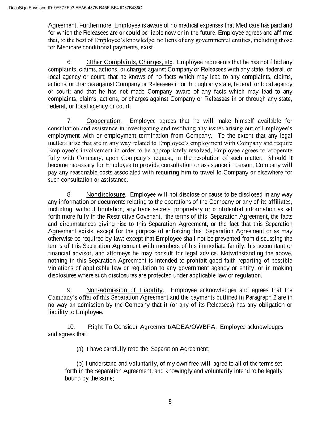 5 Agreement. Furthermore, Employee is aware of no medical expenses that Medicare has paid and for which the Releasees are or could be liable now or in the future. Employee agrees and affirms that, to the best of Employee’s knowledge, no liens of any governmental entities, including those for Medicare conditional payments, exist. 6. Other Complaints, Charges, etc. Employee represents that he has not filed any complaints, claims, actions, or charges against Company or Releasees with any state, federal, or local agency or court; that he knows of no facts which may lead to any complaints, claims, actions, or charges against Company or Releasees in or through any state, federal, or local agency or court; and that he has not made Company aware of any facts which may lead to any complaints, claims, actions, or charges against Company or Releasees in or through any state, federal, or local agency or court. 7. Cooperation. Employee agrees that he will make himself available for consultation and assistance in investigating and resolving any issues arising out of Employee’s employment with or employment termination from Company. To the extent that any legal matters arise that are in any way related to Employee’s employment with Company and require Employee’s involvement in order to be appropriately resolved, Employee agrees to cooperate fully with Company, upon Company’s request, in the resolution of such matter. Should it become necessary for Employee to provide consultation or assistance in person, Company will pay any reasonable costs associated with requiring him to travel to Company or elsewhere for such consultation or assistance. 8. Nondisclosure. Employee will not disclose or cause to be disclosed in any way any information or documents relating to the operations of the Company or any of its affiliates, including, without limitation, any trade secrets, proprietary or confidential information as set forth more fully in the Restrictive Covenant, the terms of this Separation Agreement, the facts and circumstances giving rise to this Separation Agreement, or the fact that this Separation Agreement exists, except for the purpose of enforcing this Separation Agreement or as may otherwise be required by law; except that Employee shall not be prevented from discussing the terms of this Separation Agreement with members of his immediate family, his accountant or financial advisor, and attorneys he may consult for legal advice. Notwithstanding the above, nothing in this Separation Agreement is intended to prohibit good faith reporting of possible violations of applicable law or regulation to any government agency or entity, or in making disclosures where such disclosures are protected under applicable law or regulation. 9. Non-admission of Liability. Employee acknowledges and agrees that the Company’s offer of this Separation Agreement and the payments outlined in Paragraph 2 are in no way an admission by the Company that it (or any of its Releasees) has any obligation or liability to Employee. 10. Right To Consider Agreement/ADEA/OWBPA. Employee acknowledges and agrees that: (a) I have carefully read the Separation Agreement; (b) I understand and voluntarily, of my own free will, agree to all of the terms set forth in the Separation Agreement, and knowingly and voluntarily intend to be legally bound by the same; DocuSign Envelope ID: 9FF7FF93-AEA5-487B-B45E-BF41D87B436C