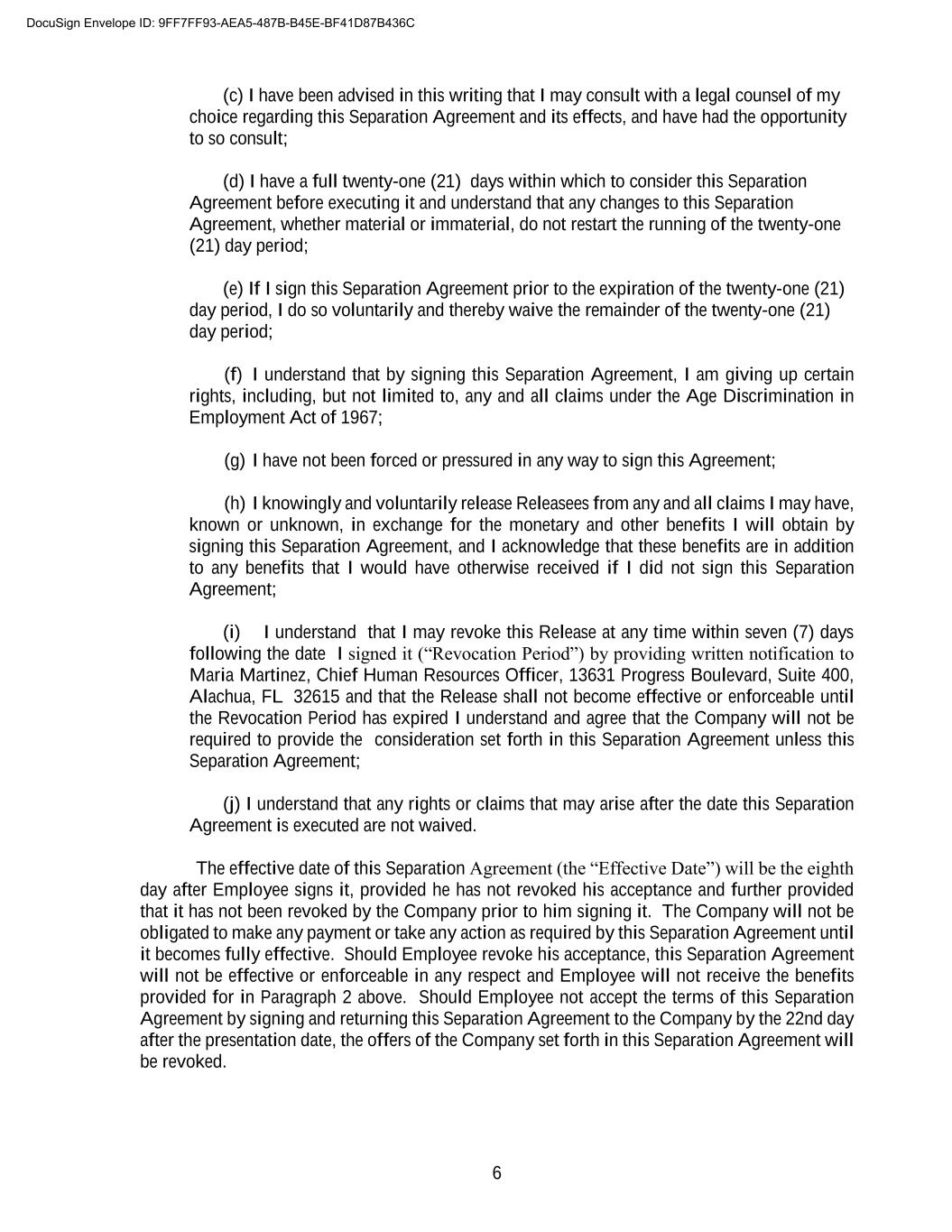 6 (c) I have been advised in this writing that I may consult with a legal counsel of my choice regarding this Separation Agreement and its effects, and have had the opportunity to so consult; (d) I have a full twenty-one (21) days within which to consider this Separation Agreement before executing it and understand that any changes to this Separation Agreement, whether material or immaterial, do not restart the running of the twenty-one (21) day period; (e) If I sign this Separation Agreement prior to the expiration of the twenty-one (21) day period, I do so voluntarily and thereby waive the remainder of the twenty-one (21) day period; (f) I understand that by signing this Separation Agreement, I am giving up certain rights, including, but not limited to, any and all claims under the Age Discrimination in Employment Act of 1967; (g) I have not been forced or pressured in any way to sign this Agreement; (h) I knowingly and voluntarily release Releasees from any and all claims I may have, known or unknown, in exchange for the monetary and other benefits I will obtain by signing this Separation Agreement, and I acknowledge that these benefits are in addition to any benefits that I would have otherwise received if I did not sign this Separation Agreement; (i) I understand that I may revoke this Release at any time within seven (7) days following the date I signed it (“Revocation Period”) by providing written notification to Maria Martinez, Chief Human Resources Officer, 13631 Progress Boulevard, Suite 400, Alachua, FL 32615 and that the Release shall not become effective or enforceable until the Revocation Period has expired I understand and agree that the Company will not be required to provide the consideration set forth in this Separation Agreement unless this Separation Agreement; (j) I understand that any rights or claims that may arise after the date this Separation Agreement is executed are not waived. The effective date of this Separation Agreement (the “Effective Date”) will be the eighth day after Employee signs it, provided he has not revoked his acceptance and further provided that it has not been revoked by the Company prior to him signing it. The Company will not be obligated to make any payment or take any action as required by this Separation Agreement until it becomes fully effective. Should Employee revoke his acceptance, this Separation Agreement will not be effective or enforceable in any respect and Employee will not receive the benefits provided for in Paragraph 2 above. Should Employee not accept the terms of this Separation Agreement by signing and returning this Separation Agreement to the Company by the 22nd day after the presentation date, the offers of the Company set forth in this Separation Agreement will be revoked. DocuSign Envelope ID: 9FF7FF93-AEA5-487B-B45E-BF41D87B436C