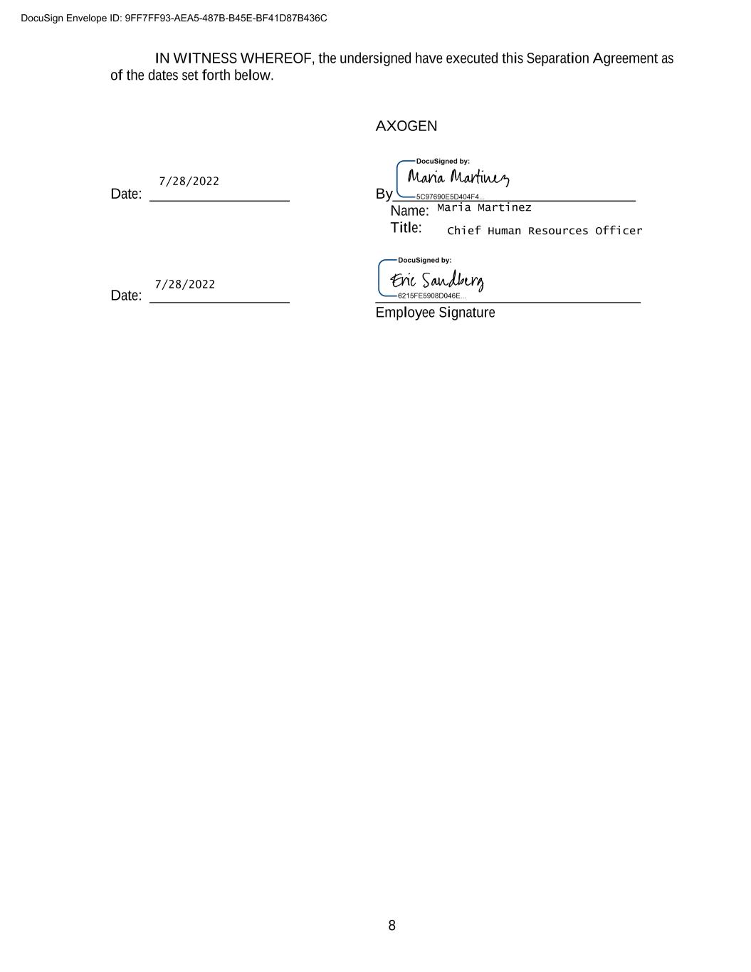 8 IN WITNESS WHEREOF, the undersigned have executed this Separation Agreement as of the dates set forth below. AXOGEN Date: ___________________ By_________________________________ Name: Title: Date: ___________________ ____________________________________ Employee Signature DocuSign Envelope ID: 9FF7FF93-AEA5-487B-B45E-BF41D87B436C 7/28/2022 7/28/2022 Chief Human Resources Officer Maria Martinez