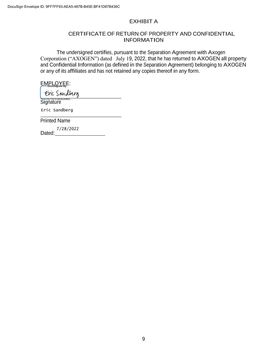 9 EXHIBIT A CERTIFICATE OF RETURN OF PROPERTY AND CONFIDENTIAL INFORMATION The undersigned certifies, pursuant to the Separation Agreement with Axogen Corporation (“AXOGEN”) dated July 19, 2022, that he has returned to AXOGEN all property and Confidential Information (as defined in the Separation Agreement) belonging to AXOGEN or any of its affiliates and has not retained any copies thereof in any form. EMPLOYEE: Signature Printed Name Dated: DocuSign Envelope ID: 9FF7FF93-AEA5-487B-B45E-BF41D87B436C Eric Sandberg 7/28/2022