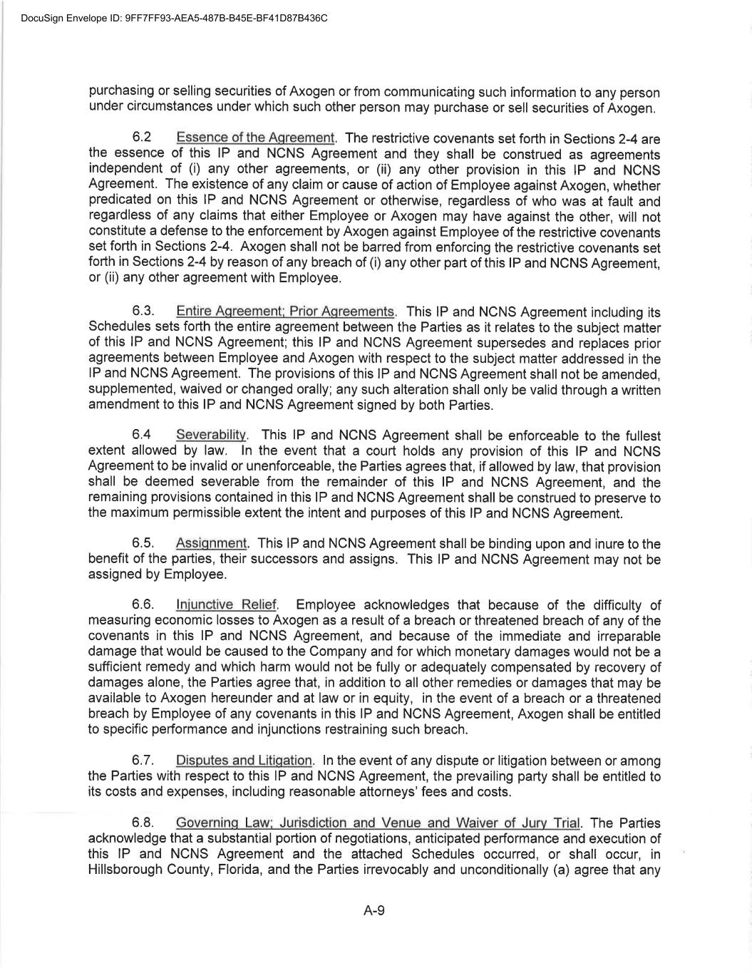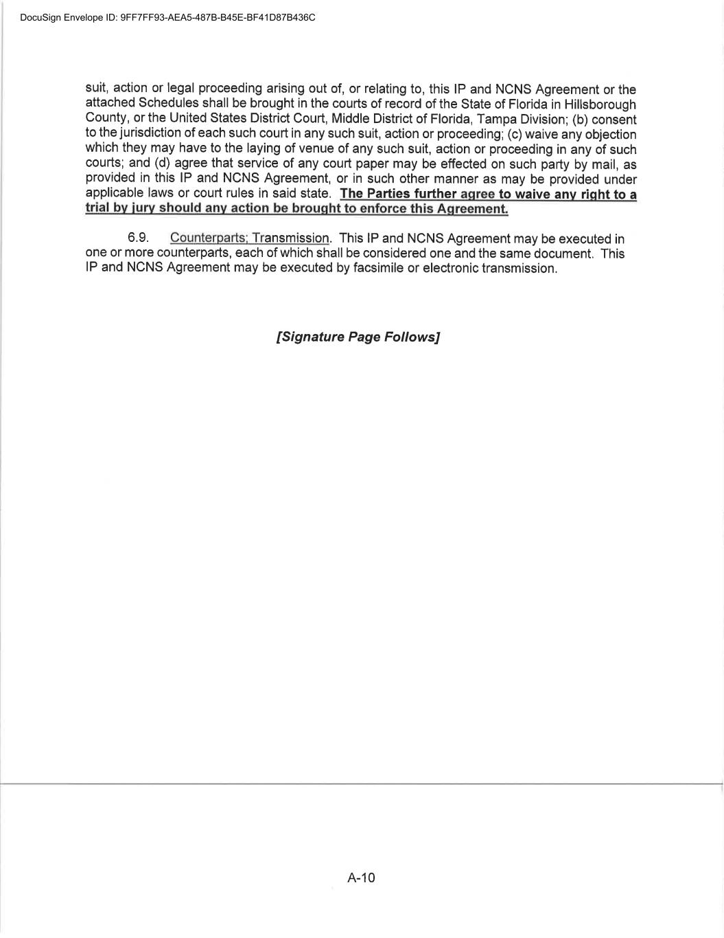 7 11. Non-disparagement. Employee shall not at any time make any voluntary statement of any kind or make any untrue statement while under any compulsory legal process, that is calculated to, or that foreseeably will, damage the business or reputation of the Company, any of its affiliates, or any of their respective directors, officers or employees. Notwithstanding the above, nothing in this Separation Agreement is intended to prohibit good faith reporting of possible violations of applicable law or regulation to any government agency or entity, or in making disclosures where such disclosures are protected under applicable law or regulation. 12. Entire Agreement. This Separation Agreement and exhibits hereto contain all of the terms and conditions agreed upon by the parties with respect to the termination of Employee’s employment and supersedes any prior agreements or understandings between them concerning the subject matter of this Separation Agreement, including, without limitation, any severance pay or salary continuation plan. However, nothing in this Separation Agreement in any way impacts or supersedes the obligations set forth in Restrictive Covenant Agreement (Exhibit A to the Employment Agreement attached hereto as Exhibit B) which shall remain in full force and effect. Any modifications to this Separation Agreement must be in writing and signed by both parties. 13. Counterparts. This Separation Agreement may be executed in counterparts, each of which will be deemed to be an original and all of which together will be deemed to be one and the same instrument. 14. Assignment and Successorship. This Separation Agreement, and the rights and obligations of the Company hereunder, may be assigned by the Company and shall inure to the benefit of and shall be enforceable by any such assignee, as well as any of the Company’s successors in interest or nominees. This Separation Agreement, and the rights and obligations Employee has hereunder, may not be assigned by Employee. The release in this Separation Agreement is binding on Employee’s heirs, executors, administrators, successors, and assigns. 15. Governing Law. This Separation Agreement and exhibits hereto and all transactions contemplated by this Separation Agreement shall be governed by and enforced in accordance with the internal laws of the state of Florida, without regard to principles of conflicts of laws. 16. Jurisdiction and Venue. The Parties acknowledge that a substantial portion of negotiations anticipated performance and execution of this Separation Agreement and the attached Exhibits occurred or shall occur in Alachua County, Florida, and the Parties irrevocably and unconditionally (a) agree that any suit, action or legal proceeding arising out of or relating to this Separation Agreement or that Exhibits hereto, shall be brought in the courts of record of the state of Florida in Alachua County or the US District Court for the Northern District of Florida, Gainesville Division; (b) consent to the jurisdiction of each such court in any such suit, action or proceeding; and (c) waive any objection which they may have to the venue of any such suit, action or proceeding in any of such courts. 17. Severability. The provisions of this Separation Agreement are severable and independent, and if any word, phrase, clause or sentence of it is found to be illegal or unenforceable for any reason, the balance of the Separation Agreement will remain in full force and effect. DocuSign Envelope ID: 9FF7FF93-AEA5-487B-B45E-BF41D87B436C