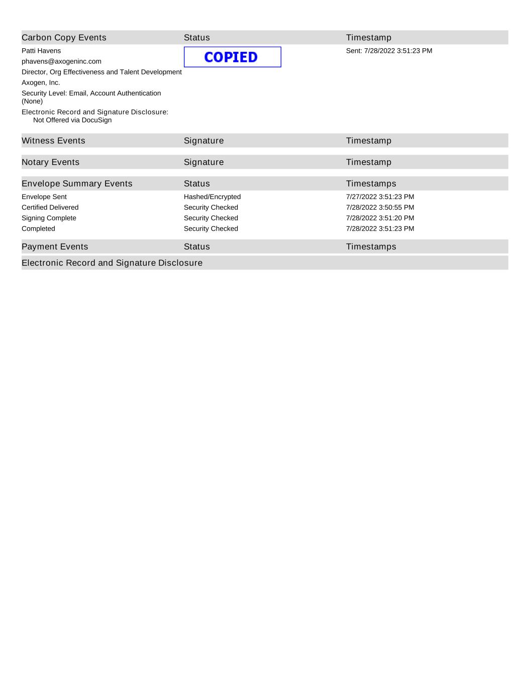 Carbon Copy Events Status Timestamp Patti Havens phavens@axogeninc.com Director, Org Effectiveness and Talent Development Axogen, Inc. Security Level: Email, Account Authentication (None) Sent: 7/28/2022 3:51:23 PM Electronic Record and Signature Disclosure: Not Offered via DocuSign Witness Events Signature Timestamp Notary Events Signature Timestamp Envelope Summary Events Status Timestamps Envelope Sent Hashed/Encrypted 7/27/2022 3:51:23 PM Certified Delivered Security Checked 7/28/2022 3:50:55 PM Signing Complete Security Checked 7/28/2022 3:51:20 PM Completed Security Checked 7/28/2022 3:51:23 PM Payment Events Status Timestamps Electronic Record and Signature Disclosure