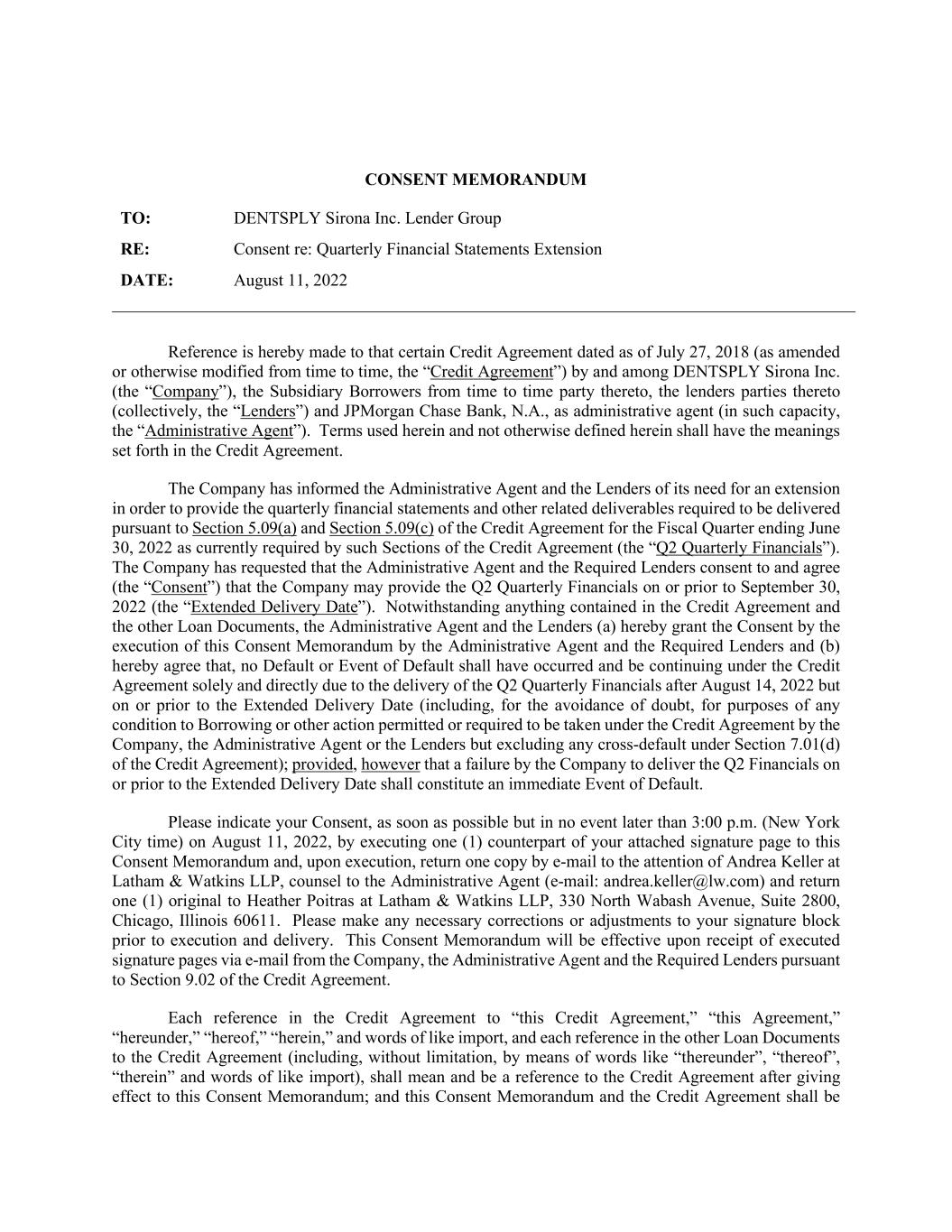 CONSENT MEMORANDUM TO: DENTSPLY Sirona Inc. Lender Group RE: Consent re: Quarterly Financial Statements Extension DATE: August 11, 2022 Reference is hereby made to that certain Credit Agreement dated as of July 27, 2018 (as amended or otherwise modified from time to time, the “Credit Agreement”) by and among DENTSPLY Sirona Inc. (the “Company”), the Subsidiary Borrowers from time to time party thereto, the lenders parties thereto (collectively, the “Lenders”) and JPMorgan Chase Bank, N.A., as administrative agent (in such capacity, the “Administrative Agent”). Terms used herein and not otherwise defined herein shall have the meanings set forth in the Credit Agreement. The Company has informed the Administrative Agent and the Lenders of its need for an extension in order to provide the quarterly financial statements and other related deliverables required to be delivered pursuant to Section 5.09(a) and Section 5.09(c) of the Credit Agreement for the Fiscal Quarter ending June 30, 2022 as currently required by such Sections of the Credit Agreement (the “Q2 Quarterly Financials”). The Company has requested that the Administrative Agent and the Required Lenders consent to and agree (the “Consent”) that the Company may provide the Q2 Quarterly Financials on or prior to September 30, 2022 (the “Extended Delivery Date”). Notwithstanding anything contained in the Credit Agreement and the other Loan Documents, the Administrative Agent and the Lenders (a) hereby grant the Consent by the execution of this Consent Memorandum by the Administrative Agent and the Required Lenders and (b) hereby agree that, no Default or Event of Default shall have occurred and be continuing under the Credit Agreement solely and directly due to the delivery of the Q2 Quarterly Financials after August 14, 2022 but on or prior to the Extended Delivery Date (including, for the avoidance of doubt, for purposes of any condition to Borrowing or other action permitted or required to be taken under the Credit Agreement by the Company, the Administrative Agent or the Lenders but excluding any cross-default under Section 7.01(d) of the Credit Agreement); provided, however that a failure by the Company to deliver the Q2 Financials on or prior to the Extended Delivery Date shall constitute an immediate Event of Default. Please indicate your Consent, as soon as possible but in no event later than 3:00 p.m. (New York City time) on August 11, 2022, by executing one (1) counterpart of your attached signature page to this Consent Memorandum and, upon execution, return one copy by e-mail to the attention of Andrea Keller at Latham & Watkins LLP, counsel to the Administrative Agent (e-mail: andrea.keller@lw.com) and return one (1) original to Heather Poitras at Latham & Watkins LLP, 330 North Wabash Avenue, Suite 2800, Chicago, Illinois 60611. Please make any necessary corrections or adjustments to your signature block prior to execution and delivery. This Consent Memorandum will be effective upon receipt of executed signature pages via e-mail from the Company, the Administrative Agent and the Required Lenders pursuant to Section 9.02 of the Credit Agreement. Each reference in the Credit Agreement to “this Credit Agreement,” “this Agreement,” “hereunder,” “hereof,” “herein,” and words of like import, and each reference in the other Loan Documents to the Credit Agreement (including, without limitation, by means of words like “thereunder”, “thereof”, “therein” and words of like import), shall mean and be a reference to the Credit Agreement after giving effect to this Consent Memorandum; and this Consent Memorandum and the Credit Agreement shall be