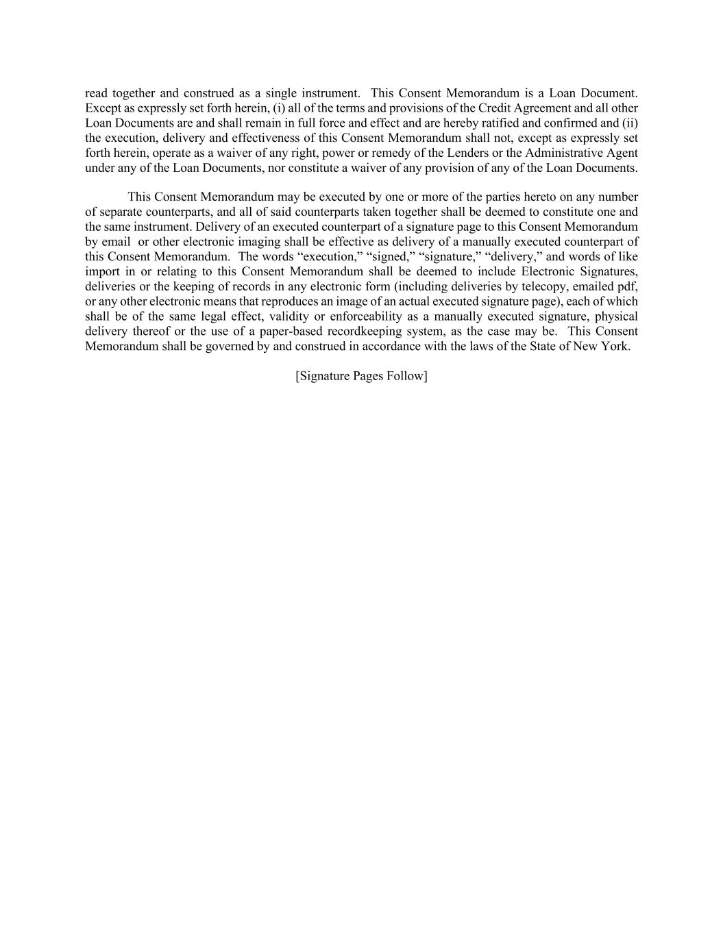 read together and construed as a single instrument. This Consent Memorandum is a Loan Document. Except as expressly set forth herein, (i) all of the terms and provisions of the Credit Agreement and all other Loan Documents are and shall remain in full force and effect and are hereby ratified and confirmed and (ii) the execution, delivery and effectiveness of this Consent Memorandum shall not, except as expressly set forth herein, operate as a waiver of any right, power or remedy of the Lenders or the Administrative Agent under any of the Loan Documents, nor constitute a waiver of any provision of any of the Loan Documents. This Consent Memorandum may be executed by one or more of the parties hereto on any number of separate counterparts, and all of said counterparts taken together shall be deemed to constitute one and the same instrument. Delivery of an executed counterpart of a signature page to this Consent Memorandum by email or other electronic imaging shall be effective as delivery of a manually executed counterpart of this Consent Memorandum. The words “execution,” “signed,” “signature,” “delivery,” and words of like import in or relating to this Consent Memorandum shall be deemed to include Electronic Signatures, deliveries or the keeping of records in any electronic form (including deliveries by telecopy, emailed pdf, or any other electronic means that reproduces an image of an actual executed signature page), each of which shall be of the same legal effect, validity or enforceability as a manually executed signature, physical delivery thereof or the use of a paper-based recordkeeping system, as the case may be. This Consent Memorandum shall be governed by and construed in accordance with the laws of the State of New York. [Signature Pages Follow]