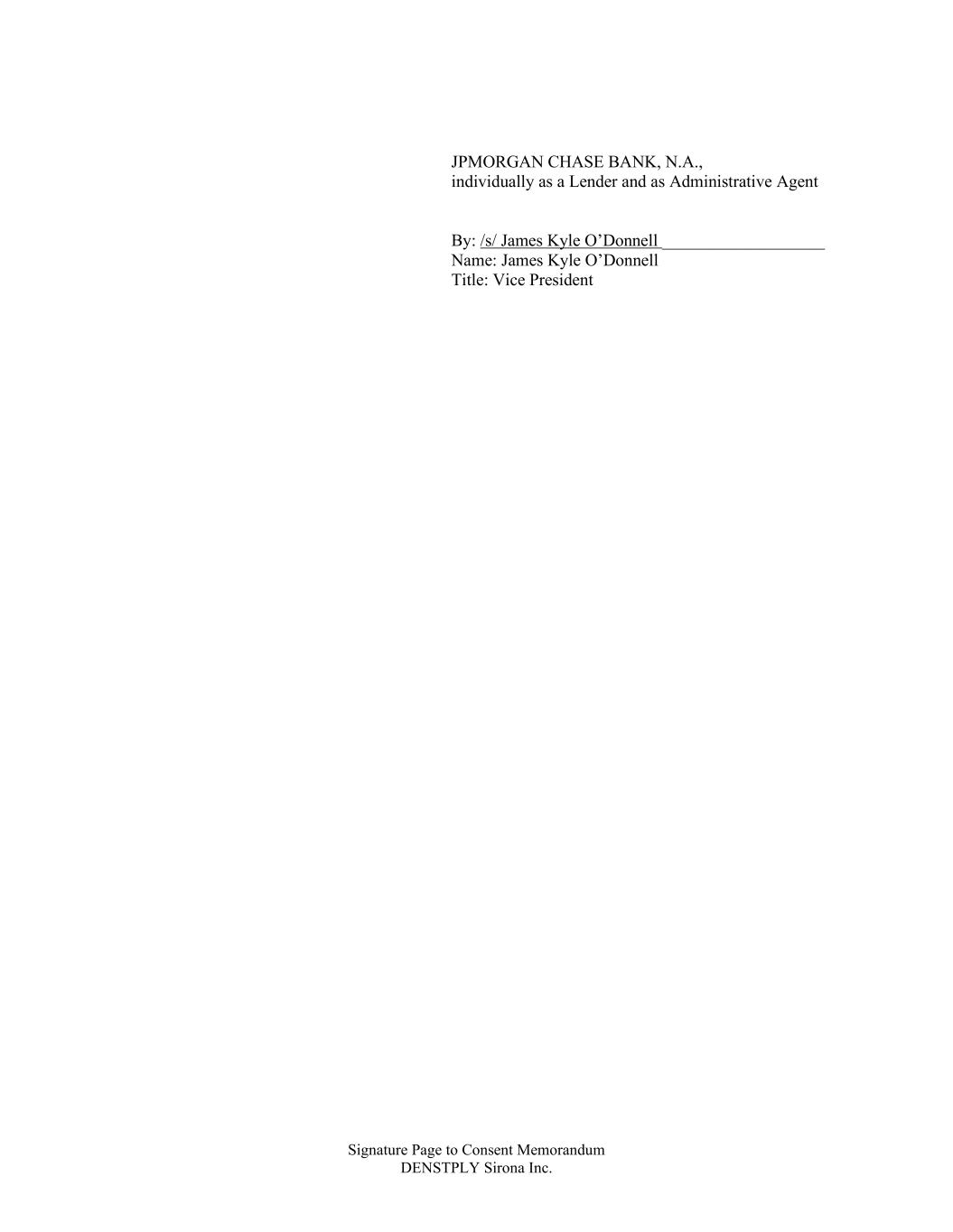 Signature Page to Consent Memorandum DENSTPLY Sirona Inc. JPMORGAN CHASE BANK, N.A., individually as a Lender and as Administrative Agent By: /s/ James Kyle O’Donnell ___________________ Name: James Kyle O’Donnell Title: Vice President