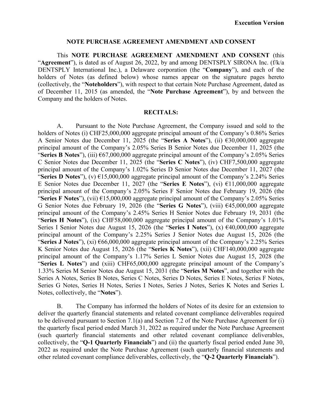 Execution Version NOTE PURCHASE AGREEMENT AMENDMENT AND CONSENT This NOTE PURCHASE AGREEMENT AMENDMENT AND CONSENT (this “Agreement”), is dated as of August 26, 2022, by and among DENTSPLY SIRONA Inc. (f/k/a DENTSPLY International Inc.), a Delaware corporation (the “Company”), and each of the holders of Notes (as defined below) whose names appear on the signature pages hereto (collectively, the “Noteholders”), with respect to that certain Note Purchase Agreement, dated as of December 11, 2015 (as amended, the “Note Purchase Agreement”), by and between the Company and the holders of Notes. RECITALS: A. Pursuant to the Note Purchase Agreement, the Company issued and sold to the holders of Notes (i) CHF25,000,000 aggregate principal amount of the Company’s 0.86% Series A Senior Notes due December 11, 2025 (the “Series A Notes”), (ii) €30,000,000 aggregate principal amount of the Company’s 2.05% Series B Senior Notes due December 11, 2025 (the “Series B Notes”), (iii) €67,000,000 aggregate principal amount of the Company’s 2.05% Series C Senior Notes due December 11, 2025 (the “Series C Notes”), (iv) CHF7,500,000 aggregate principal amount of the Company’s 1.02% Series D Senior Notes due December 11, 2027 (the “Series D Notes”), (v) €15,000,000 aggregate principal amount of the Company’s 2.24% Series E Senior Notes due December 11, 2027 (the “Series E Notes”), (vi) €11,000,000 aggregate principal amount of the Company’s 2.05% Series F Senior Notes due February 19, 2026 (the “Series F Notes”), (vii) €15,000,000 aggregate principal amount of the Company’s 2.05% Series G Senior Notes due February 19, 2026 (the “Series G Notes”), (viii) €45,000,000 aggregate principal amount of the Company’s 2.45% Series H Senior Notes due February 19, 2031 (the “Series H Notes”), (ix) CHF58,000,000 aggregate principal amount of the Company’s 1.01% Series I Senior Notes due August 15, 2026 (the “Series I Notes”), (x) €40,000,000 aggregate principal amount of the Company’s 2.25% Series J Senior Notes due August 15, 2026 (the “Series J Notes”), (xi) €66,000,000 aggregate principal amount of the Company’s 2.25% Series K Senior Notes due August 15, 2026 (the “Series K Notes”), (xii) CHF140,000,000 aggregate principal amount of the Company’s 1.17% Series L Senior Notes due August 15, 2028 (the “Series L Notes”) and (xiii) CHF65,000,000 aggregate principal amount of the Company’s 1.33% Series M Senior Notes due August 15, 2031 (the “Series M Notes”, and together with the Series A Notes, Series B Notes, Series C Notes, Series D Notes, Series E Notes, Series F Notes, Series G Notes, Series H Notes, Series I Notes, Series J Notes, Series K Notes and Series L Notes, collectively, the “Notes”). B. The Company has informed the holders of Notes of its desire for an extension to deliver the quarterly financial statements and related covenant compliance deliverables required to be delivered pursuant to Section 7.1(a) and Section 7.2 of the Note Purchase Agreement for (i) the quarterly fiscal period ended March 31, 2022 as required under the Note Purchase Agreement (such quarterly financial statements and other related covenant compliance deliverables, collectively, the “Q-1 Quarterly Financials”) and (ii) the quarterly fiscal period ended June 30, 2022 as required under the Note Purchase Agreement (such quarterly financial statements and other related covenant compliance deliverables, collectively, the “Q-2 Quarterly Financials”).