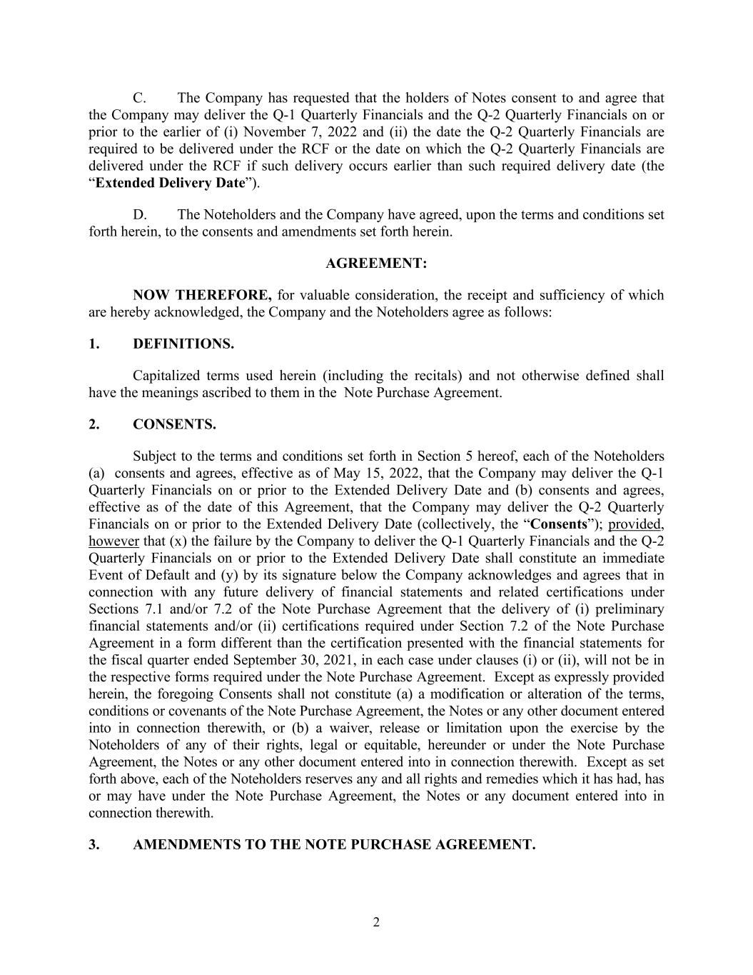 2 C. The Company has requested that the holders of Notes consent to and agree that the Company may deliver the Q-1 Quarterly Financials and the Q-2 Quarterly Financials on or prior to the earlier of (i) November 7, 2022 and (ii) the date the Q-2 Quarterly Financials are required to be delivered under the RCF or the date on which the Q-2 Quarterly Financials are delivered under the RCF if such delivery occurs earlier than such required delivery date (the “Extended Delivery Date”). D. The Noteholders and the Company have agreed, upon the terms and conditions set forth herein, to the consents and amendments set forth herein. AGREEMENT: NOW THEREFORE, for valuable consideration, the receipt and sufficiency of which are hereby acknowledged, the Company and the Noteholders agree as follows: 1. DEFINITIONS. Capitalized terms used herein (including the recitals) and not otherwise defined shall have the meanings ascribed to them in the Note Purchase Agreement. 2. CONSENTS. Subject to the terms and conditions set forth in Section 5 hereof, each of the Noteholders (a) consents and agrees, effective as of May 15, 2022, that the Company may deliver the Q-1 Quarterly Financials on or prior to the Extended Delivery Date and (b) consents and agrees, effective as of the date of this Agreement, that the Company may deliver the Q-2 Quarterly Financials on or prior to the Extended Delivery Date (collectively, the “Consents”); provided, however that (x) the failure by the Company to deliver the Q-1 Quarterly Financials and the Q-2 Quarterly Financials on or prior to the Extended Delivery Date shall constitute an immediate Event of Default and (y) by its signature below the Company acknowledges and agrees that in connection with any future delivery of financial statements and related certifications under Sections 7.1 and/or 7.2 of the Note Purchase Agreement that the delivery of (i) preliminary financial statements and/or (ii) certifications required under Section 7.2 of the Note Purchase Agreement in a form different than the certification presented with the financial statements for the fiscal quarter ended September 30, 2021, in each case under clauses (i) or (ii), will not be in the respective forms required under the Note Purchase Agreement. Except as expressly provided herein, the foregoing Consents shall not constitute (a) a modification or alteration of the terms, conditions or covenants of the Note Purchase Agreement, the Notes or any other document entered into in connection therewith, or (b) a waiver, release or limitation upon the exercise by the Noteholders of any of their rights, legal or equitable, hereunder or under the Note Purchase Agreement, the Notes or any other document entered into in connection therewith. Except as set forth above, each of the Noteholders reserves any and all rights and remedies which it has had, has or may have under the Note Purchase Agreement, the Notes or any document entered into in connection therewith. 3. AMENDMENTS TO THE NOTE PURCHASE AGREEMENT.