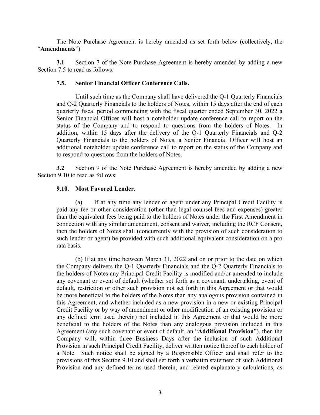 3 The Note Purchase Agreement is hereby amended as set forth below (collectively, the “Amendments”): 3.1 Section 7 of the Note Purchase Agreement is hereby amended by adding a new Section 7.5 to read as follows: 7.5. Senior Financial Officer Conference Calls. Until such time as the Company shall have delivered the Q-1 Quarterly Financials and Q-2 Quarterly Financials to the holders of Notes, within 15 days after the end of each quarterly fiscal period commencing with the fiscal quarter ended September 30, 2022 a Senior Financial Officer will host a noteholder update conference call to report on the status of the Company and to respond to questions from the holders of Notes. In addition, within 15 days after the delivery of the Q-1 Quarterly Financials and Q-2 Quarterly Financials to the holders of Notes, a Senior Financial Officer will host an additional noteholder update conference call to report on the status of the Company and to respond to questions from the holders of Notes. 3.2 Section 9 of the Note Purchase Agreement is hereby amended by adding a new Section 9.10 to read as follows: 9.10. Most Favored Lender. (a) If at any time any lender or agent under any Principal Credit Facility is paid any fee or other consideration (other than legal counsel fees and expenses) greater than the equivalent fees being paid to the holders of Notes under the First Amendment in connection with any similar amendment, consent and waiver, including the RCF Consent, then the holders of Notes shall (concurrently with the provision of such consideration to such lender or agent) be provided with such additional equivalent consideration on a pro rata basis. (b) If at any time between March 31, 2022 and on or prior to the date on which the Company delivers the Q-1 Quarterly Financials and the Q-2 Quarterly Financials to the holders of Notes any Principal Credit Facility is modified and/or amended to include any covenant or event of default (whether set forth as a covenant, undertaking, event of default, restriction or other such provision not set forth in this Agreement or that would be more beneficial to the holders of the Notes than any analogous provision contained in this Agreement, and whether included as a new provision in a new or existing Principal Credit Facility or by way of amendment or other modification of an existing provision or any defined term used therein) not included in this Agreement or that would be more beneficial to the holders of the Notes than any analogous provision included in this Agreement (any such covenant or event of default, an “Additional Provision”), then the Company will, within three Business Days after the inclusion of such Additional Provision in such Principal Credit Facility, deliver written notice thereof to each holder of a Note. Such notice shall be signed by a Responsible Officer and shall refer to the provisions of this Section 9.10 and shall set forth a verbatim statement of such Additional Provision and any defined terms used therein, and related explanatory calculations, as