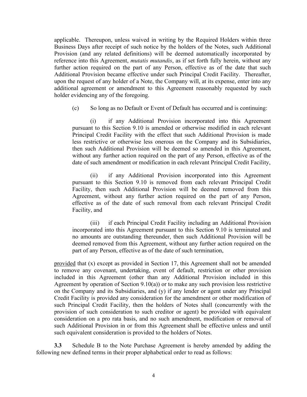 4 applicable. Thereupon, unless waived in writing by the Required Holders within three Business Days after receipt of such notice by the holders of the Notes, such Additional Provision (and any related definitions) will be deemed automatically incorporated by reference into this Agreement, mutatis mutandis, as if set forth fully herein, without any further action required on the part of any Person, effective as of the date that such Additional Provision became effective under such Principal Credit Facility. Thereafter, upon the request of any holder of a Note, the Company will, at its expense, enter into any additional agreement or amendment to this Agreement reasonably requested by such holder evidencing any of the foregoing. (c) So long as no Default or Event of Default has occurred and is continuing: (i) if any Additional Provision incorporated into this Agreement pursuant to this Section 9.10 is amended or otherwise modified in each relevant Principal Credit Facility with the effect that such Additional Provision is made less restrictive or otherwise less onerous on the Company and its Subsidiaries, then such Additional Provision will be deemed so amended in this Agreement, without any further action required on the part of any Person, effective as of the date of such amendment or modification in each relevant Principal Credit Facility, (ii) if any Additional Provision incorporated into this Agreement pursuant to this Section 9.10 is removed from each relevant Principal Credit Facility, then such Additional Provision will be deemed removed from this Agreement, without any further action required on the part of any Person, effective as of the date of such removal from each relevant Principal Credit Facility, and (iii) if each Principal Credit Facility including an Additional Provision incorporated into this Agreement pursuant to this Section 9.10 is terminated and no amounts are outstanding thereunder, then such Additional Provision will be deemed removed from this Agreement, without any further action required on the part of any Person, effective as of the date of such termination, provided that (x) except as provided in Section 17, this Agreement shall not be amended to remove any covenant, undertaking, event of default, restriction or other provision included in this Agreement (other than any Additional Provision included in this Agreement by operation of Section 9.10(a)) or to make any such provision less restrictive on the Company and its Subsidiaries, and (y) if any lender or agent under any Principal Credit Facility is provided any consideration for the amendment or other modification of such Principal Credit Facility, then the holders of Notes shall (concurrently with the provision of such consideration to such creditor or agent) be provided with equivalent consideration on a pro rata basis, and no such amendment, modification or removal of such Additional Provision in or from this Agreement shall be effective unless and until such equivalent consideration is provided to the holders of Notes. 3.3 Schedule B to the Note Purchase Agreement is hereby amended by adding the following new defined terms in their proper alphabetical order to read as follows: