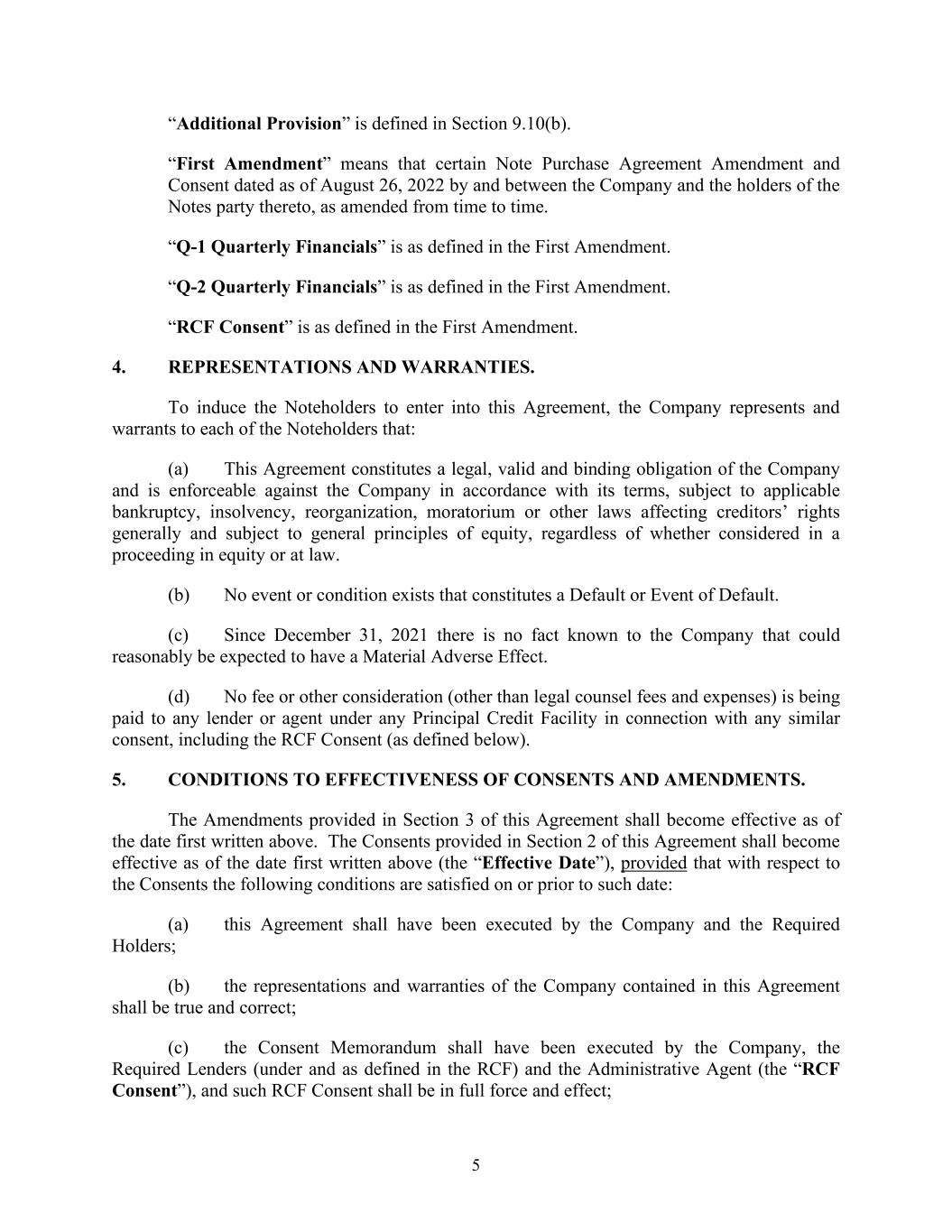 5 “Additional Provision” is defined in Section 9.10(b). “First Amendment” means that certain Note Purchase Agreement Amendment and Consent dated as of August 26, 2022 by and between the Company and the holders of the Notes party thereto, as amended from time to time. “Q-1 Quarterly Financials” is as defined in the First Amendment. “Q-2 Quarterly Financials” is as defined in the First Amendment. “RCF Consent” is as defined in the First Amendment. 4. REPRESENTATIONS AND WARRANTIES. To induce the Noteholders to enter into this Agreement, the Company represents and warrants to each of the Noteholders that: (a) This Agreement constitutes a legal, valid and binding obligation of the Company and is enforceable against the Company in accordance with its terms, subject to applicable bankruptcy, insolvency, reorganization, moratorium or other laws affecting creditors’ rights generally and subject to general principles of equity, regardless of whether considered in a proceeding in equity or at law. (b) No event or condition exists that constitutes a Default or Event of Default. (c) Since December 31, 2021 there is no fact known to the Company that could reasonably be expected to have a Material Adverse Effect. (d) No fee or other consideration (other than legal counsel fees and expenses) is being paid to any lender or agent under any Principal Credit Facility in connection with any similar consent, including the RCF Consent (as defined below). 5. CONDITIONS TO EFFECTIVENESS OF CONSENTS AND AMENDMENTS. The Amendments provided in Section 3 of this Agreement shall become effective as of the date first written above. The Consents provided in Section 2 of this Agreement shall become effective as of the date first written above (the “Effective Date”), provided that with respect to the Consents the following conditions are satisfied on or prior to such date: (a) this Agreement shall have been executed by the Company and the Required Holders; (b) the representations and warranties of the Company contained in this Agreement shall be true and correct; (c) the Consent Memorandum shall have been executed by the Company, the Required Lenders (under and as defined in the RCF) and the Administrative Agent (the “RCF Consent”), and such RCF Consent shall be in full force and effect;