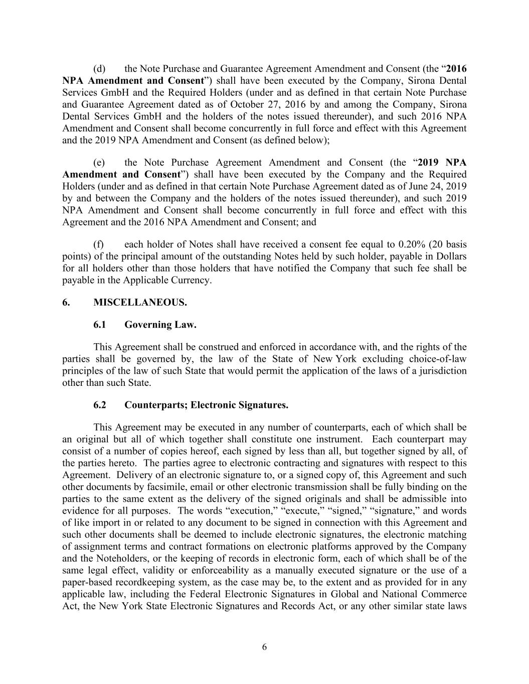 6 (d) the Note Purchase and Guarantee Agreement Amendment and Consent (the “2016 NPA Amendment and Consent”) shall have been executed by the Company, Sirona Dental Services GmbH and the Required Holders (under and as defined in that certain Note Purchase and Guarantee Agreement dated as of October 27, 2016 by and among the Company, Sirona Dental Services GmbH and the holders of the notes issued thereunder), and such 2016 NPA Amendment and Consent shall become concurrently in full force and effect with this Agreement and the 2019 NPA Amendment and Consent (as defined below); (e) the Note Purchase Agreement Amendment and Consent (the “2019 NPA Amendment and Consent”) shall have been executed by the Company and the Required Holders (under and as defined in that certain Note Purchase Agreement dated as of June 24, 2019 by and between the Company and the holders of the notes issued thereunder), and such 2019 NPA Amendment and Consent shall become concurrently in full force and effect with this Agreement and the 2016 NPA Amendment and Consent; and (f) each holder of Notes shall have received a consent fee equal to 0.20% (20 basis points) of the principal amount of the outstanding Notes held by such holder, payable in Dollars for all holders other than those holders that have notified the Company that such fee shall be payable in the Applicable Currency. 6. MISCELLANEOUS. 6.1 Governing Law. This Agreement shall be construed and enforced in accordance with, and the rights of the parties shall be governed by, the law of the State of New York excluding choice-of-law principles of the law of such State that would permit the application of the laws of a jurisdiction other than such State. 6.2 Counterparts; Electronic Signatures. This Agreement may be executed in any number of counterparts, each of which shall be an original but all of which together shall constitute one instrument. Each counterpart may consist of a number of copies hereof, each signed by less than all, but together signed by all, of the parties hereto. The parties agree to electronic contracting and signatures with respect to this Agreement. Delivery of an electronic signature to, or a signed copy of, this Agreement and such other documents by facsimile, email or other electronic transmission shall be fully binding on the parties to the same extent as the delivery of the signed originals and shall be admissible into evidence for all purposes. The words “execution,” “execute,” “signed,” “signature,” and words of like import in or related to any document to be signed in connection with this Agreement and such other documents shall be deemed to include electronic signatures, the electronic matching of assignment terms and contract formations on electronic platforms approved by the Company and the Noteholders, or the keeping of records in electronic form, each of which shall be of the same legal effect, validity or enforceability as a manually executed signature or the use of a paper-based recordkeeping system, as the case may be, to the extent and as provided for in any applicable law, including the Federal Electronic Signatures in Global and National Commerce Act, the New York State Electronic Signatures and Records Act, or any other similar state laws