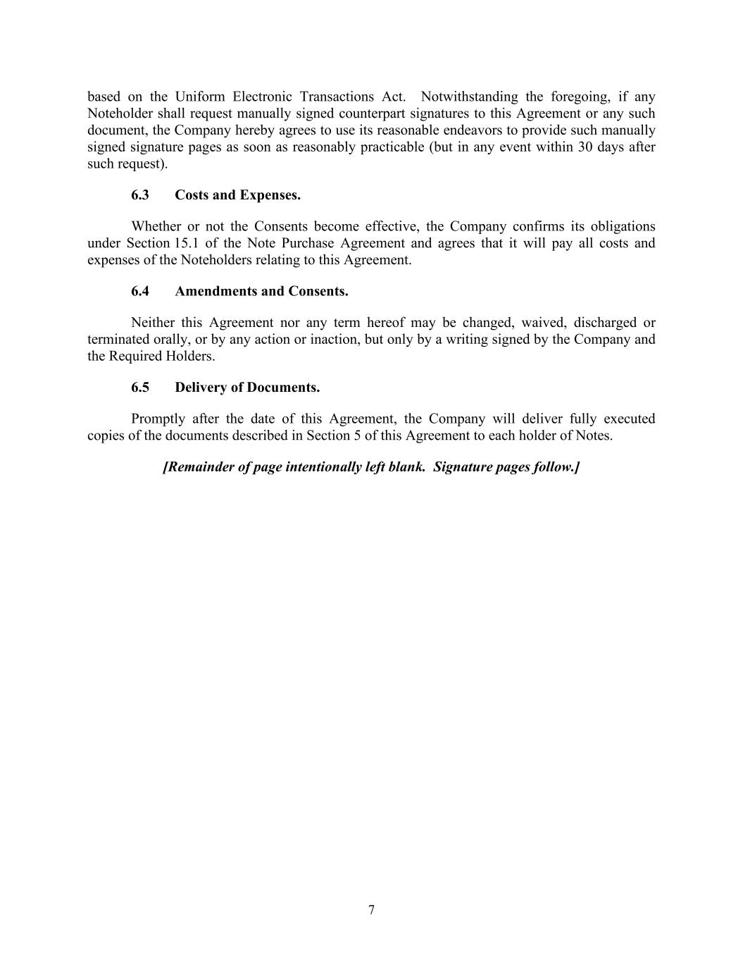7 based on the Uniform Electronic Transactions Act. Notwithstanding the foregoing, if any Noteholder shall request manually signed counterpart signatures to this Agreement or any such document, the Company hereby agrees to use its reasonable endeavors to provide such manually signed signature pages as soon as reasonably practicable (but in any event within 30 days after such request). 6.3 Costs and Expenses. Whether or not the Consents become effective, the Company confirms its obligations under Section 15.1 of the Note Purchase Agreement and agrees that it will pay all costs and expenses of the Noteholders relating to this Agreement. 6.4 Amendments and Consents. Neither this Agreement nor any term hereof may be changed, waived, discharged or terminated orally, or by any action or inaction, but only by a writing signed by the Company and the Required Holders. 6.5 Delivery of Documents. Promptly after the date of this Agreement, the Company will deliver fully executed copies of the documents described in Section 5 of this Agreement to each holder of Notes. [Remainder of page intentionally left blank. Signature pages follow.]