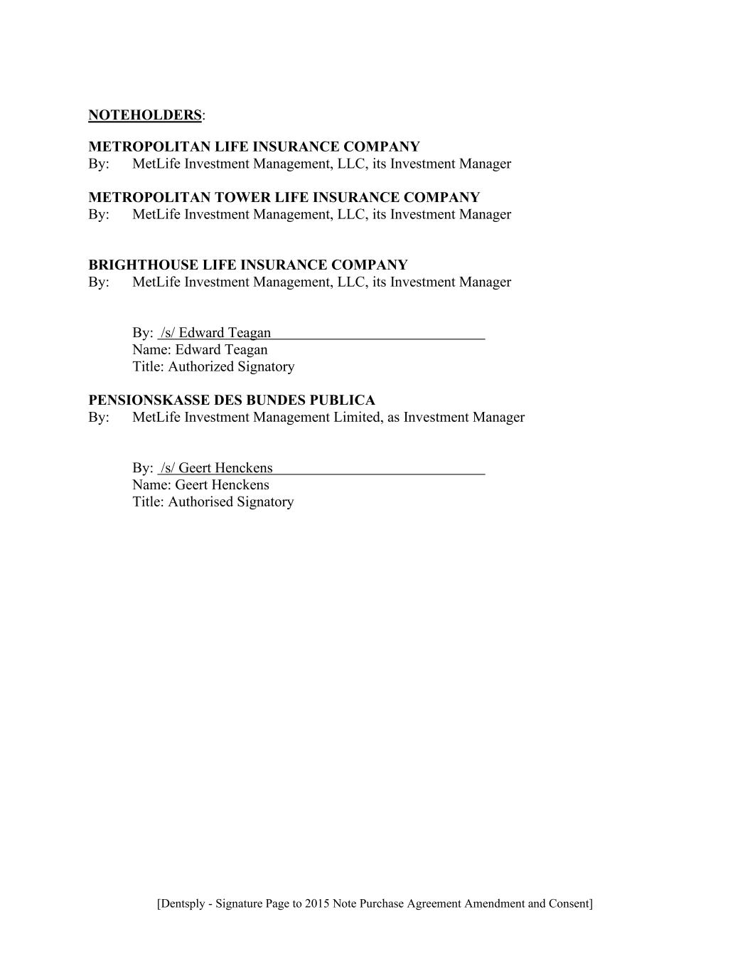 [Dentsply - Signature Page to 2015 Note Purchase Agreement Amendment and Consent] NOTEHOLDERS: METROPOLITAN LIFE INSURANCE COMPANY By: MetLife Investment Management, LLC, its Investment Manager METROPOLITAN TOWER LIFE INSURANCE COMPANY By: MetLife Investment Management, LLC, its Investment Manager BRIGHTHOUSE LIFE INSURANCE COMPANY By: MetLife Investment Management, LLC, its Investment Manager By: /s/ Edward Teagan Name: Edward Teagan Title: Authorized Signatory PENSIONSKASSE DES BUNDES PUBLICA By: MetLife Investment Management Limited, as Investment Manager By: /s/ Geert Henckens Name: Geert Henckens Title: Authorised Signatory