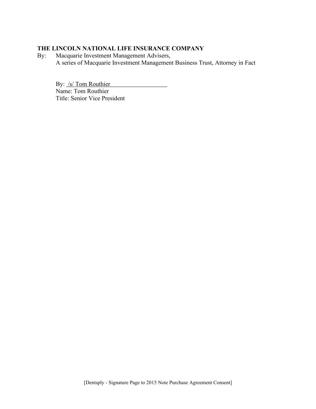 [Dentsply - Signature Page to 2015 Note Purchase Agreement Consent] THE LINCOLN NATIONAL LIFE INSURANCE COMPANY By: Macquarie Investment Management Advisers, A series of Macquarie Investment Management Business Trust, Attorney in Fact By: /s/ Tom Routhier Name: Tom Routhier Title: Senior Vice President