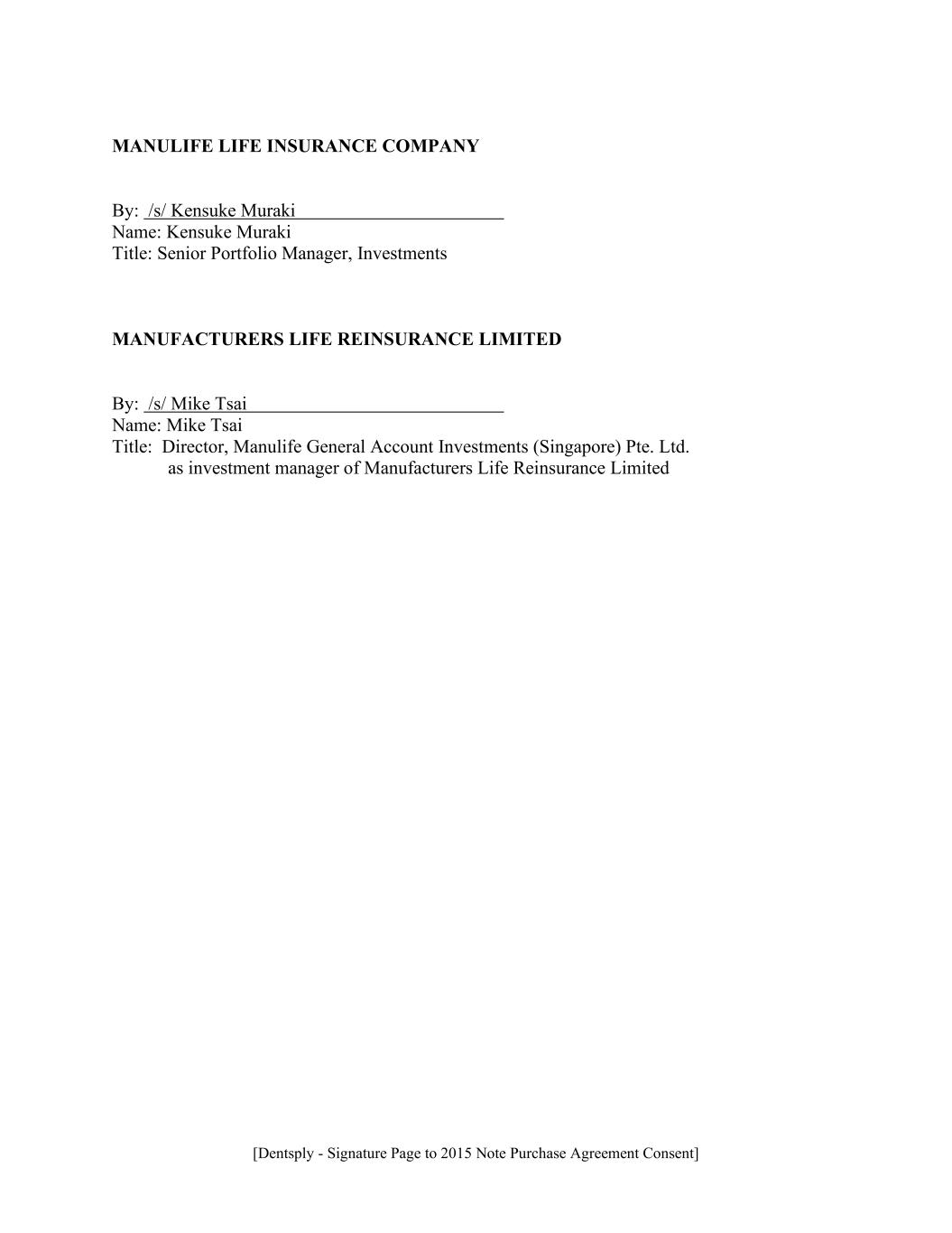 [Dentsply - Signature Page to 2015 Note Purchase Agreement Consent] MANULIFE LIFE INSURANCE COMPANY By: /s/ Kensuke Muraki Name: Kensuke Muraki Title: Senior Portfolio Manager, Investments MANUFACTURERS LIFE REINSURANCE LIMITED By: /s/ Mike Tsai Name: Mike Tsai Title: Director, Manulife General Account Investments (Singapore) Pte. Ltd. as investment manager of Manufacturers Life Reinsurance Limited