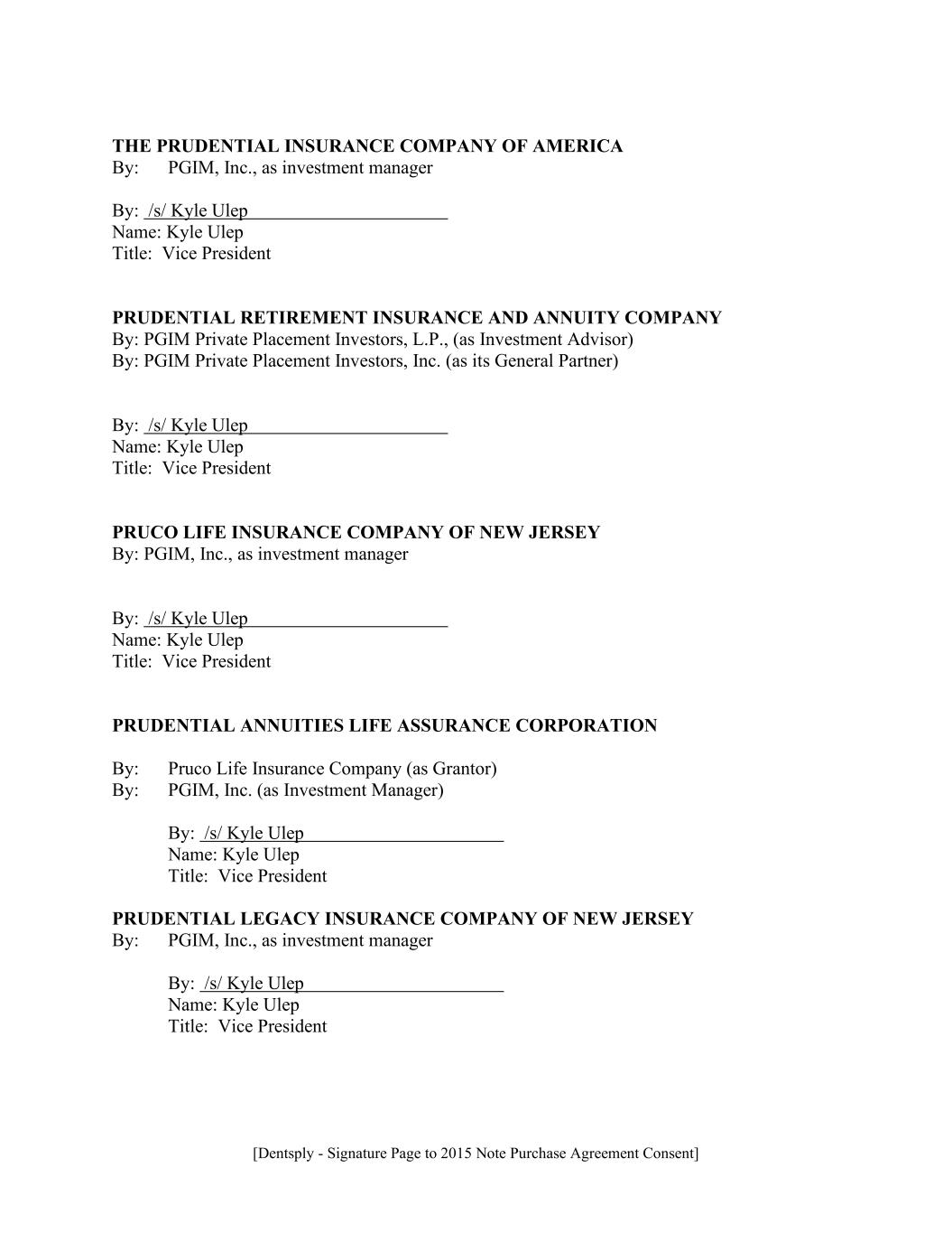 [Dentsply - Signature Page to 2015 Note Purchase Agreement Consent] THE PRUDENTIAL INSURANCE COMPANY OF AMERICA By: PGIM, Inc., as investment manager By: /s/ Kyle Ulep Name: Kyle Ulep Title: Vice President PRUDENTIAL RETIREMENT INSURANCE AND ANNUITY COMPANY By: PGIM Private Placement Investors, L.P., (as Investment Advisor) By: PGIM Private Placement Investors, Inc. (as its General Partner) By: /s/ Kyle Ulep Name: Kyle Ulep Title: Vice President PRUCO LIFE INSURANCE COMPANY OF NEW JERSEY By: PGIM, Inc., as investment manager By: /s/ Kyle Ulep Name: Kyle Ulep Title: Vice President PRUDENTIAL ANNUITIES LIFE ASSURANCE CORPORATION By: Pruco Life Insurance Company (as Grantor) By: PGIM, Inc. (as Investment Manager) By: /s/ Kyle Ulep Name: Kyle Ulep Title: Vice President PRUDENTIAL LEGACY INSURANCE COMPANY OF NEW JERSEY By: PGIM, Inc., as investment manager By: /s/ Kyle Ulep Name: Kyle Ulep Title: Vice President