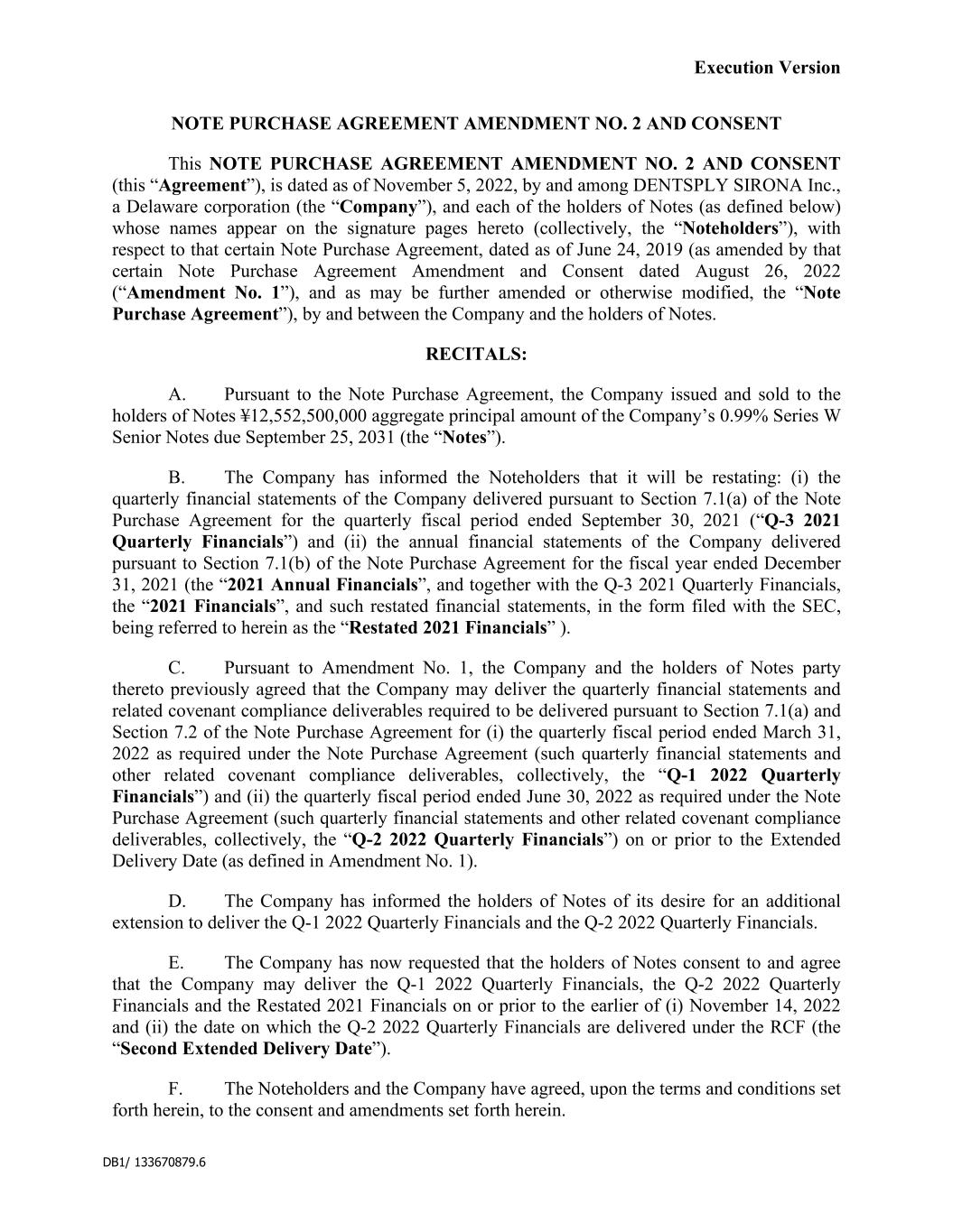 Execution Version DB1/ 133670879.6 NOTE PURCHASE AGREEMENT AMENDMENT NO. 2 AND CONSENT This NOTE PURCHASE AGREEMENT AMENDMENT NO. 2 AND CONSENT (this “Agreement”), is dated as of November 5, 2022, by and among DENTSPLY SIRONA Inc., a Delaware corporation (the “Company”), and each of the holders of Notes (as defined below) whose names appear on the signature pages hereto (collectively, the “Noteholders”), with respect to that certain Note Purchase Agreement, dated as of June 24, 2019 (as amended by that certain Note Purchase Agreement Amendment and Consent dated August 26, 2022 (“Amendment No. 1”), and as may be further amended or otherwise modified, the “Note Purchase Agreement”), by and between the Company and the holders of Notes. RECITALS: A. Pursuant to the Note Purchase Agreement, the Company issued and sold to the holders of Notes ¥12,552,500,000 aggregate principal amount of the Company’s 0.99% Series W Senior Notes due September 25, 2031 (the “Notes”). B. The Company has informed the Noteholders that it will be restating: (i) the quarterly financial statements of the Company delivered pursuant to Section 7.1(a) of the Note Purchase Agreement for the quarterly fiscal period ended September 30, 2021 (“Q-3 2021 Quarterly Financials”) and (ii) the annual financial statements of the Company delivered pursuant to Section 7.1(b) of the Note Purchase Agreement for the fiscal year ended December 31, 2021 (the “2021 Annual Financials”, and together with the Q-3 2021 Quarterly Financials, the “2021 Financials”, and such restated financial statements, in the form filed with the SEC, being referred to herein as the “Restated 2021 Financials” ). C. Pursuant to Amendment No. 1, the Company and the holders of Notes party thereto previously agreed that the Company may deliver the quarterly financial statements and related covenant compliance deliverables required to be delivered pursuant to Section 7.1(a) and Section 7.2 of the Note Purchase Agreement for (i) the quarterly fiscal period ended March 31, 2022 as required under the Note Purchase Agreement (such quarterly financial statements and other related covenant compliance deliverables, collectively, the “Q-1 2022 Quarterly Financials”) and (ii) the quarterly fiscal period ended June 30, 2022 as required under the Note Purchase Agreement (such quarterly financial statements and other related covenant compliance deliverables, collectively, the “Q-2 2022 Quarterly Financials”) on or prior to the Extended Delivery Date (as defined in Amendment No. 1). D. The Company has informed the holders of Notes of its desire for an additional extension to deliver the Q-1 2022 Quarterly Financials and the Q-2 2022 Quarterly Financials. E. The Company has now requested that the holders of Notes consent to and agree that the Company may deliver the Q-1 2022 Quarterly Financials, the Q-2 2022 Quarterly Financials and the Restated 2021 Financials on or prior to the earlier of (i) November 14, 2022 and (ii) the date on which the Q-2 2022 Quarterly Financials are delivered under the RCF (the “Second Extended Delivery Date”). F. The Noteholders and the Company have agreed, upon the terms and conditions set forth herein, to the consent and amendments set forth herein.