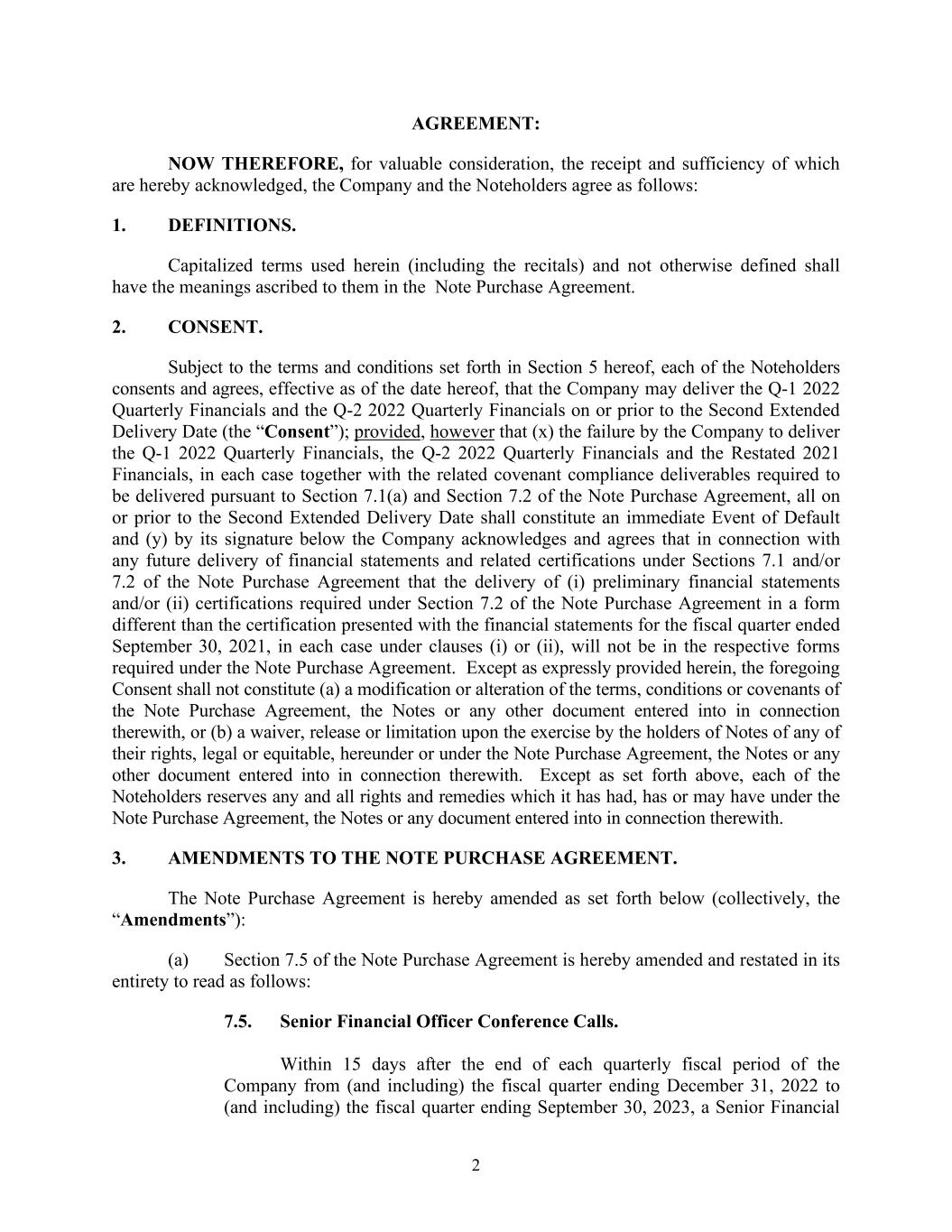 2 AGREEMENT: NOW THEREFORE, for valuable consideration, the receipt and sufficiency of which are hereby acknowledged, the Company and the Noteholders agree as follows: 1. DEFINITIONS. Capitalized terms used herein (including the recitals) and not otherwise defined shall have the meanings ascribed to them in the Note Purchase Agreement. 2. CONSENT. Subject to the terms and conditions set forth in Section 5 hereof, each of the Noteholders consents and agrees, effective as of the date hereof, that the Company may deliver the Q-1 2022 Quarterly Financials and the Q-2 2022 Quarterly Financials on or prior to the Second Extended Delivery Date (the “Consent”); provided, however that (x) the failure by the Company to deliver the Q-1 2022 Quarterly Financials, the Q-2 2022 Quarterly Financials and the Restated 2021 Financials, in each case together with the related covenant compliance deliverables required to be delivered pursuant to Section 7.1(a) and Section 7.2 of the Note Purchase Agreement, all on or prior to the Second Extended Delivery Date shall constitute an immediate Event of Default and (y) by its signature below the Company acknowledges and agrees that in connection with any future delivery of financial statements and related certifications under Sections 7.1 and/or 7.2 of the Note Purchase Agreement that the delivery of (i) preliminary financial statements and/or (ii) certifications required under Section 7.2 of the Note Purchase Agreement in a form different than the certification presented with the financial statements for the fiscal quarter ended September 30, 2021, in each case under clauses (i) or (ii), will not be in the respective forms required under the Note Purchase Agreement. Except as expressly provided herein, the foregoing Consent shall not constitute (a) a modification or alteration of the terms, conditions or covenants of the Note Purchase Agreement, the Notes or any other document entered into in connection therewith, or (b) a waiver, release or limitation upon the exercise by the holders of Notes of any of their rights, legal or equitable, hereunder or under the Note Purchase Agreement, the Notes or any other document entered into in connection therewith. Except as set forth above, each of the Noteholders reserves any and all rights and remedies which it has had, has or may have under the Note Purchase Agreement, the Notes or any document entered into in connection therewith. 3. AMENDMENTS TO THE NOTE PURCHASE AGREEMENT. The Note Purchase Agreement is hereby amended as set forth below (collectively, the “Amendments”): (a) Section 7.5 of the Note Purchase Agreement is hereby amended and restated in its entirety to read as follows: 7.5. Senior Financial Officer Conference Calls. Within 15 days after the end of each quarterly fiscal period of the Company from (and including) the fiscal quarter ending December 31, 2022 to (and including) the fiscal quarter ending September 30, 2023, a Senior Financial