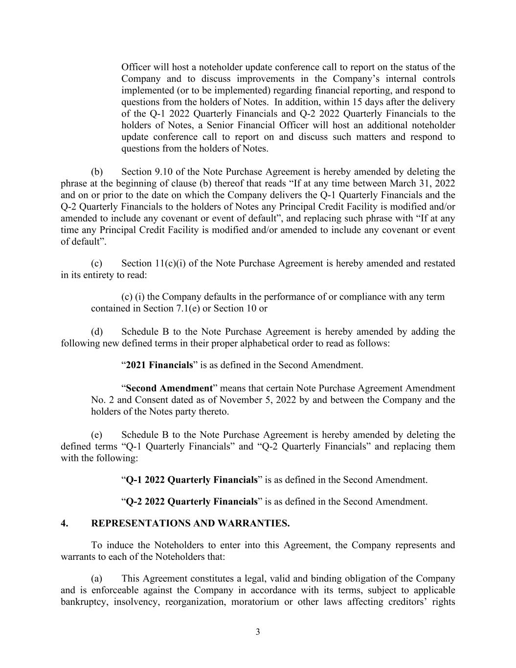3 Officer will host a noteholder update conference call to report on the status of the Company and to discuss improvements in the Company’s internal controls implemented (or to be implemented) regarding financial reporting, and respond to questions from the holders of Notes. In addition, within 15 days after the delivery of the Q-1 2022 Quarterly Financials and Q-2 2022 Quarterly Financials to the holders of Notes, a Senior Financial Officer will host an additional noteholder update conference call to report on and discuss such matters and respond to questions from the holders of Notes. (b) Section 9.10 of the Note Purchase Agreement is hereby amended by deleting the phrase at the beginning of clause (b) thereof that reads “If at any time between March 31, 2022 and on or prior to the date on which the Company delivers the Q-1 Quarterly Financials and the Q-2 Quarterly Financials to the holders of Notes any Principal Credit Facility is modified and/or amended to include any covenant or event of default”, and replacing such phrase with “If at any time any Principal Credit Facility is modified and/or amended to include any covenant or event of default”. (c) Section 11(c)(i) of the Note Purchase Agreement is hereby amended and restated in its entirety to read: (c) (i) the Company defaults in the performance of or compliance with any term contained in Section 7.1(e) or Section 10 or (d) Schedule B to the Note Purchase Agreement is hereby amended by adding the following new defined terms in their proper alphabetical order to read as follows: “2021 Financials” is as defined in the Second Amendment. “Second Amendment” means that certain Note Purchase Agreement Amendment No. 2 and Consent dated as of November 5, 2022 by and between the Company and the holders of the Notes party thereto. (e) Schedule B to the Note Purchase Agreement is hereby amended by deleting the defined terms “Q-1 Quarterly Financials” and “Q-2 Quarterly Financials” and replacing them with the following: “Q-1 2022 Quarterly Financials” is as defined in the Second Amendment. “Q-2 2022 Quarterly Financials” is as defined in the Second Amendment. 4. REPRESENTATIONS AND WARRANTIES. To induce the Noteholders to enter into this Agreement, the Company represents and warrants to each of the Noteholders that: (a) This Agreement constitutes a legal, valid and binding obligation of the Company and is enforceable against the Company in accordance with its terms, subject to applicable bankruptcy, insolvency, reorganization, moratorium or other laws affecting creditors’ rights