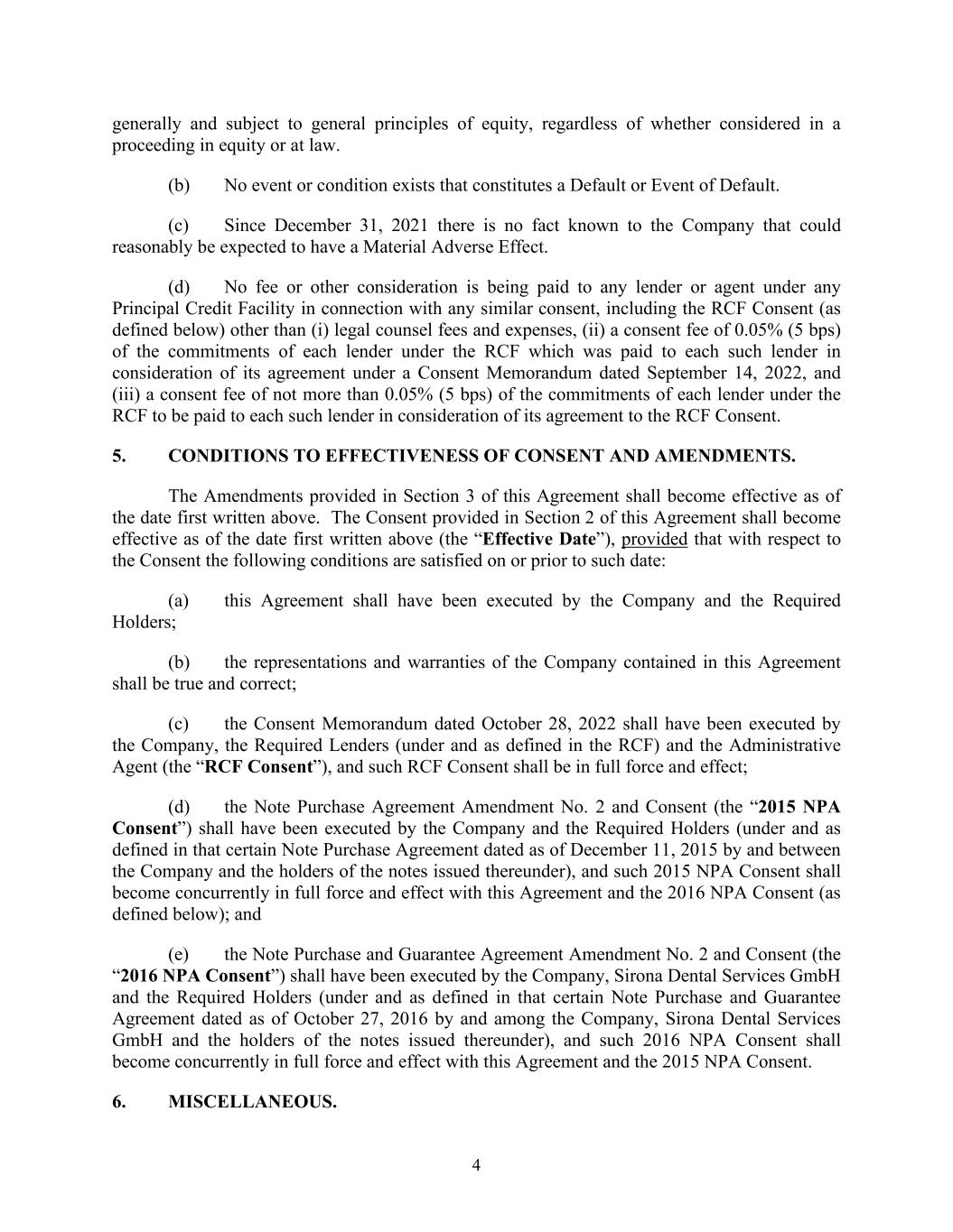 4 generally and subject to general principles of equity, regardless of whether considered in a proceeding in equity or at law. (b) No event or condition exists that constitutes a Default or Event of Default. (c) Since December 31, 2021 there is no fact known to the Company that could reasonably be expected to have a Material Adverse Effect. (d) No fee or other consideration is being paid to any lender or agent under any Principal Credit Facility in connection with any similar consent, including the RCF Consent (as defined below) other than (i) legal counsel fees and expenses, (ii) a consent fee of 0.05% (5 bps) of the commitments of each lender under the RCF which was paid to each such lender in consideration of its agreement under a Consent Memorandum dated September 14, 2022, and (iii) a consent fee of not more than 0.05% (5 bps) of the commitments of each lender under the RCF to be paid to each such lender in consideration of its agreement to the RCF Consent. 5. CONDITIONS TO EFFECTIVENESS OF CONSENT AND AMENDMENTS. The Amendments provided in Section 3 of this Agreement shall become effective as of the date first written above. The Consent provided in Section 2 of this Agreement shall become effective as of the date first written above (the “Effective Date”), provided that with respect to the Consent the following conditions are satisfied on or prior to such date: (a) this Agreement shall have been executed by the Company and the Required Holders; (b) the representations and warranties of the Company contained in this Agreement shall be true and correct; (c) the Consent Memorandum dated October 28, 2022 shall have been executed by the Company, the Required Lenders (under and as defined in the RCF) and the Administrative Agent (the “RCF Consent”), and such RCF Consent shall be in full force and effect; (d) the Note Purchase Agreement Amendment No. 2 and Consent (the “2015 NPA Consent”) shall have been executed by the Company and the Required Holders (under and as defined in that certain Note Purchase Agreement dated as of December 11, 2015 by and between the Company and the holders of the notes issued thereunder), and such 2015 NPA Consent shall become concurrently in full force and effect with this Agreement and the 2016 NPA Consent (as defined below); and (e) the Note Purchase and Guarantee Agreement Amendment No. 2 and Consent (the “2016 NPA Consent”) shall have been executed by the Company, Sirona Dental Services GmbH and the Required Holders (under and as defined in that certain Note Purchase and Guarantee Agreement dated as of October 27, 2016 by and among the Company, Sirona Dental Services GmbH and the holders of the notes issued thereunder), and such 2016 NPA Consent shall become concurrently in full force and effect with this Agreement and the 2015 NPA Consent. 6. MISCELLANEOUS.