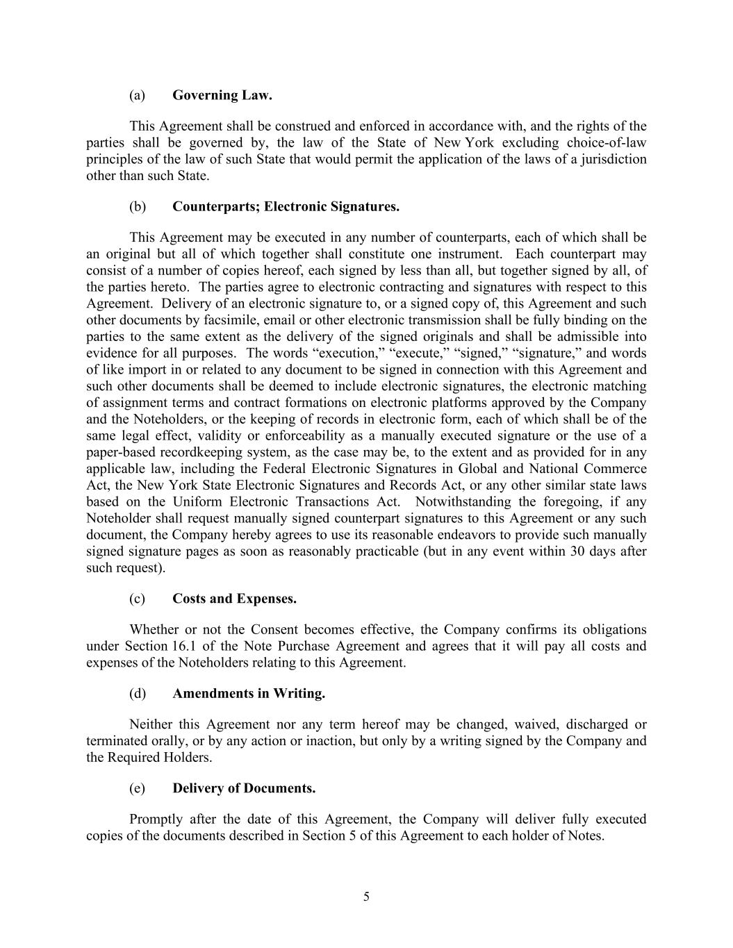 5 (a) Governing Law. This Agreement shall be construed and enforced in accordance with, and the rights of the parties shall be governed by, the law of the State of New York excluding choice-of-law principles of the law of such State that would permit the application of the laws of a jurisdiction other than such State. (b) Counterparts; Electronic Signatures. This Agreement may be executed in any number of counterparts, each of which shall be an original but all of which together shall constitute one instrument. Each counterpart may consist of a number of copies hereof, each signed by less than all, but together signed by all, of the parties hereto. The parties agree to electronic contracting and signatures with respect to this Agreement. Delivery of an electronic signature to, or a signed copy of, this Agreement and such other documents by facsimile, email or other electronic transmission shall be fully binding on the parties to the same extent as the delivery of the signed originals and shall be admissible into evidence for all purposes. The words “execution,” “execute,” “signed,” “signature,” and words of like import in or related to any document to be signed in connection with this Agreement and such other documents shall be deemed to include electronic signatures, the electronic matching of assignment terms and contract formations on electronic platforms approved by the Company and the Noteholders, or the keeping of records in electronic form, each of which shall be of the same legal effect, validity or enforceability as a manually executed signature or the use of a paper-based recordkeeping system, as the case may be, to the extent and as provided for in any applicable law, including the Federal Electronic Signatures in Global and National Commerce Act, the New York State Electronic Signatures and Records Act, or any other similar state laws based on the Uniform Electronic Transactions Act. Notwithstanding the foregoing, if any Noteholder shall request manually signed counterpart signatures to this Agreement or any such document, the Company hereby agrees to use its reasonable endeavors to provide such manually signed signature pages as soon as reasonably practicable (but in any event within 30 days after such request). (c) Costs and Expenses. Whether or not the Consent becomes effective, the Company confirms its obligations under Section 16.1 of the Note Purchase Agreement and agrees that it will pay all costs and expenses of the Noteholders relating to this Agreement. (d) Amendments in Writing. Neither this Agreement nor any term hereof may be changed, waived, discharged or terminated orally, or by any action or inaction, but only by a writing signed by the Company and the Required Holders. (e) Delivery of Documents. Promptly after the date of this Agreement, the Company will deliver fully executed copies of the documents described in Section 5 of this Agreement to each holder of Notes.