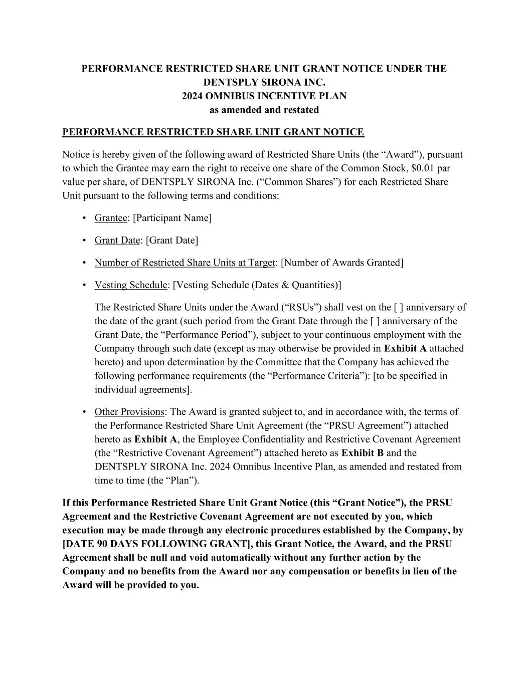 PERFORMANCE RESTRICTED SHARE UNIT GRANT NOTICE UNDER THE DENTSPLY SIRONA INC. 2024 OMNIBUS INCENTIVE PLAN as amended and restated PERFORMANCE RESTRICTED SHARE UNIT GRANT NOTICE Notice is hereby given of the following award of Restricted Share Units (the “Award”), pursuant to which the Grantee may earn the right to receive one share of the Common Stock, $0.01 par value per share, of DENTSPLY SIRONA Inc. (“Common Shares”) for each Restricted Share Unit pursuant to the following terms and conditions: • Grantee: [Participant Name] • Grant Date: [Grant Date] • Number of Restricted Share Units at Target: [Number of Awards Granted] • Vesting Schedule: [Vesting Schedule (Dates & Quantities)] The Restricted Share Units under the Award (“RSUs”) shall vest on the [ ] anniversary of the date of the grant (such period from the Grant Date through the [ ] anniversary of the Grant Date, the “Performance Period”), subject to your continuous employment with the Company through such date (except as may otherwise be provided in Exhibit A attached hereto) and upon determination by the Committee that the Company has achieved the following performance requirements (the “Performance Criteria”): [to be specified in individual agreements]. • Other Provisions: The Award is granted subject to, and in accordance with, the terms of the Performance Restricted Share Unit Agreement (the “PRSU Agreement”) attached hereto as Exhibit A, the Employee Confidentiality and Restrictive Covenant Agreement (the “Restrictive Covenant Agreement”) attached hereto as Exhibit B and the DENTSPLY SIRONA Inc. 2024 Omnibus Incentive Plan, as amended and restated from time to time (the “Plan”). If this Performance Restricted Share Unit Grant Notice (this “Grant Notice”), the PRSU Agreement and the Restrictive Covenant Agreement are not executed by you, which execution may be made through any electronic procedures established by the Company, by [DATE 90 DAYS FOLLOWING GRANT], this Grant Notice, the Award, and the PRSU Agreement shall be null and void automatically without any further action by the Company and no benefits from the Award nor any compensation or benefits in lieu of the Award will be provided to you.