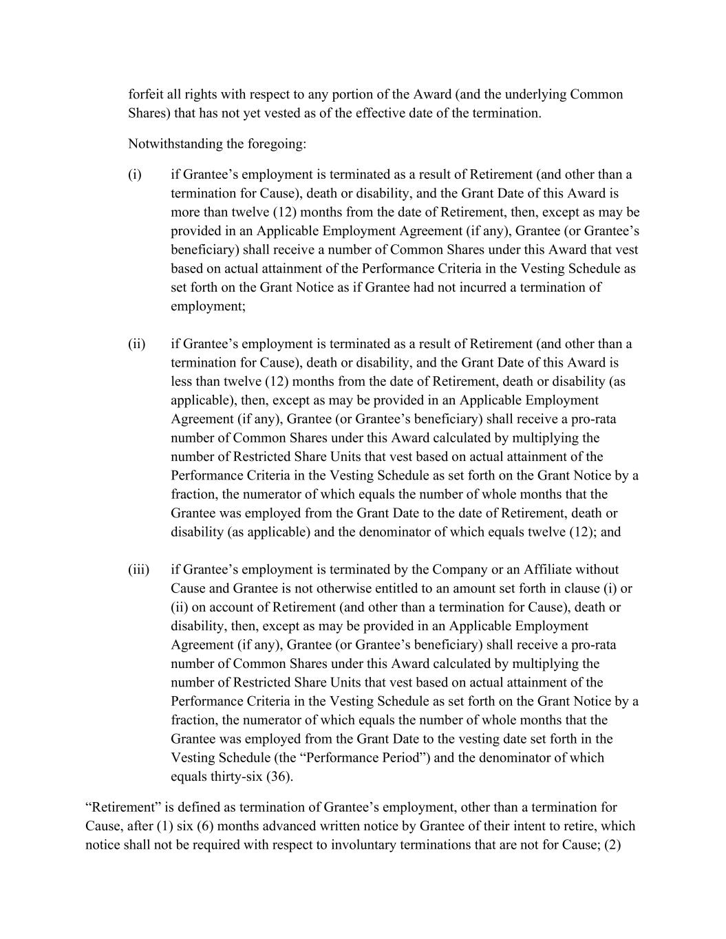 forfeit all rights with respect to any portion of the Award (and the underlying Common Shares) that has not yet vested as of the effective date of the termination. Notwithstanding the foregoing: (i) if Grantee’s employment is terminated as a result of Retirement (and other than a termination for Cause), death or disability, and the Grant Date of this Award is more than twelve (12) months from the date of Retirement, then, except as may be provided in an Applicable Employment Agreement (if any), Grantee (or Grantee’s beneficiary) shall receive a number of Common Shares under this Award that vest based on actual attainment of the Performance Criteria in the Vesting Schedule as set forth on the Grant Notice as if Grantee had not incurred a termination of employment; (ii) if Grantee’s employment is terminated as a result of Retirement (and other than a termination for Cause), death or disability, and the Grant Date of this Award is less than twelve (12) months from the date of Retirement, death or disability (as applicable), then, except as may be provided in an Applicable Employment Agreement (if any), Grantee (or Grantee’s beneficiary) shall receive a pro-rata number of Common Shares under this Award calculated by multiplying the number of Restricted Share Units that vest based on actual attainment of the Performance Criteria in the Vesting Schedule as set forth on the Grant Notice by a fraction, the numerator of which equals the number of whole months that the Grantee was employed from the Grant Date to the date of Retirement, death or disability (as applicable) and the denominator of which equals twelve (12); and (iii) if Grantee’s employment is terminated by the Company or an Affiliate without Cause and Grantee is not otherwise entitled to an amount set forth in clause (i) or (ii) on account of Retirement (and other than a termination for Cause), death or disability, then, except as may be provided in an Applicable Employment Agreement (if any), Grantee (or Grantee’s beneficiary) shall receive a pro-rata number of Common Shares under this Award calculated by multiplying the number of Restricted Share Units that vest based on actual attainment of the Performance Criteria in the Vesting Schedule as set forth on the Grant Notice by a fraction, the numerator of which equals the number of whole months that the Grantee was employed from the Grant Date to the vesting date set forth in the Vesting Schedule (the “Performance Period”) and the denominator of which equals thirty-six (36). “Retirement” is defined as termination of Grantee’s employment, other than a termination for Cause, after (1) six (6) months advanced written notice by Grantee of their intent to retire, which notice shall not be required with respect to involuntary terminations that are not for Cause; (2)