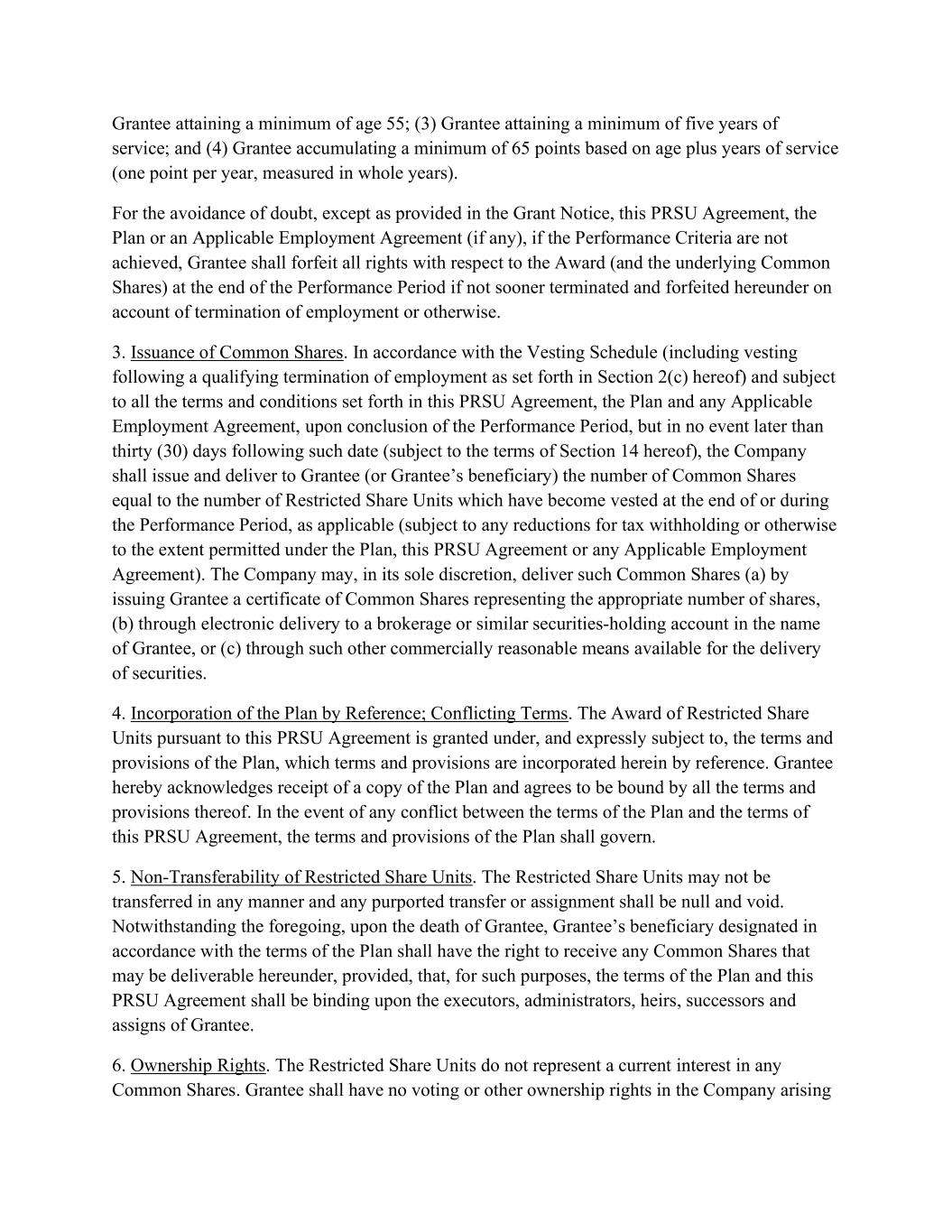 Grantee attaining a minimum of age 55; (3) Grantee attaining a minimum of five years of service; and (4) Grantee accumulating a minimum of 65 points based on age plus years of service (one point per year, measured in whole years). For the avoidance of doubt, except as provided in the Grant Notice, this PRSU Agreement, the Plan or an Applicable Employment Agreement (if any), if the Performance Criteria are not achieved, Grantee shall forfeit all rights with respect to the Award (and the underlying Common Shares) at the end of the Performance Period if not sooner terminated and forfeited hereunder on account of termination of employment or otherwise. 3. Issuance of Common Shares. In accordance with the Vesting Schedule (including vesting following a qualifying termination of employment as set forth in Section 2(c) hereof) and subject to all the terms and conditions set forth in this PRSU Agreement, the Plan and any Applicable Employment Agreement, upon conclusion of the Performance Period, but in no event later than thirty (30) days following such date (subject to the terms of Section 14 hereof), the Company shall issue and deliver to Grantee (or Grantee’s beneficiary) the number of Common Shares equal to the number of Restricted Share Units which have become vested at the end of or during the Performance Period, as applicable (subject to any reductions for tax withholding or otherwise to the extent permitted under the Plan, this PRSU Agreement or any Applicable Employment Agreement). The Company may, in its sole discretion, deliver such Common Shares (a) by issuing Grantee a certificate of Common Shares representing the appropriate number of shares, (b) through electronic delivery to a brokerage or similar securities-holding account in the name of Grantee, or (c) through such other commercially reasonable means available for the delivery of securities. 4. Incorporation of the Plan by Reference; Conflicting Terms. The Award of Restricted Share Units pursuant to this PRSU Agreement is granted under, and expressly subject to, the terms and provisions of the Plan, which terms and provisions are incorporated herein by reference. Grantee hereby acknowledges receipt of a copy of the Plan and agrees to be bound by all the terms and provisions thereof. In the event of any conflict between the terms of the Plan and the terms of this PRSU Agreement, the terms and provisions of the Plan shall govern. 5. Non-Transferability of Restricted Share Units. The Restricted Share Units may not be transferred in any manner and any purported transfer or assignment shall be null and void. Notwithstanding the foregoing, upon the death of Grantee, Grantee’s beneficiary designated in accordance with the terms of the Plan shall have the right to receive any Common Shares that may be deliverable hereunder, provided, that, for such purposes, the terms of the Plan and this PRSU Agreement shall be binding upon the executors, administrators, heirs, successors and assigns of Grantee. 6. Ownership Rights. The Restricted Share Units do not represent a current interest in any Common Shares. Grantee shall have no voting or other ownership rights in the Company arising