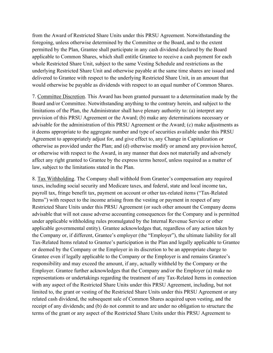 from the Award of Restricted Share Units under this PRSU Agreement. Notwithstanding the foregoing, unless otherwise determined by the Committee or the Board, and to the extent permitted by the Plan, Grantee shall participate in any cash dividend declared by the Board applicable to Common Shares, which shall entitle Grantee to receive a cash payment for each whole Restricted Share Unit, subject to the same Vesting Schedule and restrictions as the underlying Restricted Share Unit and otherwise payable at the same time shares are issued and delivered to Grantee with respect to the underlying Restricted Share Unit, in an amount that would otherwise be payable as dividends with respect to an equal number of Common Shares. 7. Committee Discretion. This Award has been granted pursuant to a determination made by the Board and/or Committee. Notwithstanding anything to the contrary herein, and subject to the limitations of the Plan, the Administrator shall have plenary authority to: (a) interpret any provision of this PRSU Agreement or the Award; (b) make any determinations necessary or advisable for the administration of this PRSU Agreement or the Award; (c) make adjustments as it deems appropriate to the aggregate number and type of securities available under this PRSU Agreement to appropriately adjust for, and give effect to, any Change in Capitalization or otherwise as provided under the Plan; and (d) otherwise modify or amend any provision hereof, or otherwise with respect to the Award, in any manner that does not materially and adversely affect any right granted to Grantee by the express terms hereof, unless required as a matter of law, subject to the limitations stated in the Plan. 8. Tax Withholding. The Company shall withhold from Grantee’s compensation any required taxes, including social security and Medicare taxes, and federal, state and local income tax, payroll tax, fringe benefit tax, payment on account or other tax-related items (“Tax-Related Items”) with respect to the income arising from the vesting or payment in respect of any Restricted Share Units under this PRSU Agreement (or such other amount the Company deems advisable that will not cause adverse accounting consequences for the Company and is permitted under applicable withholding rules promulgated by the Internal Revenue Service or other applicable governmental entity). Grantee acknowledges that, regardless of any action taken by the Company or, if different, Grantee’s employer (the “Employer”), the ultimate liability for all Tax-Related Items related to Grantee’s participation in the Plan and legally applicable to Grantee or deemed by the Company or the Employer in its discretion to be an appropriate charge to Grantee even if legally applicable to the Company or the Employer is and remains Grantee’s responsibility and may exceed the amount, if any, actually withheld by the Company or the Employer. Grantee further acknowledges that the Company and/or the Employer (a) make no representations or undertakings regarding the treatment of any Tax-Related Items in connection with any aspect of the Restricted Share Units under this PRSU Agreement, including, but not limited to, the grant or vesting of the Restricted Share Units under this PRSU Agreement or any related cash dividend, the subsequent sale of Common Shares acquired upon vesting, and the receipt of any dividends; and (b) do not commit to and are under no obligation to structure the terms of the grant or any aspect of the Restricted Share Units under this PRSU Agreement to