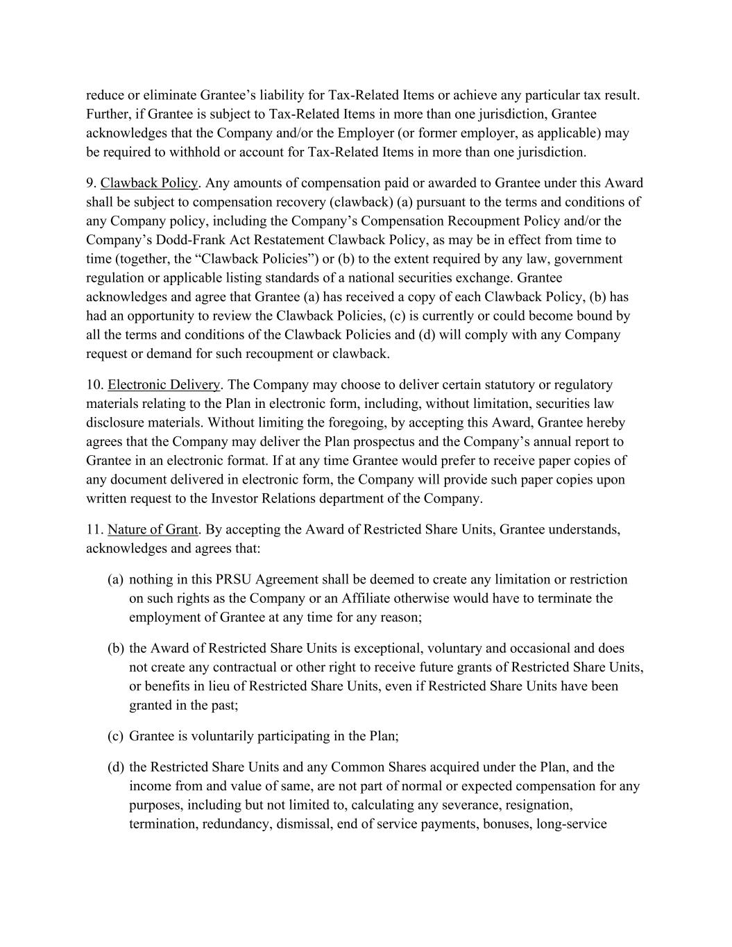 reduce or eliminate Grantee’s liability for Tax-Related Items or achieve any particular tax result. Further, if Grantee is subject to Tax-Related Items in more than one jurisdiction, Grantee acknowledges that the Company and/or the Employer (or former employer, as applicable) may be required to withhold or account for Tax-Related Items in more than one jurisdiction. 9. Clawback Policy. Any amounts of compensation paid or awarded to Grantee under this Award shall be subject to compensation recovery (clawback) (a) pursuant to the terms and conditions of any Company policy, including the Company’s Compensation Recoupment Policy and/or the Company’s Dodd-Frank Act Restatement Clawback Policy, as may be in effect from time to time (together, the “Clawback Policies”) or (b) to the extent required by any law, government regulation or applicable listing standards of a national securities exchange. Grantee acknowledges and agree that Grantee (a) has received a copy of each Clawback Policy, (b) has had an opportunity to review the Clawback Policies, (c) is currently or could become bound by all the terms and conditions of the Clawback Policies and (d) will comply with any Company request or demand for such recoupment or clawback. 10. Electronic Delivery. The Company may choose to deliver certain statutory or regulatory materials relating to the Plan in electronic form, including, without limitation, securities law disclosure materials. Without limiting the foregoing, by accepting this Award, Grantee hereby agrees that the Company may deliver the Plan prospectus and the Company’s annual report to Grantee in an electronic format. If at any time Grantee would prefer to receive paper copies of any document delivered in electronic form, the Company will provide such paper copies upon written request to the Investor Relations department of the Company. 11. Nature of Grant. By accepting the Award of Restricted Share Units, Grantee understands, acknowledges and agrees that: (a) nothing in this PRSU Agreement shall be deemed to create any limitation or restriction on such rights as the Company or an Affiliate otherwise would have to terminate the employment of Grantee at any time for any reason; (b) the Award of Restricted Share Units is exceptional, voluntary and occasional and does not create any contractual or other right to receive future grants of Restricted Share Units, or benefits in lieu of Restricted Share Units, even if Restricted Share Units have been granted in the past; (c) Grantee is voluntarily participating in the Plan; (d) the Restricted Share Units and any Common Shares acquired under the Plan, and the income from and value of same, are not part of normal or expected compensation for any purposes, including but not limited to, calculating any severance, resignation, termination, redundancy, dismissal, end of service payments, bonuses, long-service