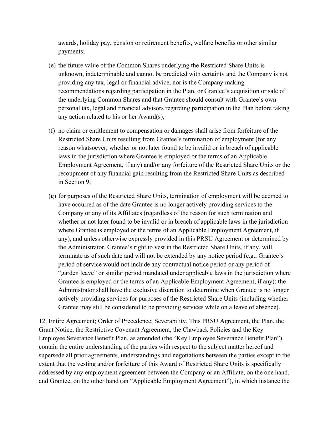 awards, holiday pay, pension or retirement benefits, welfare benefits or other similar payments; (e) the future value of the Common Shares underlying the Restricted Share Units is unknown, indeterminable and cannot be predicted with certainty and the Company is not providing any tax, legal or financial advice, nor is the Company making recommendations regarding participation in the Plan, or Grantee’s acquisition or sale of the underlying Common Shares and that Grantee should consult with Grantee’s own personal tax, legal and financial advisors regarding participation in the Plan before taking any action related to his or her Award(s); (f) no claim or entitlement to compensation or damages shall arise from forfeiture of the Restricted Share Units resulting from Grantee’s termination of employment (for any reason whatsoever, whether or not later found to be invalid or in breach of applicable laws in the jurisdiction where Grantee is employed or the terms of an Applicable Employment Agreement, if any) and/or any forfeiture of the Restricted Share Units or the recoupment of any financial gain resulting from the Restricted Share Units as described in Section 9; (g) for purposes of the Restricted Share Units, termination of employment will be deemed to have occurred as of the date Grantee is no longer actively providing services to the Company or any of its Affiliates (regardless of the reason for such termination and whether or not later found to be invalid or in breach of applicable laws in the jurisdiction where Grantee is employed or the terms of an Applicable Employment Agreement, if any), and unless otherwise expressly provided in this PRSU Agreement or determined by the Administrator, Grantee’s right to vest in the Restricted Share Units, if any, will terminate as of such date and will not be extended by any notice period (e.g., Grantee’s period of service would not include any contractual notice period or any period of “garden leave” or similar period mandated under applicable laws in the jurisdiction where Grantee is employed or the terms of an Applicable Employment Agreement, if any); the Administrator shall have the exclusive discretion to determine when Grantee is no longer actively providing services for purposes of the Restricted Share Units (including whether Grantee may still be considered to be providing services while on a leave of absence). 12. Entire Agreement; Order of Precedence; Severability. This PRSU Agreement, the Plan, the Grant Notice, the Restrictive Covenant Agreement, the Clawback Policies and the Key Employee Severance Benefit Plan, as amended (the “Key Employee Severance Benefit Plan”) contain the entire understanding of the parties with respect to the subject matter hereof and supersede all prior agreements, understandings and negotiations between the parties except to the extent that the vesting and/or forfeiture of this Award of Restricted Share Units is specifically addressed by any employment agreement between the Company or an Affiliate, on the one hand, and Grantee, on the other hand (an “Applicable Employment Agreement”), in which instance the