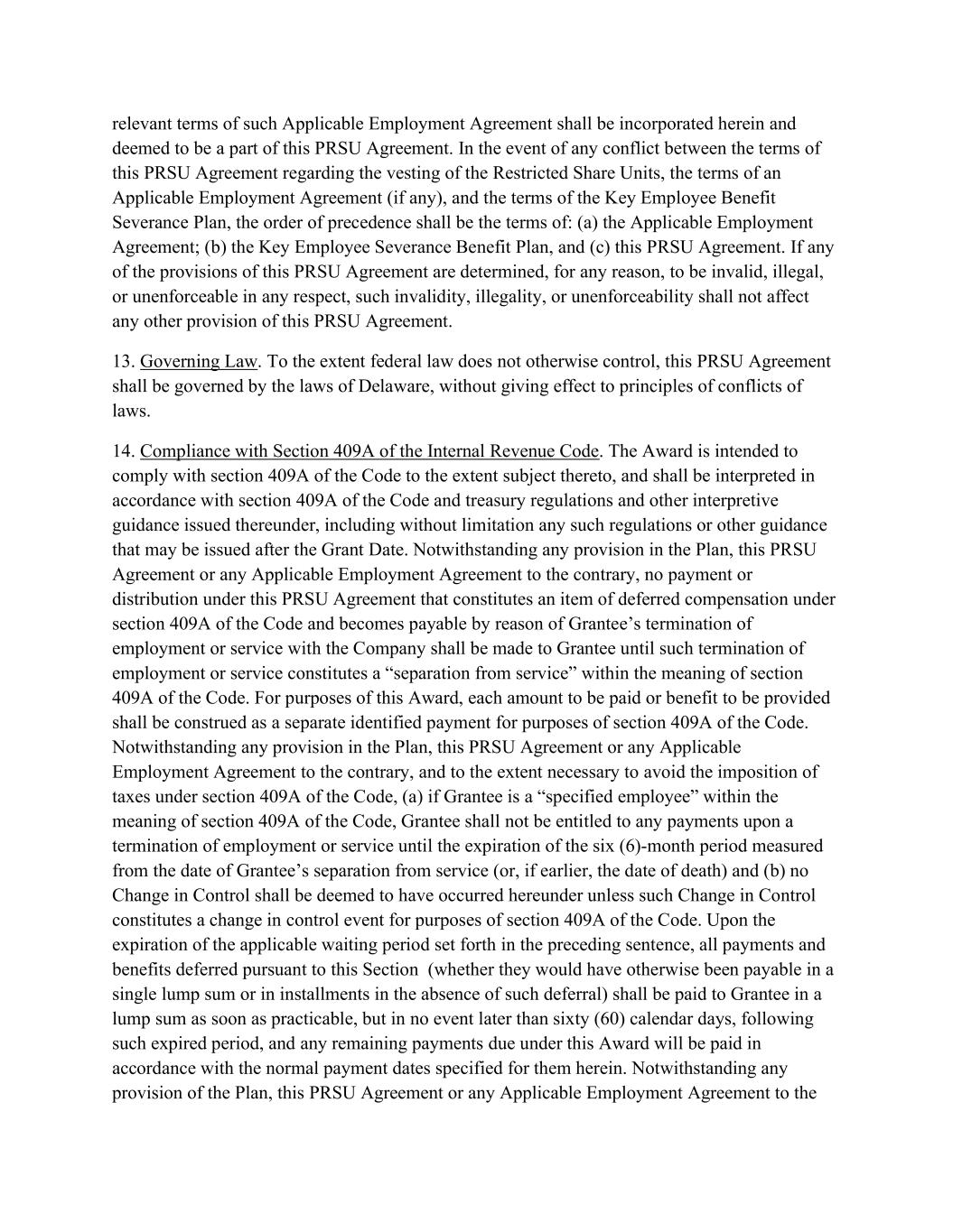 relevant terms of such Applicable Employment Agreement shall be incorporated herein and deemed to be a part of this PRSU Agreement. In the event of any conflict between the terms of this PRSU Agreement regarding the vesting of the Restricted Share Units, the terms of an Applicable Employment Agreement (if any), and the terms of the Key Employee Benefit Severance Plan, the order of precedence shall be the terms of: (a) the Applicable Employment Agreement; (b) the Key Employee Severance Benefit Plan, and (c) this PRSU Agreement. If any of the provisions of this PRSU Agreement are determined, for any reason, to be invalid, illegal, or unenforceable in any respect, such invalidity, illegality, or unenforceability shall not affect any other provision of this PRSU Agreement. 13. Governing Law. To the extent federal law does not otherwise control, this PRSU Agreement shall be governed by the laws of Delaware, without giving effect to principles of conflicts of laws. 14. Compliance with Section 409A of the Internal Revenue Code. The Award is intended to comply with section 409A of the Code to the extent subject thereto, and shall be interpreted in accordance with section 409A of the Code and treasury regulations and other interpretive guidance issued thereunder, including without limitation any such regulations or other guidance that may be issued after the Grant Date. Notwithstanding any provision in the Plan, this PRSU Agreement or any Applicable Employment Agreement to the contrary, no payment or distribution under this PRSU Agreement that constitutes an item of deferred compensation under section 409A of the Code and becomes payable by reason of Grantee’s termination of employment or service with the Company shall be made to Grantee until such termination of employment or service constitutes a “separation from service” within the meaning of section 409A of the Code. For purposes of this Award, each amount to be paid or benefit to be provided shall be construed as a separate identified payment for purposes of section 409A of the Code. Notwithstanding any provision in the Plan, this PRSU Agreement or any Applicable Employment Agreement to the contrary, and to the extent necessary to avoid the imposition of taxes under section 409A of the Code, (a) if Grantee is a “specified employee” within the meaning of section 409A of the Code, Grantee shall not be entitled to any payments upon a termination of employment or service until the expiration of the six (6)-month period measured from the date of Grantee’s separation from service (or, if earlier, the date of death) and (b) no Change in Control shall be deemed to have occurred hereunder unless such Change in Control constitutes a change in control event for purposes of section 409A of the Code. Upon the expiration of the applicable waiting period set forth in the preceding sentence, all payments and benefits deferred pursuant to this Section (whether they would have otherwise been payable in a single lump sum or in installments in the absence of such deferral) shall be paid to Grantee in a lump sum as soon as practicable, but in no event later than sixty (60) calendar days, following such expired period, and any remaining payments due under this Award will be paid in accordance with the normal payment dates specified for them herein. Notwithstanding any provision of the Plan, this PRSU Agreement or any Applicable Employment Agreement to the