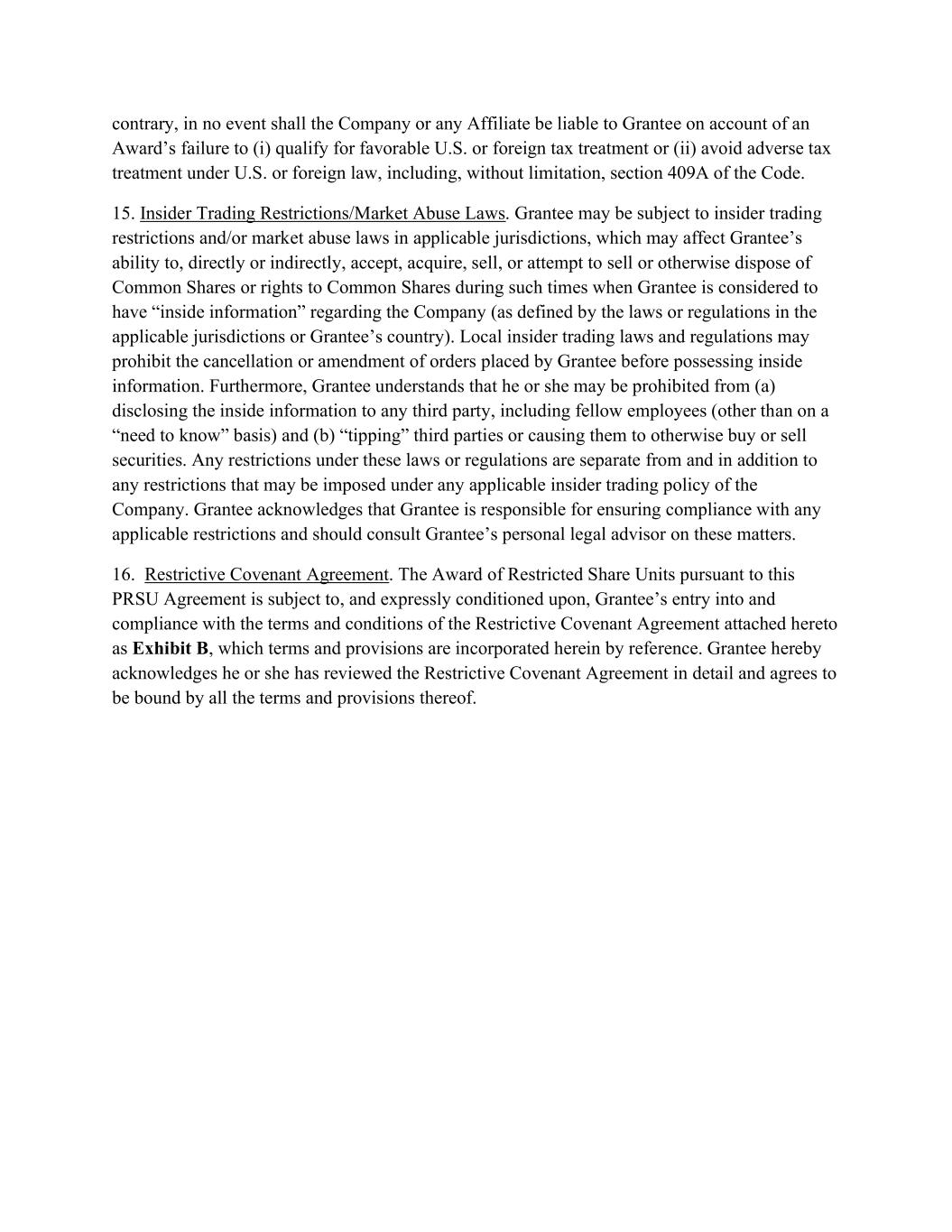 contrary, in no event shall the Company or any Affiliate be liable to Grantee on account of an Award’s failure to (i) qualify for favorable U.S. or foreign tax treatment or (ii) avoid adverse tax treatment under U.S. or foreign law, including, without limitation, section 409A of the Code. 15. Insider Trading Restrictions/Market Abuse Laws. Grantee may be subject to insider trading restrictions and/or market abuse laws in applicable jurisdictions, which may affect Grantee’s ability to, directly or indirectly, accept, acquire, sell, or attempt to sell or otherwise dispose of Common Shares or rights to Common Shares during such times when Grantee is considered to have “inside information” regarding the Company (as defined by the laws or regulations in the applicable jurisdictions or Grantee’s country). Local insider trading laws and regulations may prohibit the cancellation or amendment of orders placed by Grantee before possessing inside information. Furthermore, Grantee understands that he or she may be prohibited from (a) disclosing the inside information to any third party, including fellow employees (other than on a “need to know” basis) and (b) “tipping” third parties or causing them to otherwise buy or sell securities. Any restrictions under these laws or regulations are separate from and in addition to any restrictions that may be imposed under any applicable insider trading policy of the Company. Grantee acknowledges that Grantee is responsible for ensuring compliance with any applicable restrictions and should consult Grantee’s personal legal advisor on these matters. 16. Restrictive Covenant Agreement. The Award of Restricted Share Units pursuant to this PRSU Agreement is subject to, and expressly conditioned upon, Grantee’s entry into and compliance with the terms and conditions of the Restrictive Covenant Agreement attached hereto as Exhibit B, which terms and provisions are incorporated herein by reference. Grantee hereby acknowledges he or she has reviewed the Restrictive Covenant Agreement in detail and agrees to be bound by all the terms and provisions thereof.