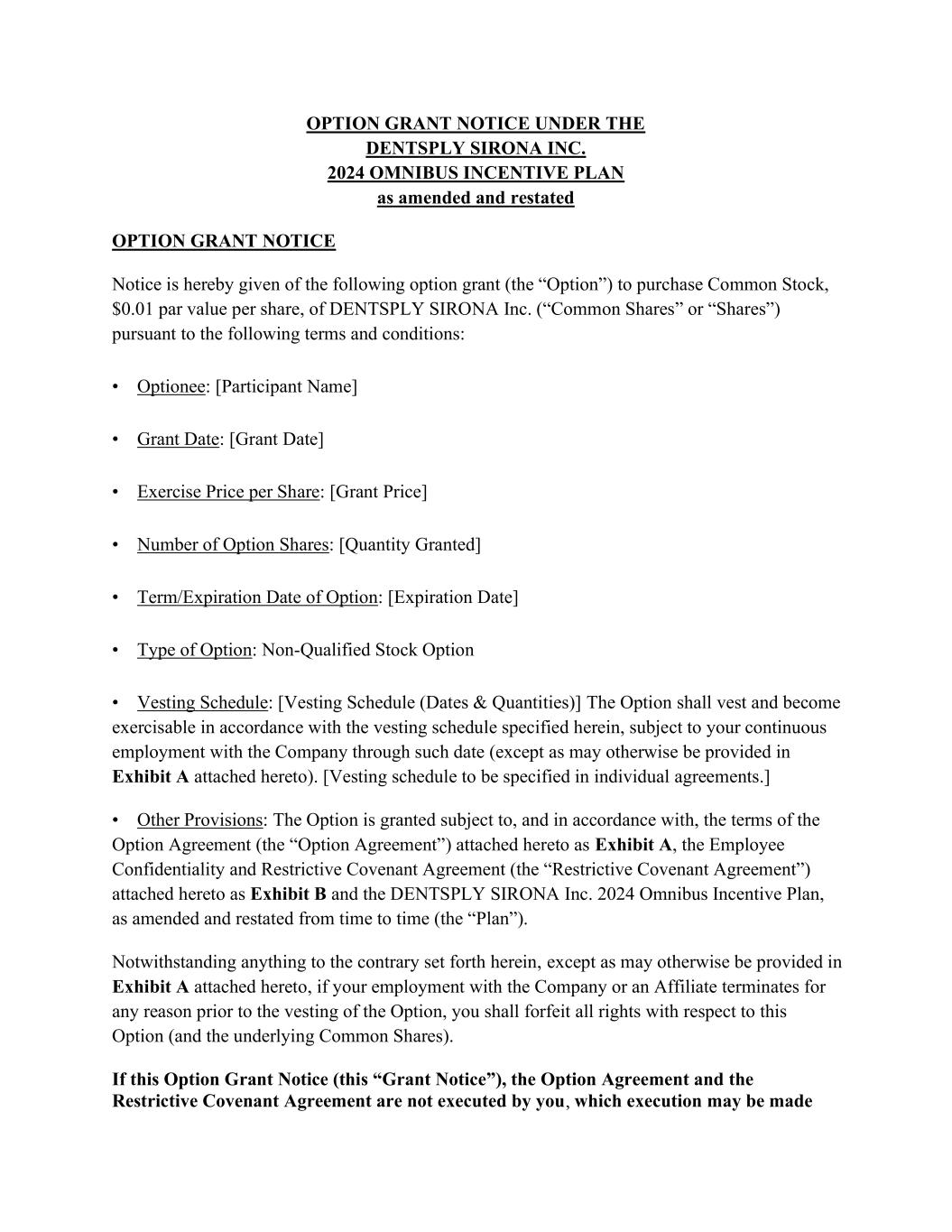OPTION GRANT NOTICE UNDER THE DENTSPLY SIRONA INC. 2024 OMNIBUS INCENTIVE PLAN as amended and restated OPTION GRANT NOTICE Notice is hereby given of the following option grant (the “Option”) to purchase Common Stock, $0.01 par value per share, of DENTSPLY SIRONA Inc. (“Common Shares” or “Shares”) pursuant to the following terms and conditions: • Optionee: [Participant Name] • Grant Date: [Grant Date] • Exercise Price per Share: [Grant Price] • Number of Option Shares: [Quantity Granted] • Term/Expiration Date of Option: [Expiration Date] • Type of Option: Non-Qualified Stock Option • Vesting Schedule: [Vesting Schedule (Dates & Quantities)] The Option shall vest and become exercisable in accordance with the vesting schedule specified herein, subject to your continuous employment with the Company through such date (except as may otherwise be provided in Exhibit A attached hereto). [Vesting schedule to be specified in individual agreements.] • Other Provisions: The Option is granted subject to, and in accordance with, the terms of the Option Agreement (the “Option Agreement”) attached hereto as Exhibit A, the Employee Confidentiality and Restrictive Covenant Agreement (the “Restrictive Covenant Agreement”) attached hereto as Exhibit B and the DENTSPLY SIRONA Inc. 2024 Omnibus Incentive Plan, as amended and restated from time to time (the “Plan”). Notwithstanding anything to the contrary set forth herein, except as may otherwise be provided in Exhibit A attached hereto, if your employment with the Company or an Affiliate terminates for any reason prior to the vesting of the Option, you shall forfeit all rights with respect to this Option (and the underlying Common Shares). If this Option Grant Notice (this “Grant Notice”), the Option Agreement and the Restrictive Covenant Agreement are not executed by you, which execution may be made