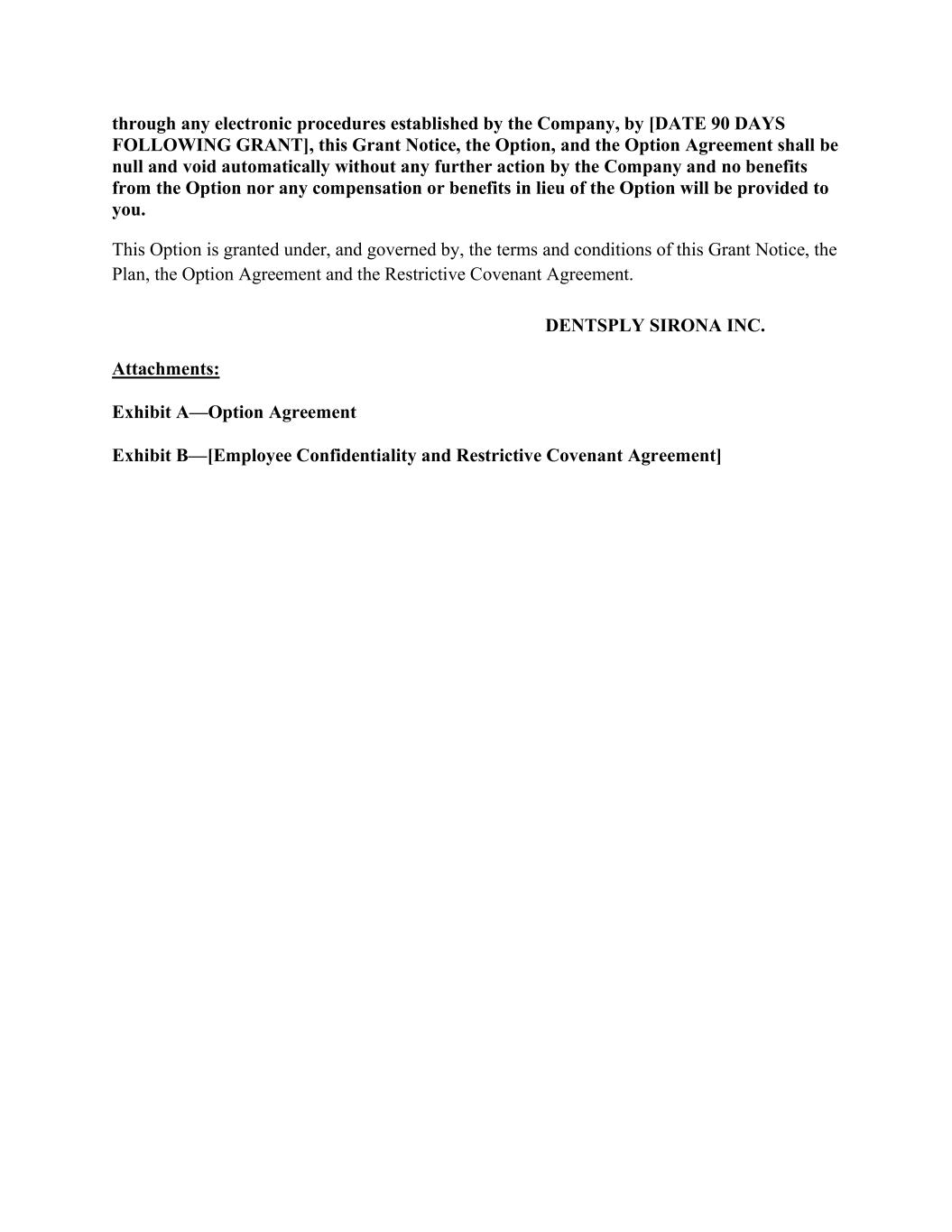 through any electronic procedures established by the Company, by [DATE 90 DAYS FOLLOWING GRANT], this Grant Notice, the Option, and the Option Agreement shall be null and void automatically without any further action by the Company and no benefits from the Option nor any compensation or benefits in lieu of the Option will be provided to you. This Option is granted under, and governed by, the terms and conditions of this Grant Notice, the Plan, the Option Agreement and the Restrictive Covenant Agreement. DENTSPLY SIRONA INC. Attachments: Exhibit A—Option Agreement Exhibit B—[Employee Confidentiality and Restrictive Covenant Agreement]
