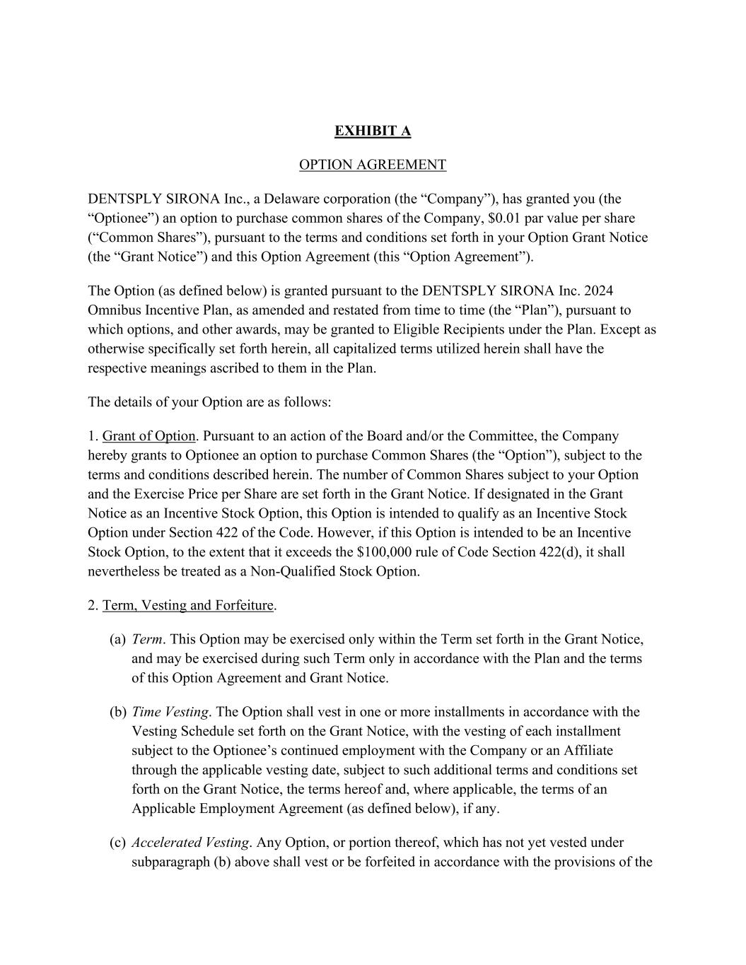 EXHIBIT A OPTION AGREEMENT DENTSPLY SIRONA Inc., a Delaware corporation (the “Company”), has granted you (the “Optionee”) an option to purchase common shares of the Company, $0.01 par value per share (“Common Shares”), pursuant to the terms and conditions set forth in your Option Grant Notice (the “Grant Notice”) and this Option Agreement (this “Option Agreement”). The Option (as defined below) is granted pursuant to the DENTSPLY SIRONA Inc. 2024 Omnibus Incentive Plan, as amended and restated from time to time (the “Plan”), pursuant to which options, and other awards, may be granted to Eligible Recipients under the Plan. Except as otherwise specifically set forth herein, all capitalized terms utilized herein shall have the respective meanings ascribed to them in the Plan. The details of your Option are as follows: 1. Grant of Option. Pursuant to an action of the Board and/or the Committee, the Company hereby grants to Optionee an option to purchase Common Shares (the “Option”), subject to the terms and conditions described herein. The number of Common Shares subject to your Option and the Exercise Price per Share are set forth in the Grant Notice. If designated in the Grant Notice as an Incentive Stock Option, this Option is intended to qualify as an Incentive Stock Option under Section 422 of the Code. However, if this Option is intended to be an Incentive Stock Option, to the extent that it exceeds the $100,000 rule of Code Section 422(d), it shall nevertheless be treated as a Non-Qualified Stock Option. 2. Term, Vesting and Forfeiture. (a) Term. This Option may be exercised only within the Term set forth in the Grant Notice, and may be exercised during such Term only in accordance with the Plan and the terms of this Option Agreement and Grant Notice. (b) Time Vesting. The Option shall vest in one or more installments in accordance with the Vesting Schedule set forth on the Grant Notice, with the vesting of each installment subject to the Optionee’s continued employment with the Company or an Affiliate through the applicable vesting date, subject to such additional terms and conditions set forth on the Grant Notice, the terms hereof and, where applicable, the terms of an Applicable Employment Agreement (as defined below), if any. (c) Accelerated Vesting. Any Option, or portion thereof, which has not yet vested under subparagraph (b) above shall vest or be forfeited in accordance with the provisions of the